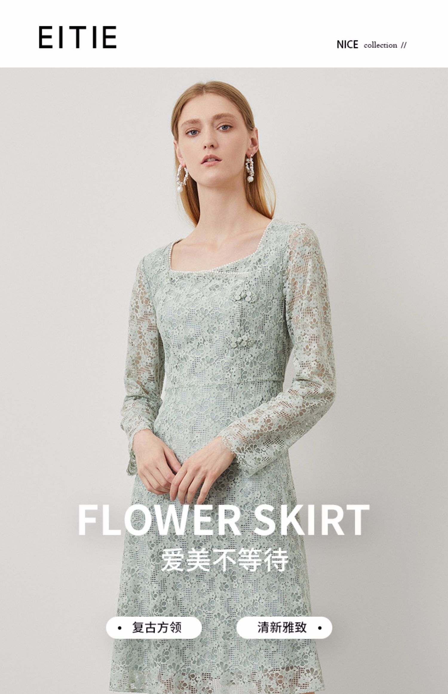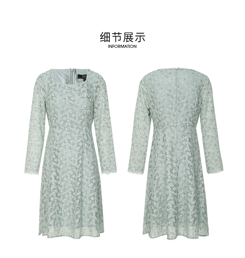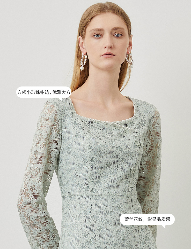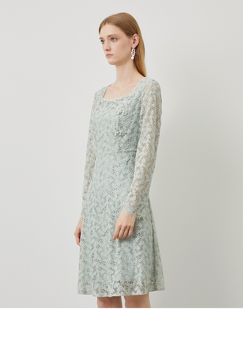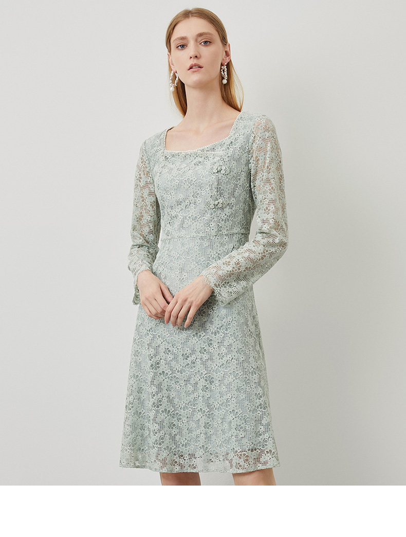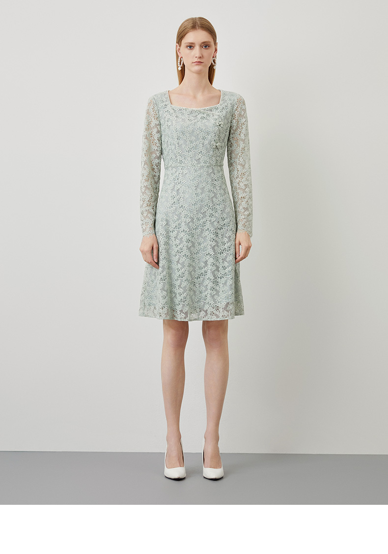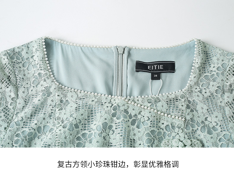 EITIE爱特爱秋季新款温柔气质方领收腰a字中裙绣花蕾丝连衣裙C2207034