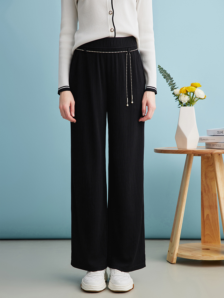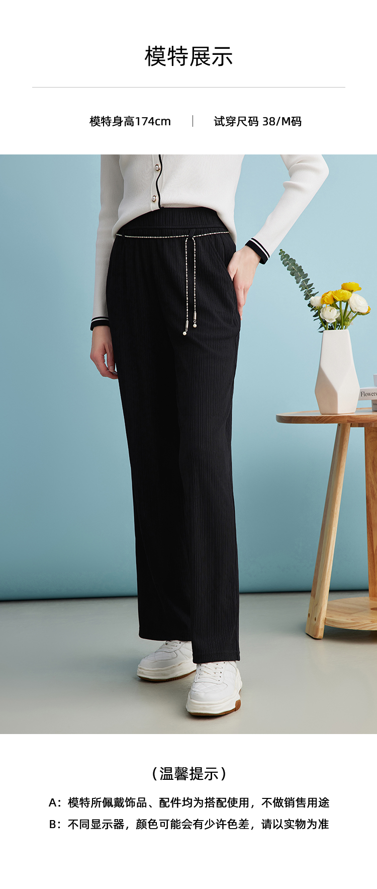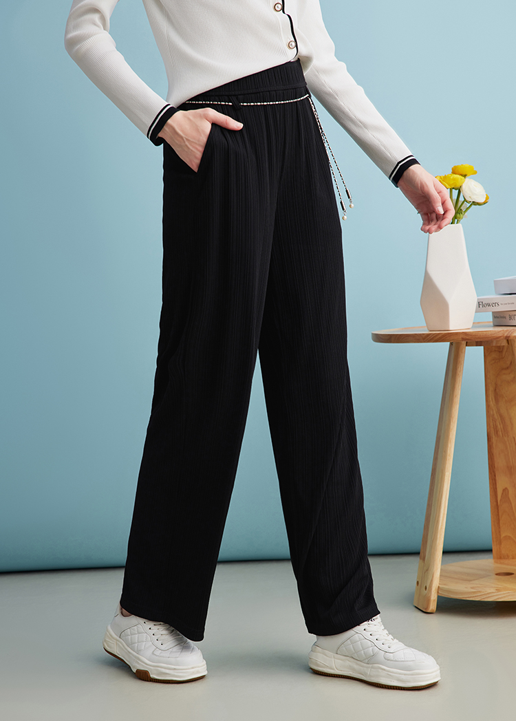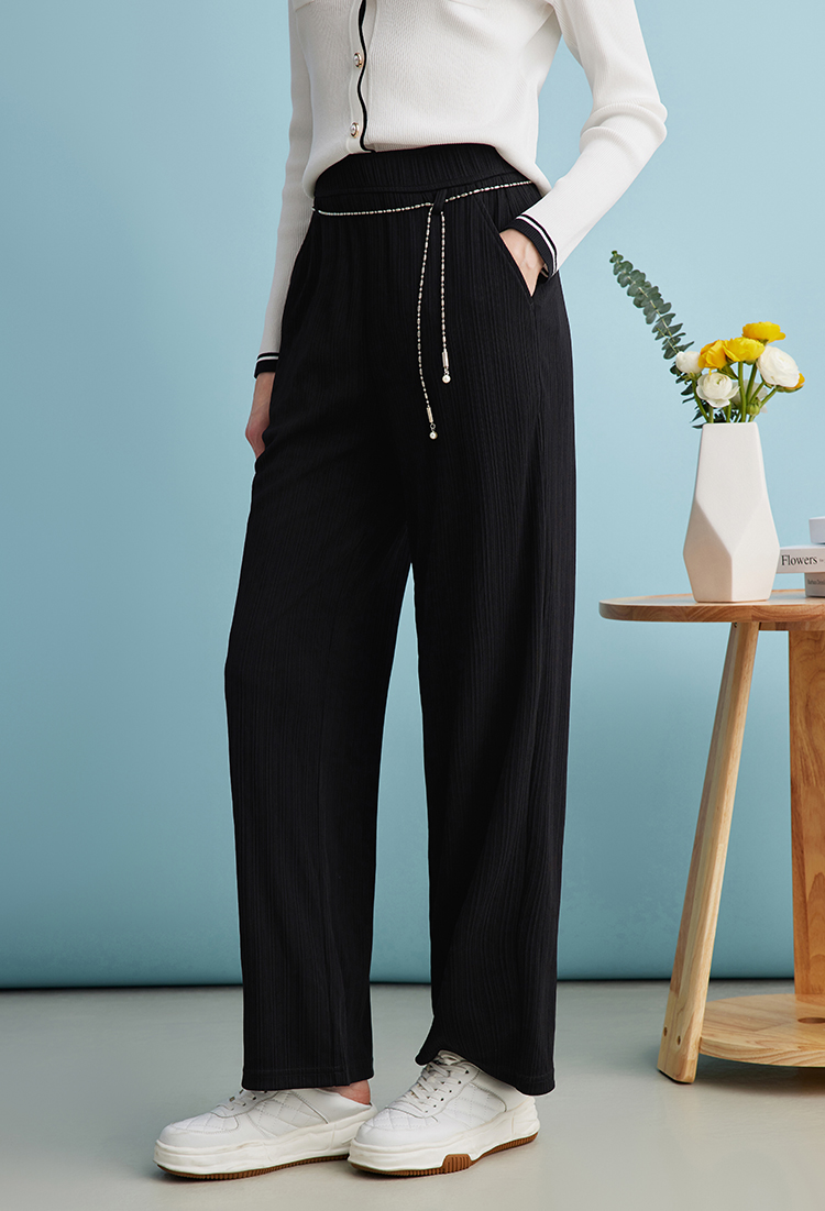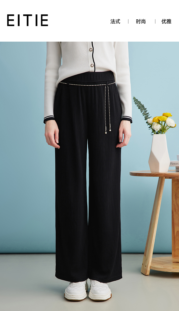 EITIE爱特爱通勤高腰显瘦直筒垂坠黑色松紧腰长裤24夏季新款B2405306