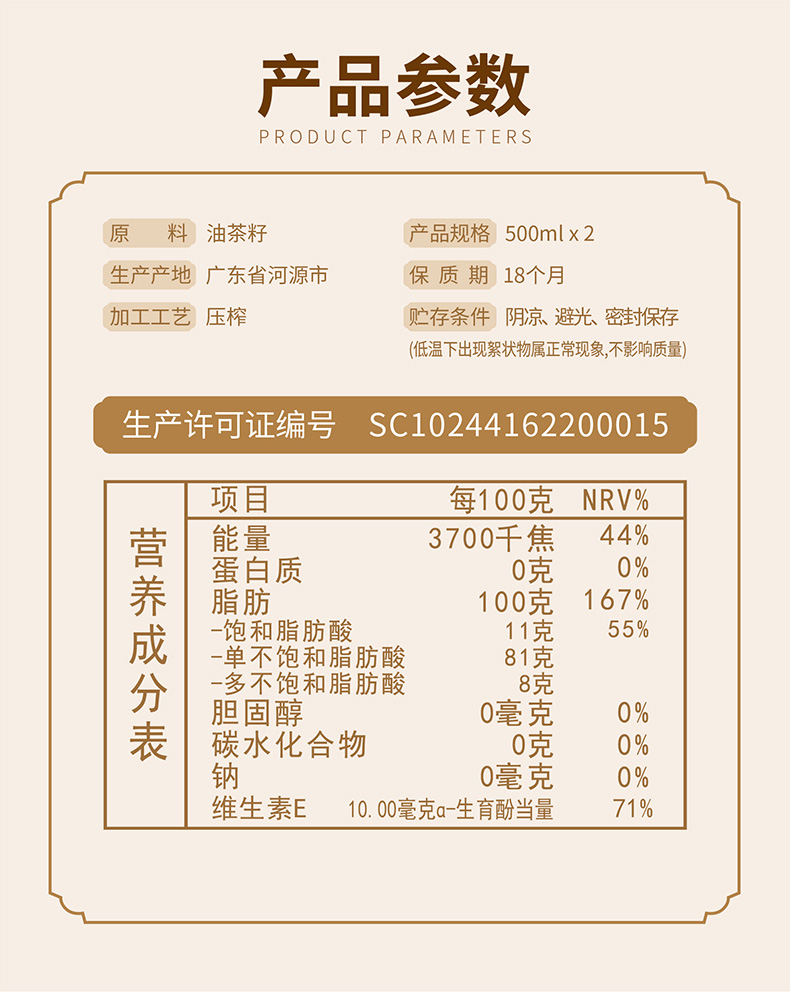 绿油老树茶油 物理压榨原香型500ml*2瓶