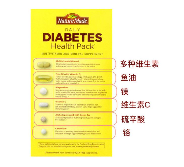 含复合维生素和矿物质,为糖尿病患者提供所必须的各种维生素及矿物质。