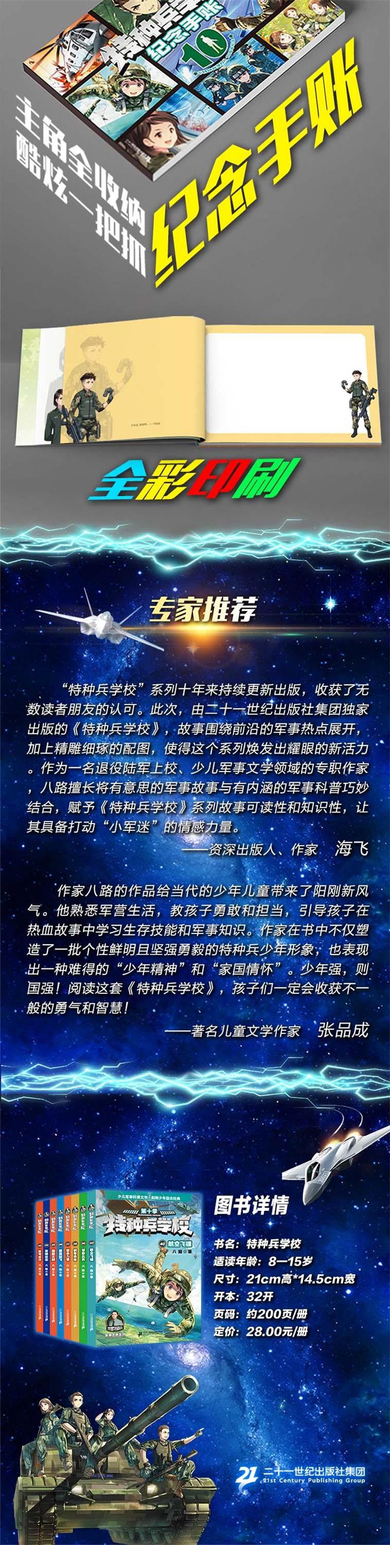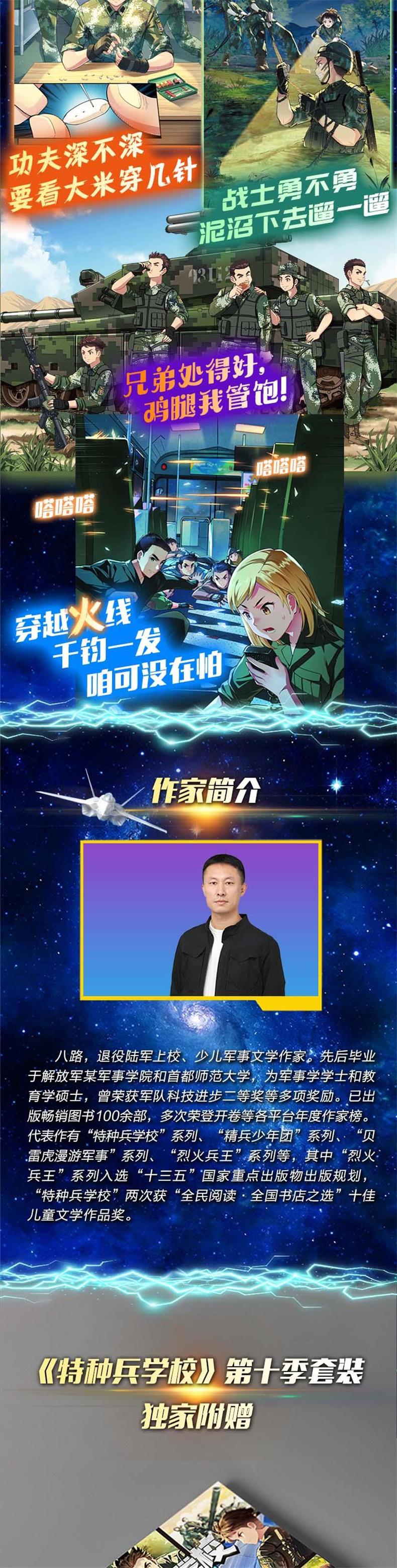 作家八路以生动诙谐的笔触,将扣人心弦的军营故事与先进权威的军事知识结合起来,塑造出一批批个性鲜明、英勇无畏的特种兵少年形象,也延续着“讲述军事知识、传授生存技能、树立阳刚品质”的创作宗旨,让青少年读者在趣味阅读中接受爱国主义教育的熏陶,同时认识到国防建设的重要性。