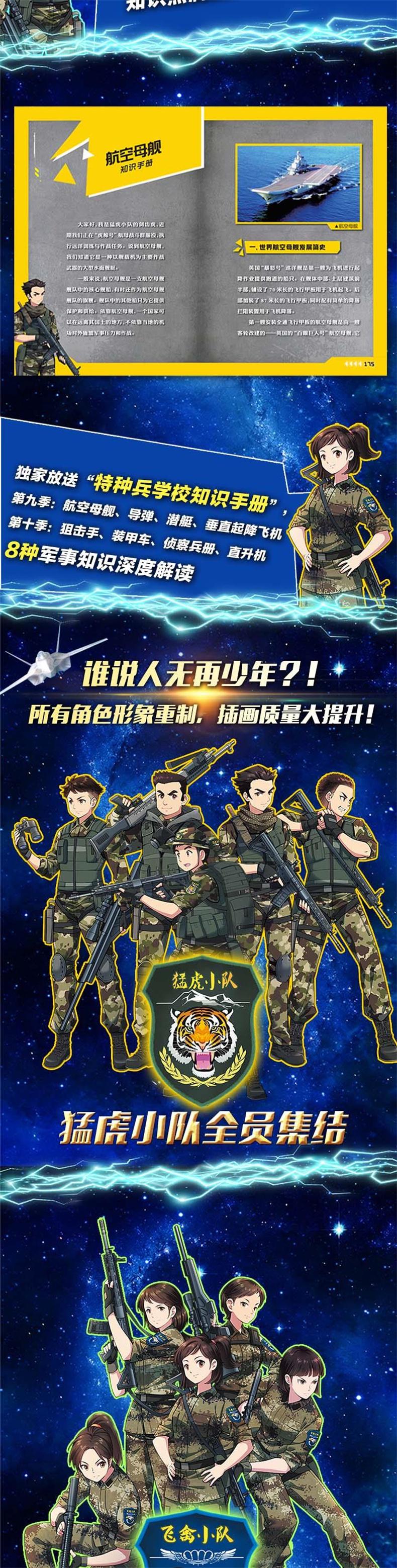 《特种兵学校》系列是一套畅销千万册的少儿军事科普小说。第十季的主题为“军事大赛”,以国际军事大赛为故事背景,分为《狙击力量》《战车突击》《侦察尖兵》《航空飞镖》四个故事,展现了大国军事力量、军人的阳刚品质和团队合作精神。