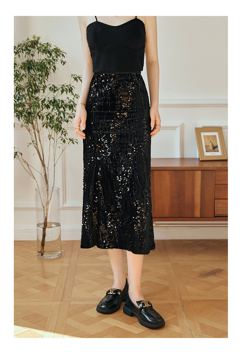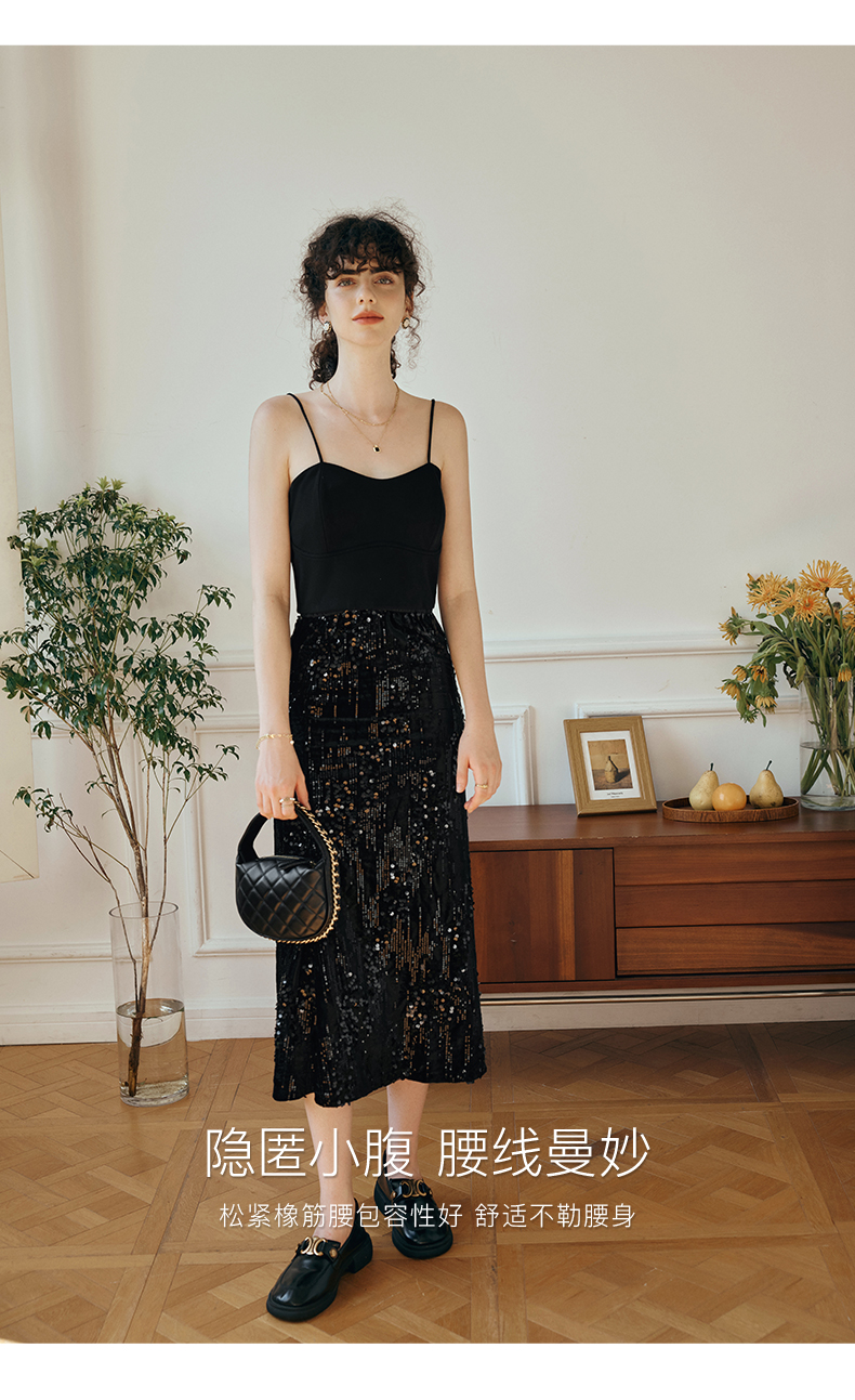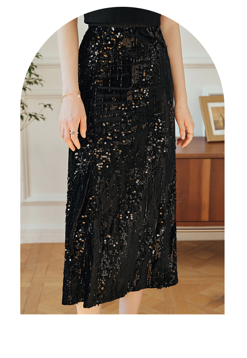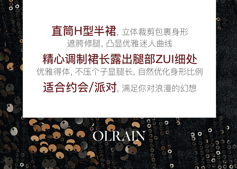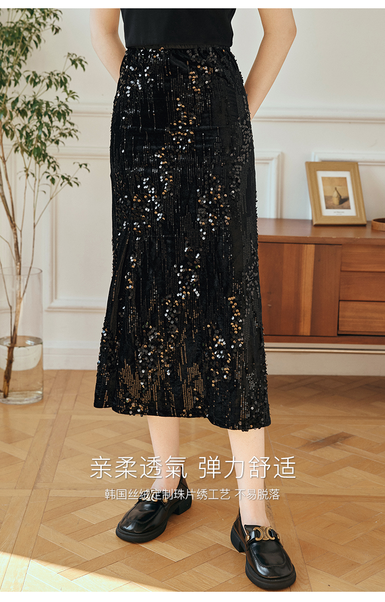 OLrain欧芮儿黑色丝绒半身裙女初秋2023新款高腰时尚珠片绣铅笔裙
