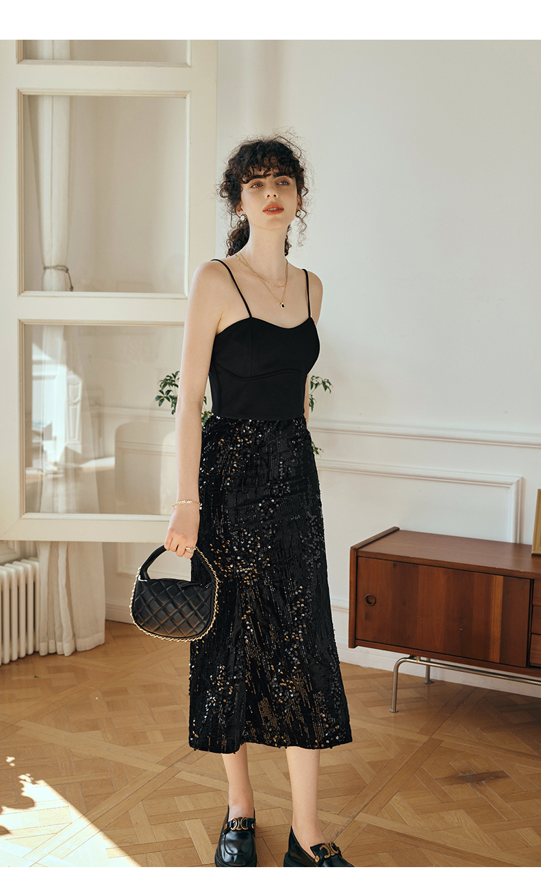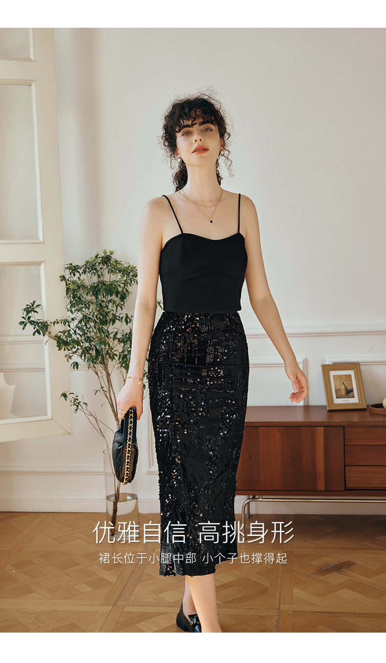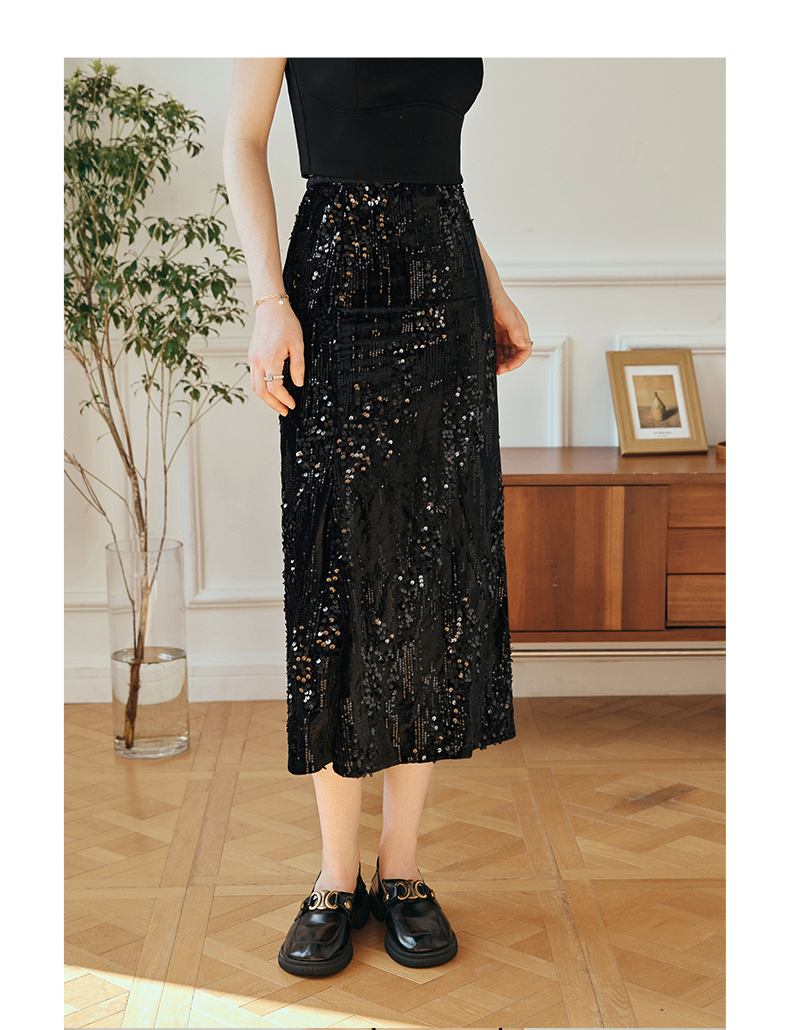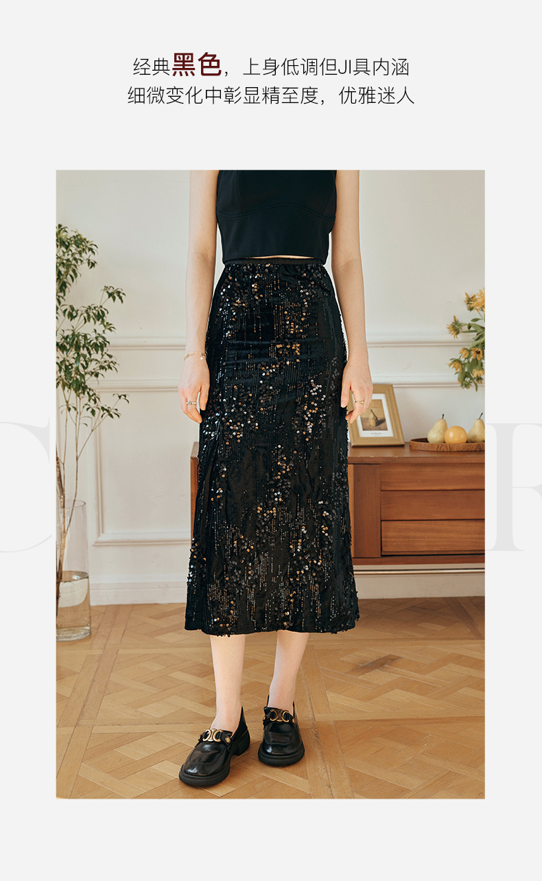 OLrain欧芮儿黑色丝绒半身裙女初秋2023新款高腰时尚珠片绣铅笔裙