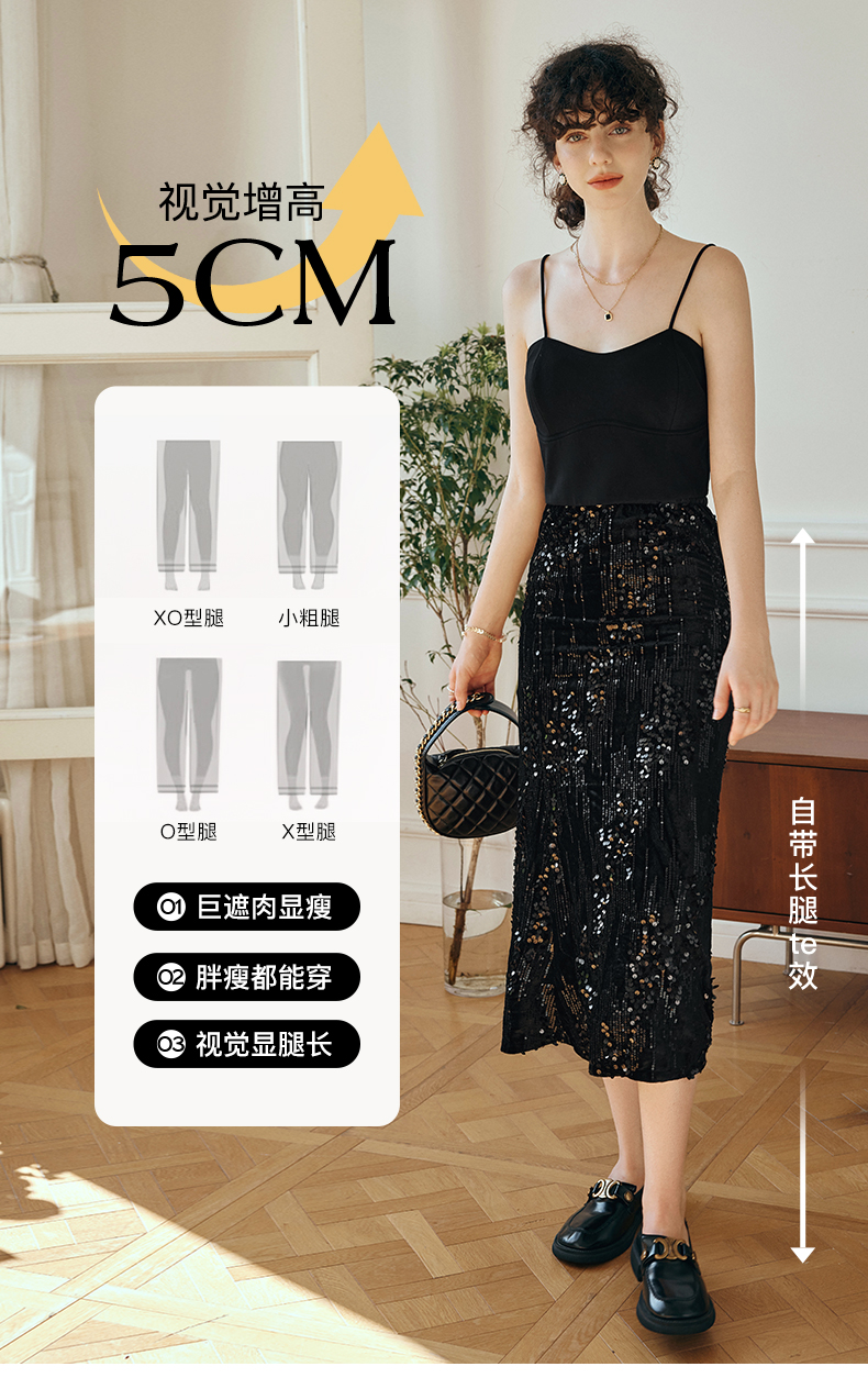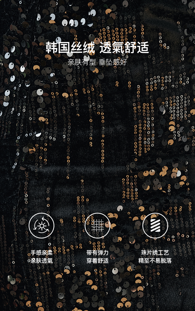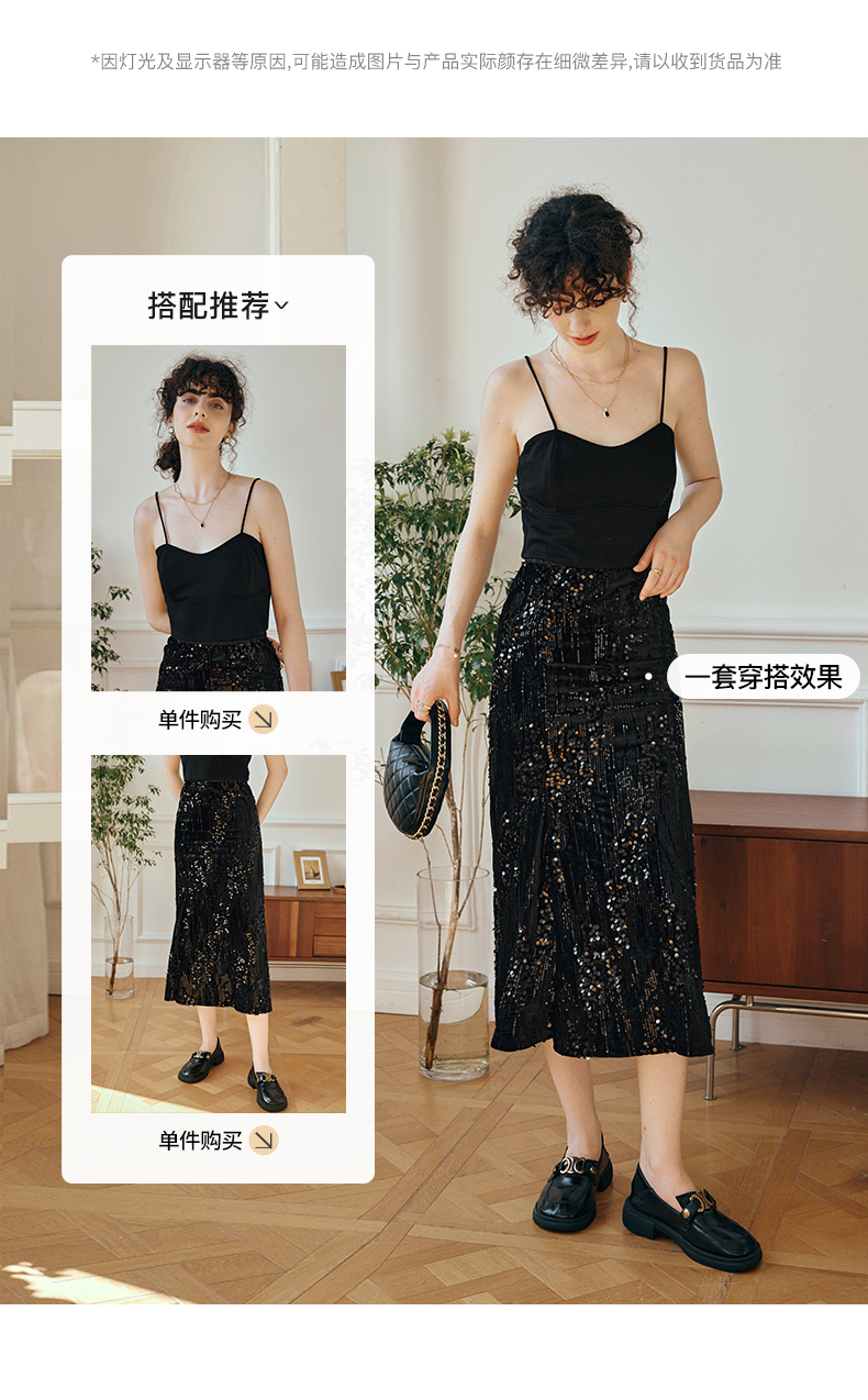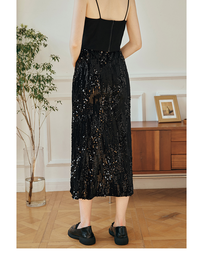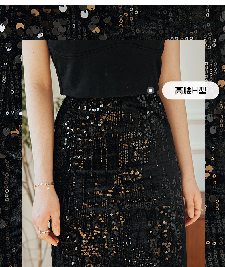 OLrain欧芮儿黑色丝绒半身裙女初秋2023新款高腰时尚珠片绣铅笔裙