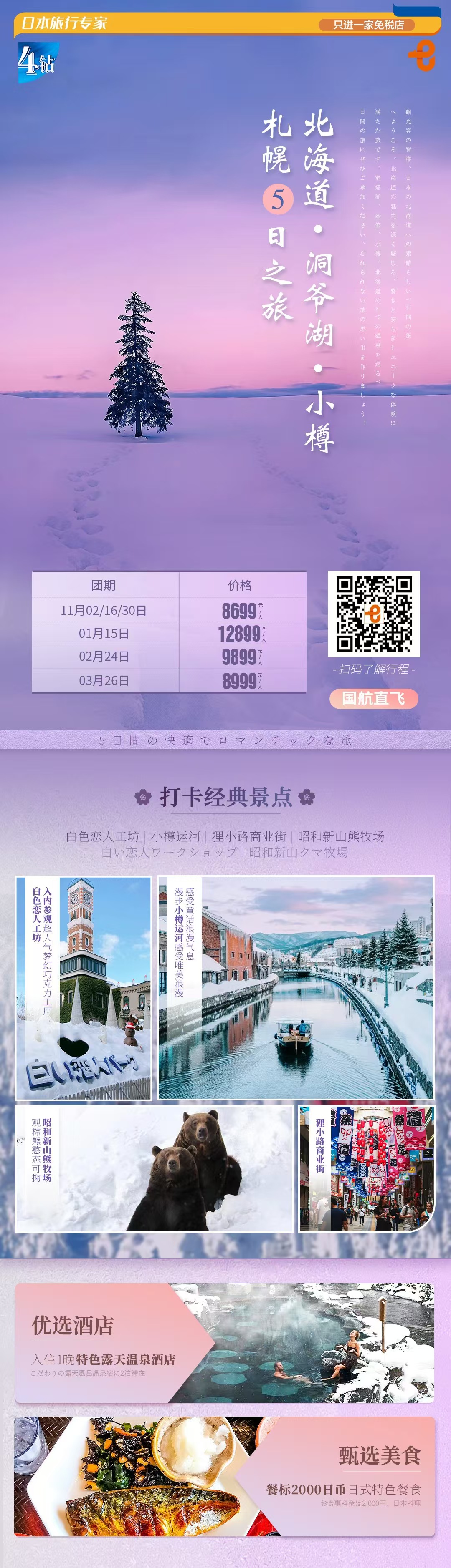 【北京出发】冬景如画5日 直飞4晚5天 北京国航直飞札幌航线 当地4星住宿,1晚温泉酒店精华景点:登别地狱谷/洞爷展望台/