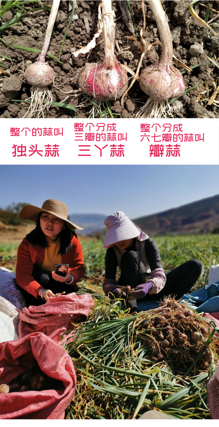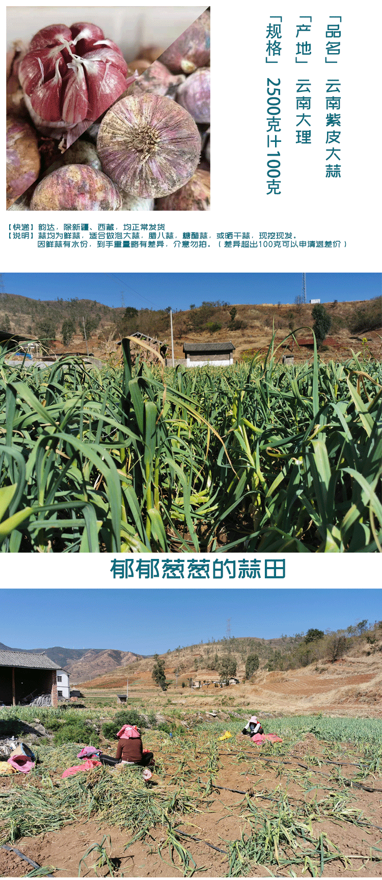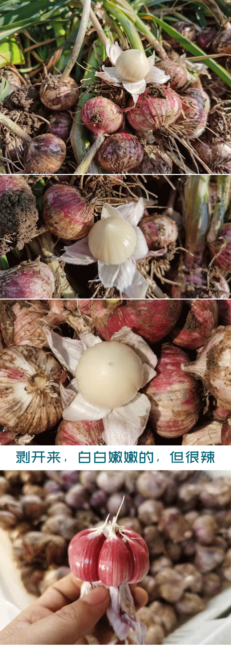 【特 点】: 云南大理紫皮独头蒜,大理地理标志产品,因皮紫色二得名,生在云南高原温差大,生长周期长,大蒜素含量是普通白蒜3-5倍,其大蒜素可以起到杀菌杀毒的功效,是食材也是一味良药,深受市场欢迎,可以做糖醋蒜,黑蒜,腊八蒜,佐料,生吃大蒜。