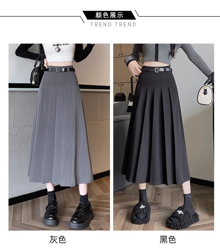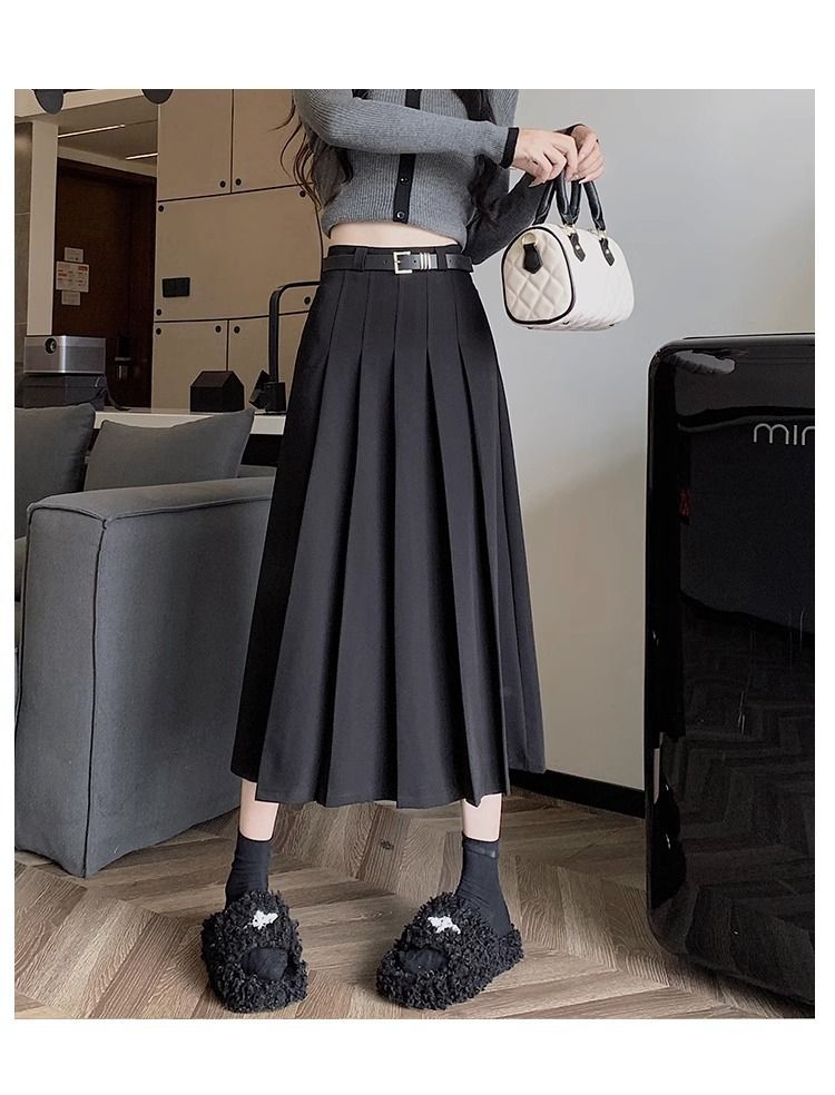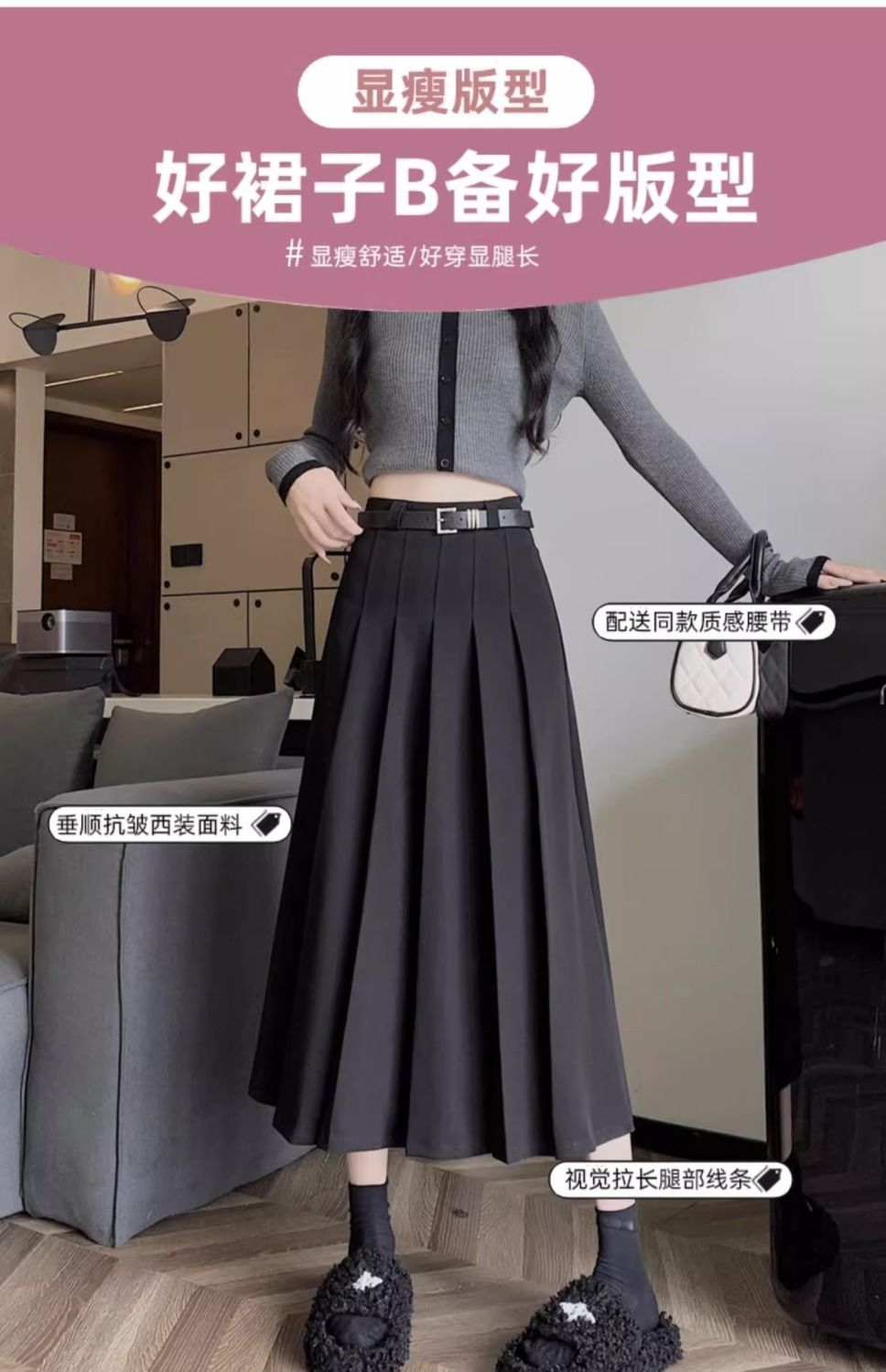 送腰带【学院风百褶裙】春季新款黑色中长款半身裙 高腰显瘦A字西装半身裙子