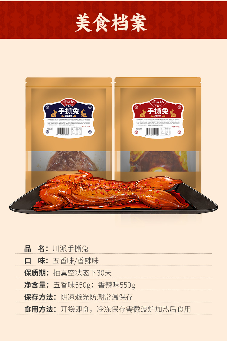 老伙记【川派手撕兔550g袋装】老伙记四川特色美食 正宗川味即食小吃手撕兔 五香味/香辣味可选 自贡冷吃兔 零添加整只手撕烤全兔