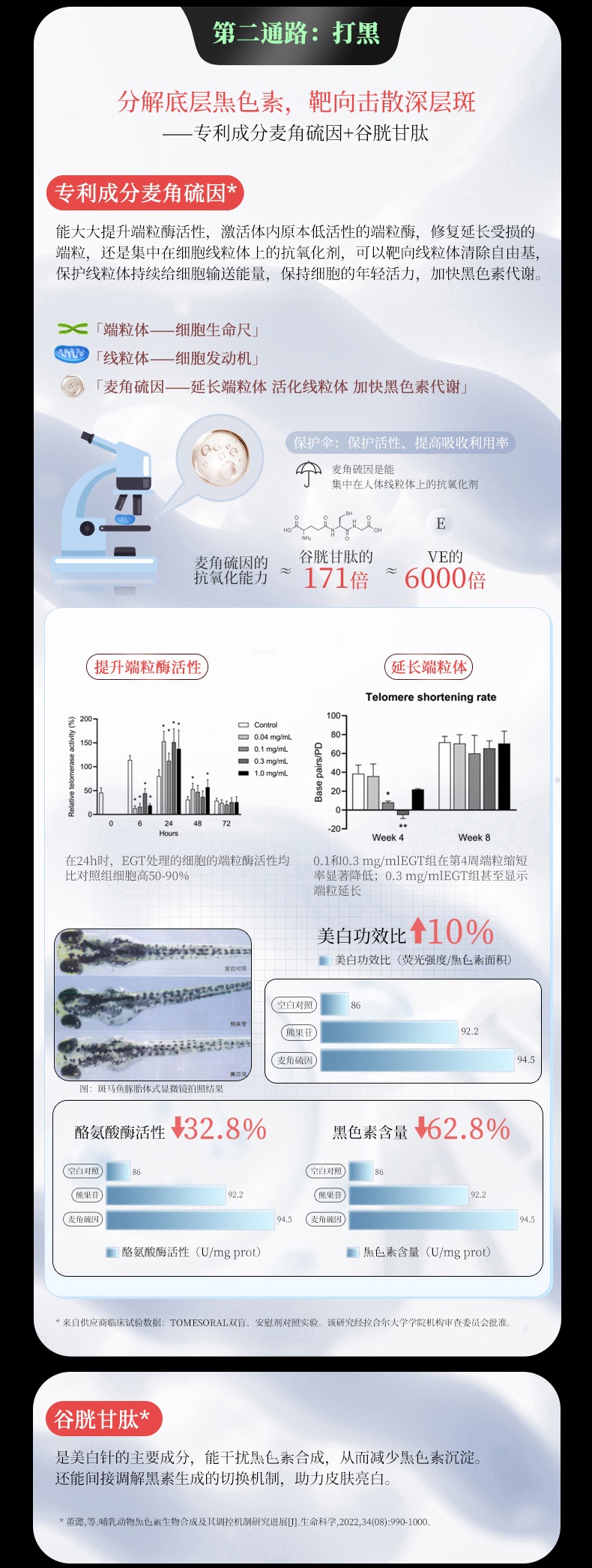 不仅能修补端粒体,还是唯一集中在细胞线粒体上的抗氧化剂,可以靶向清除自由基,保护线粒体给细胞输送能量,加快黑色素代谢。