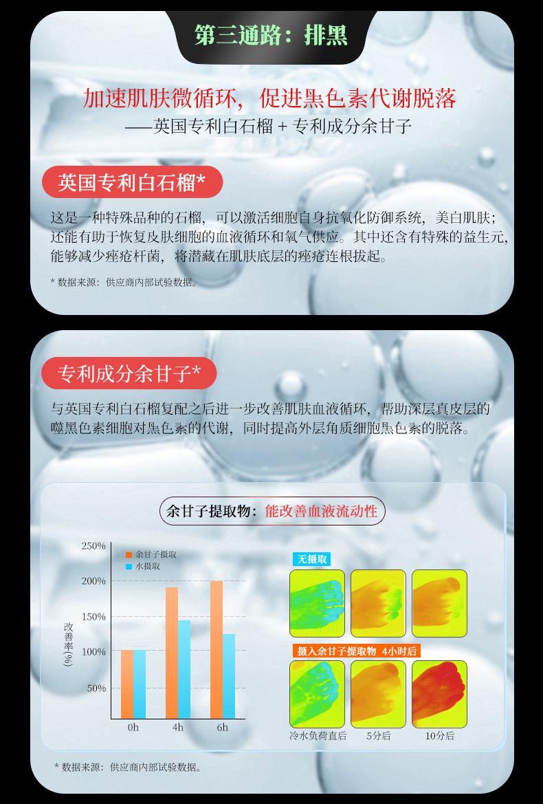 改善肌肤血液循环,帮助真皮层的噬黑色素细胞对黑色素的代谢,同时提高外层角质细胞黑色素的脱落。