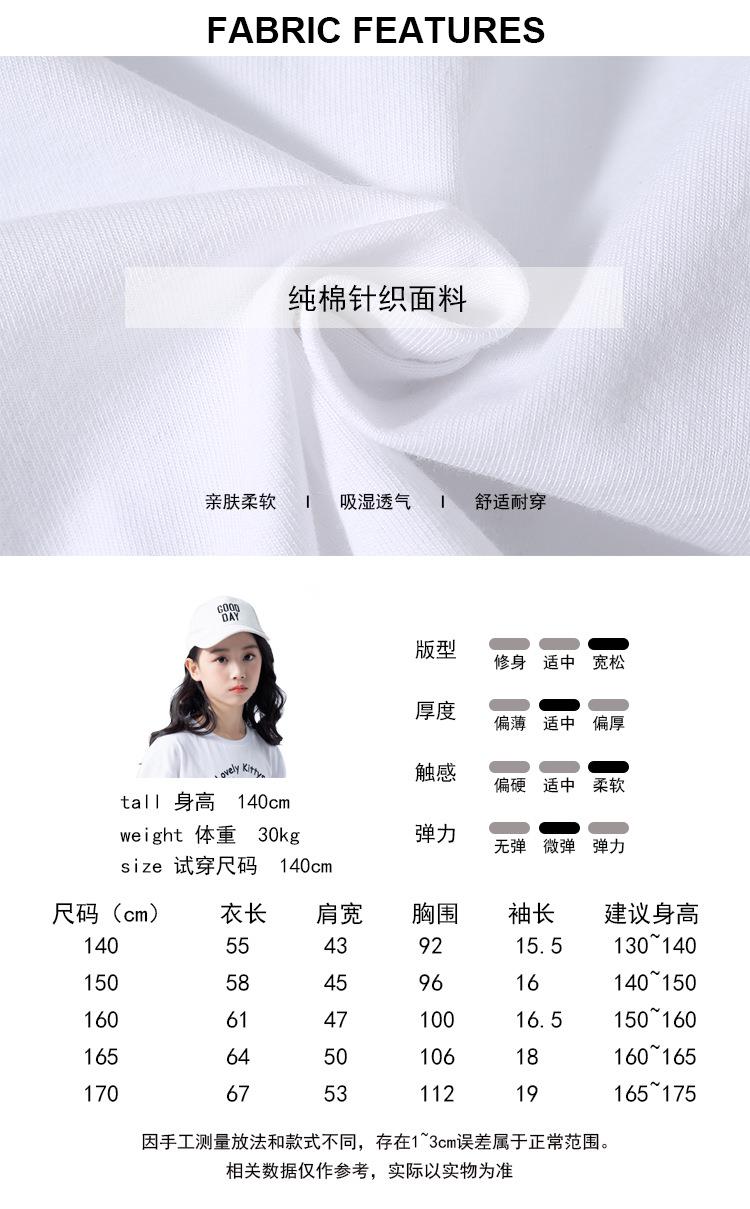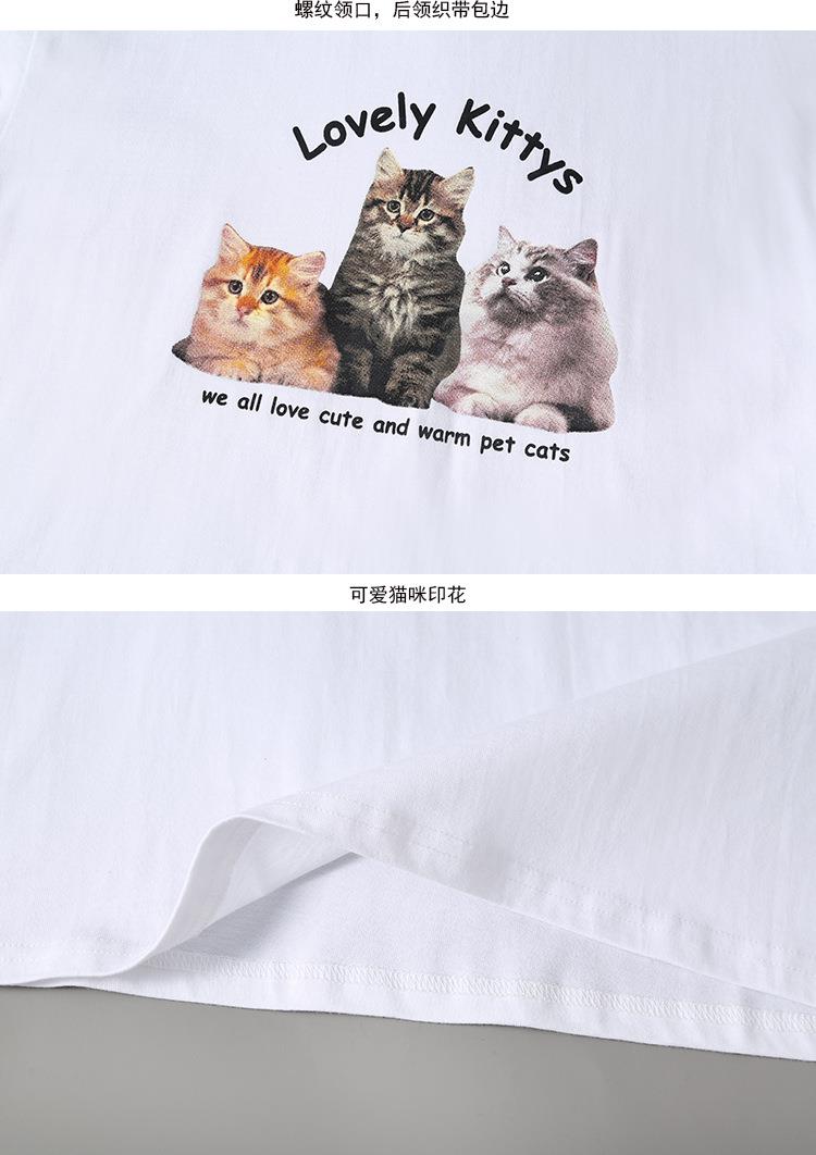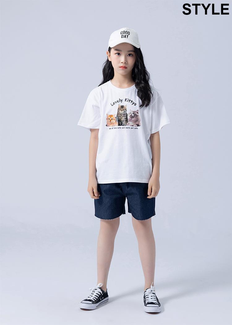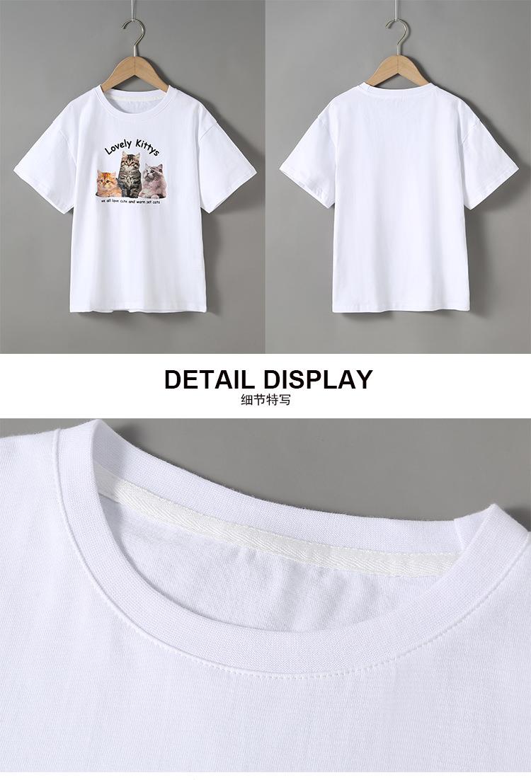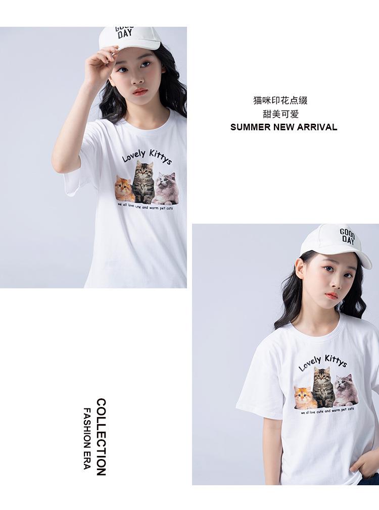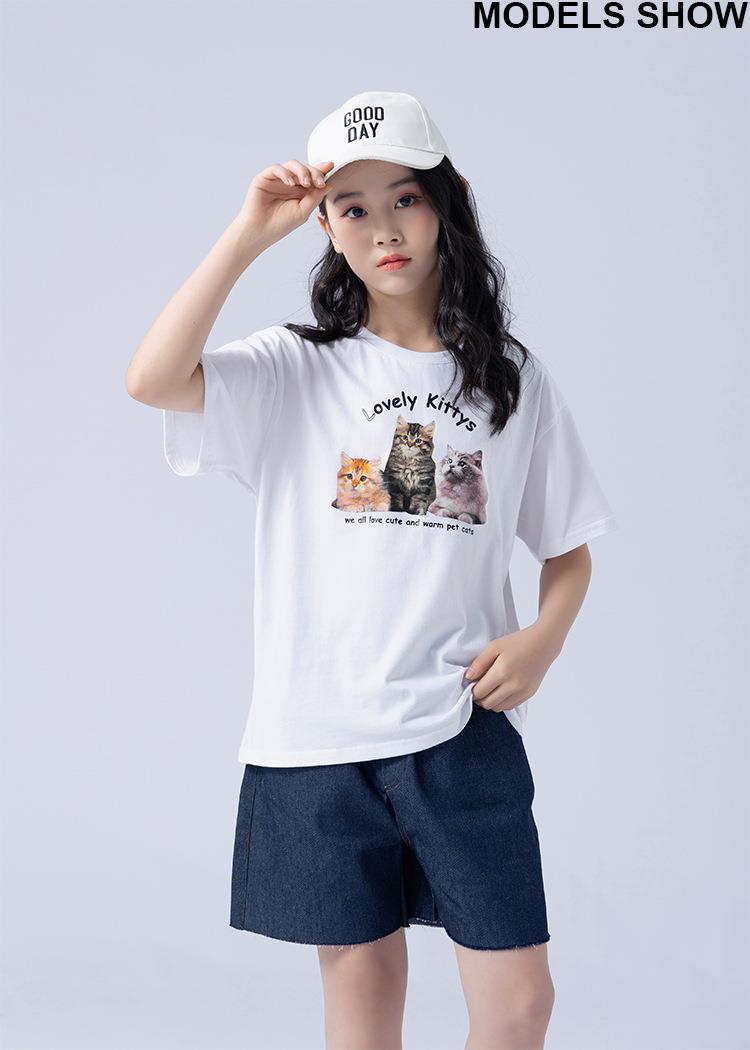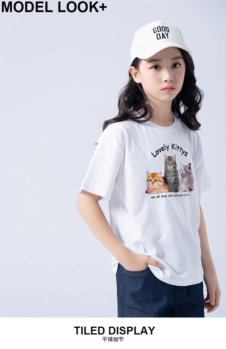 女童T恤2023夏季可爱猫咪印花纯棉短袖T恤韩版大童青少年女T恤