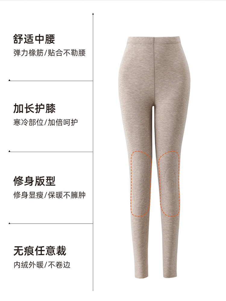 1.舒适中腰,贴合不勒腰,加长护膝,紧密贴合膝盖的弯曲弧度,强化关节保暖,抵御风寒侵袭。