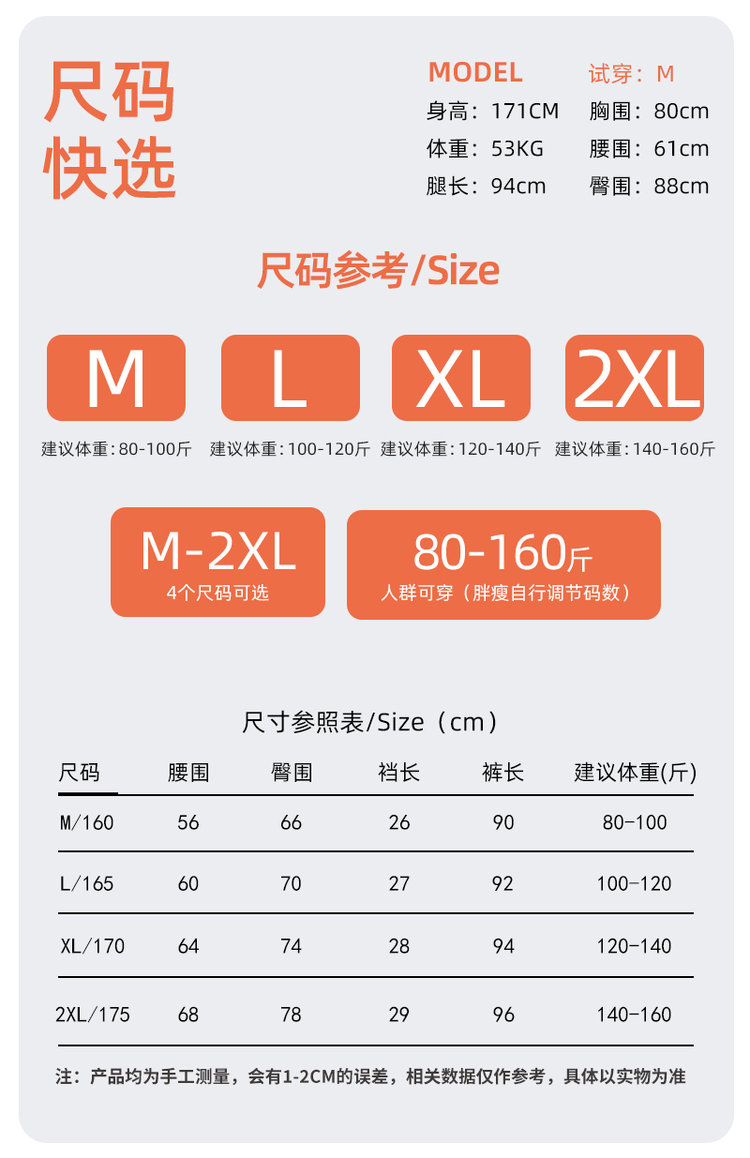 产品尺码:M(80-100斤)、L (100-120斤)、XL(120-140斤)、2XL (140-160斤)