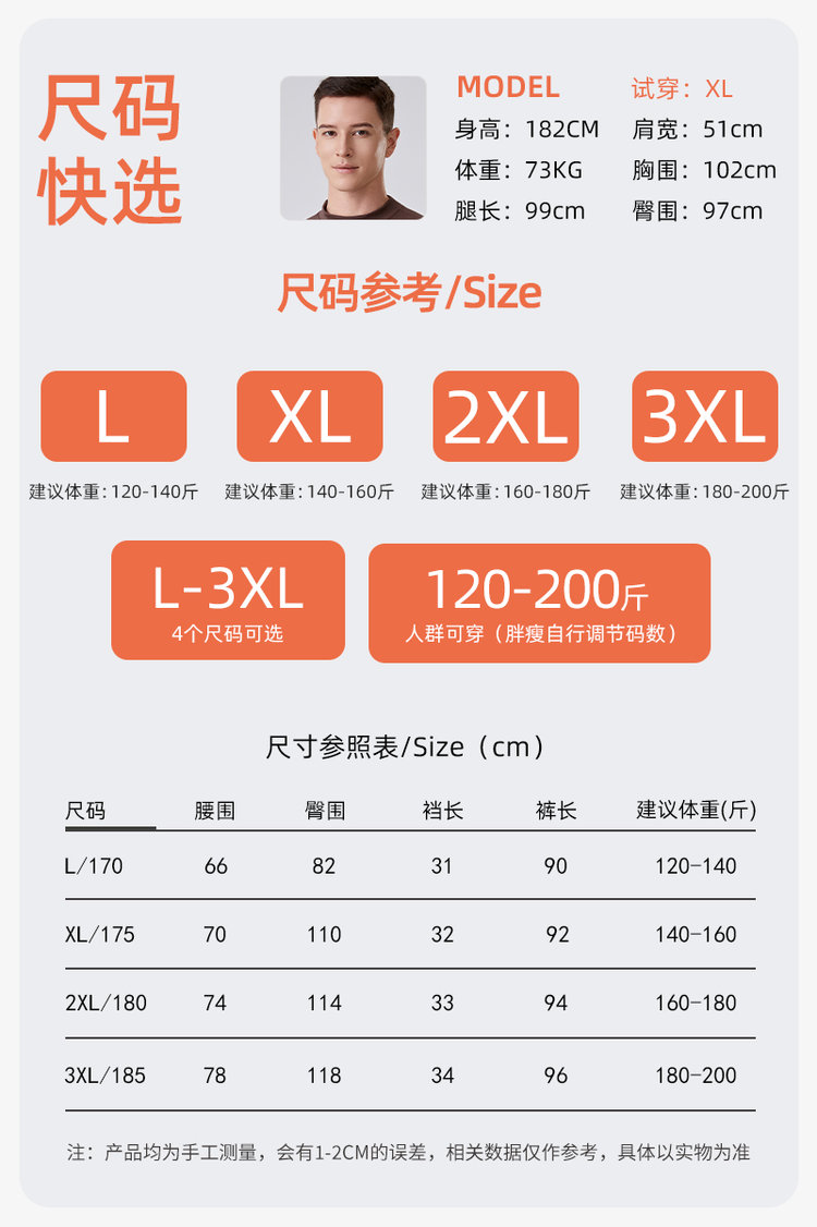 产品尺码:L/170(120-140斤)、XL/175(140-160斤)、2XL/180(160-180斤)、3XL/185(180-200斤)