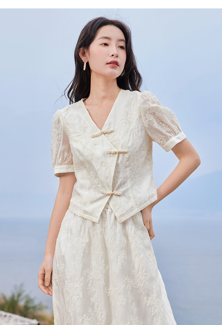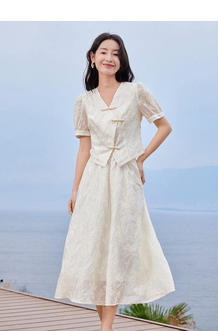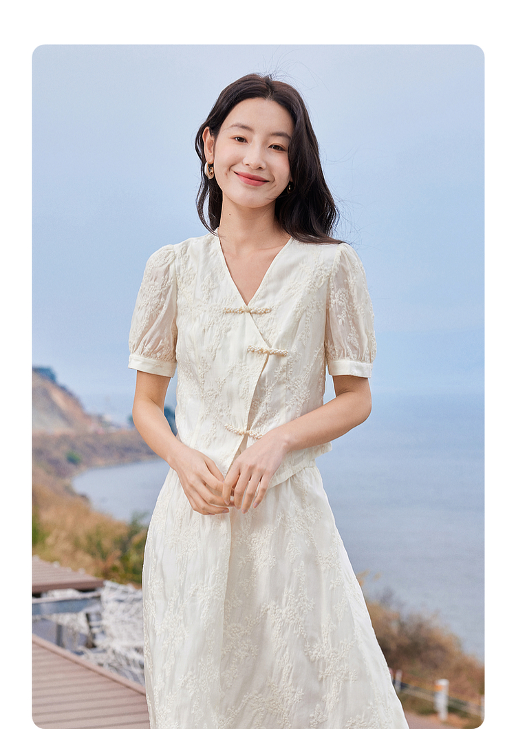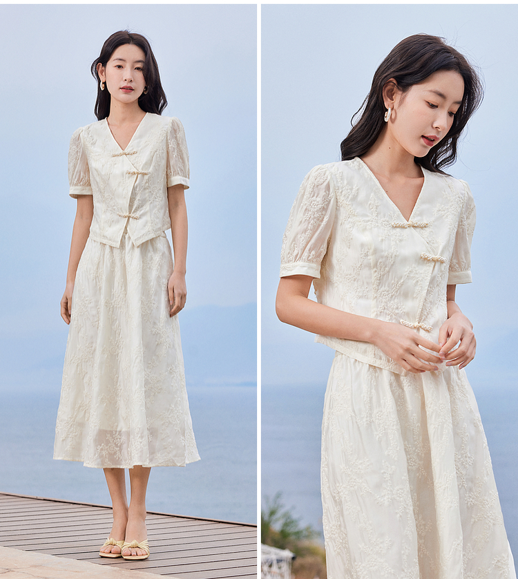 【五折购】熙世界新中式高端天丝套装裙子夏季国风刺绣盘扣上衣半裙两件套