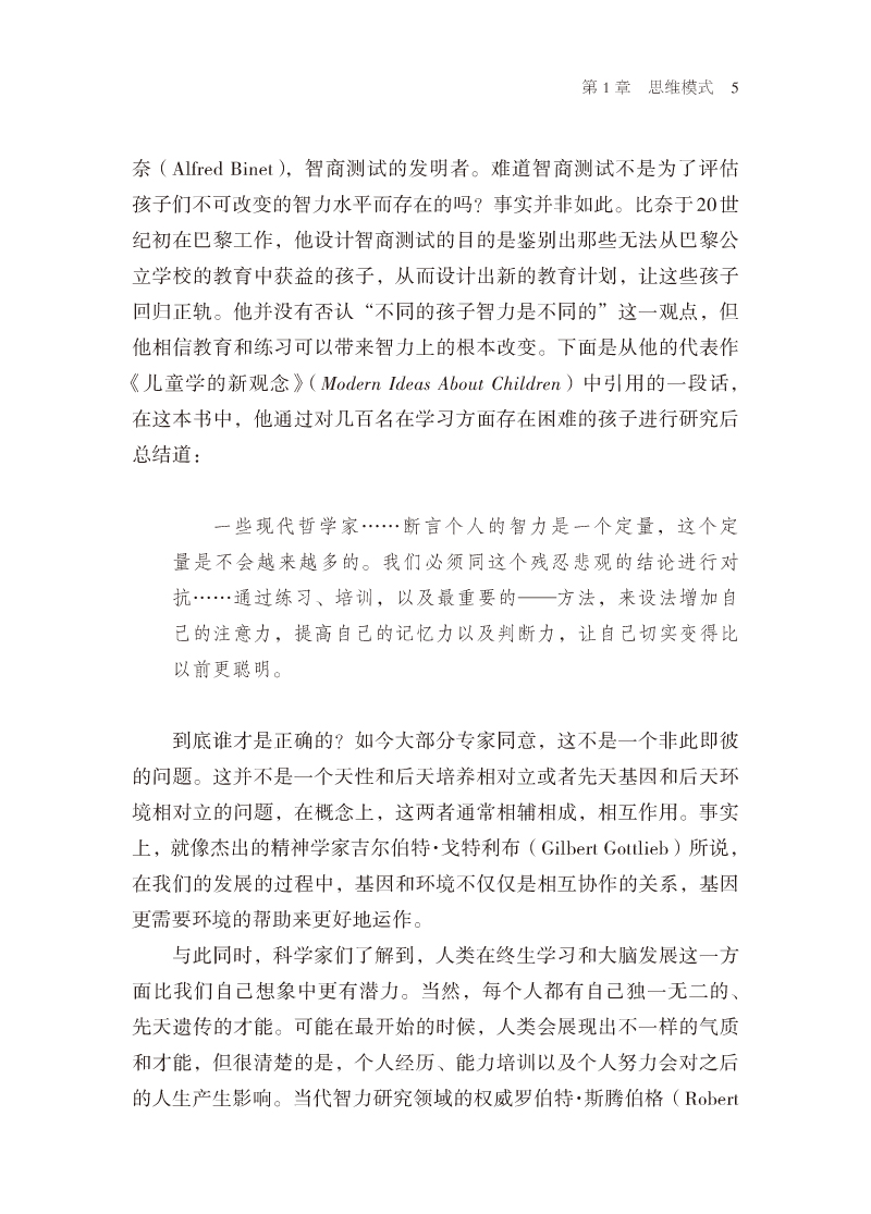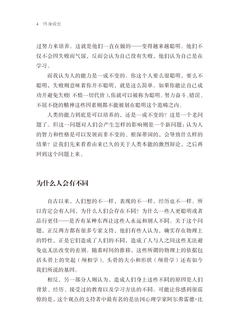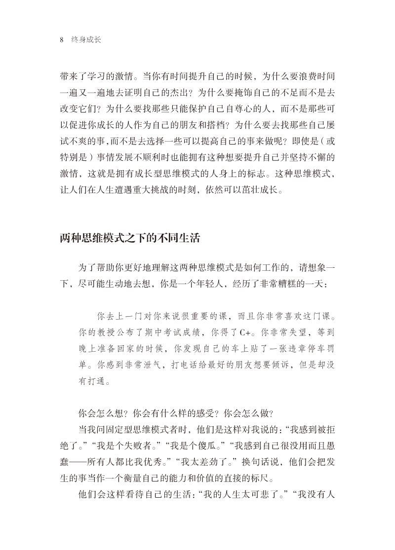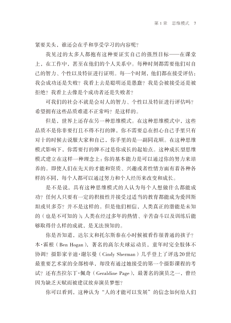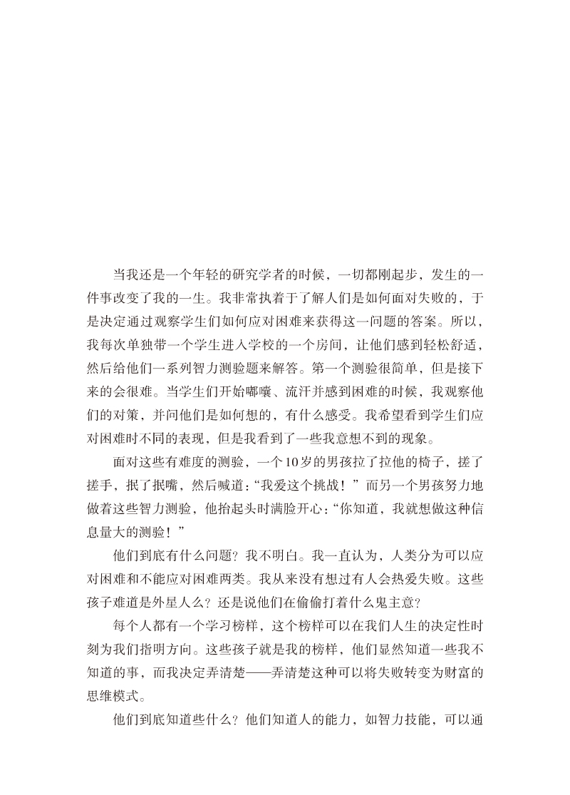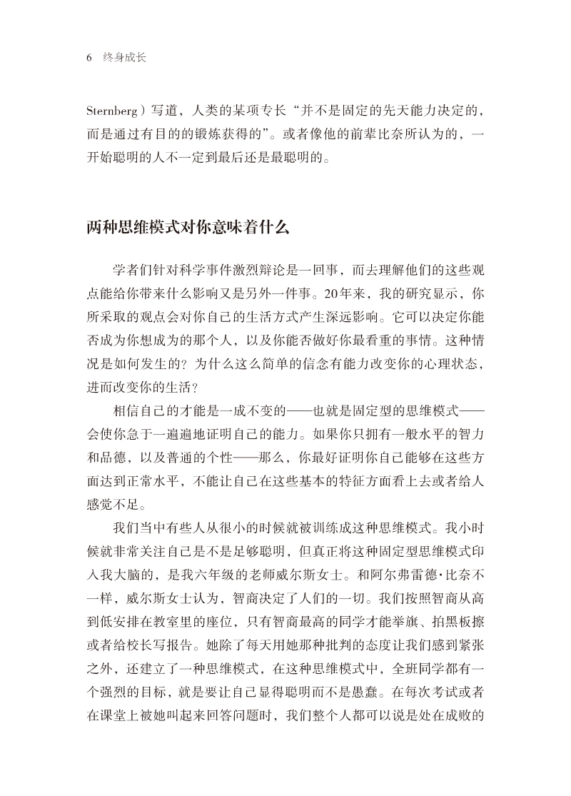 在这本书里,你会了解到,你自己的一个简单的信念——即我们在研究中发现的这种信念——可以对你人生中很大一部分内容起到引导作用。事实上,它渗透到了你生活中的每一个部分,连你自认为属于自己的个性,实际上也是从这种“思维模式”(mindset)中衍生出来的,而那些可能妨碍你发挥潜能的因素也一样从中而来。
