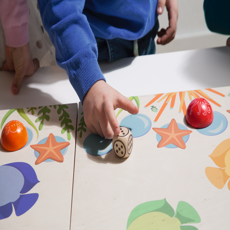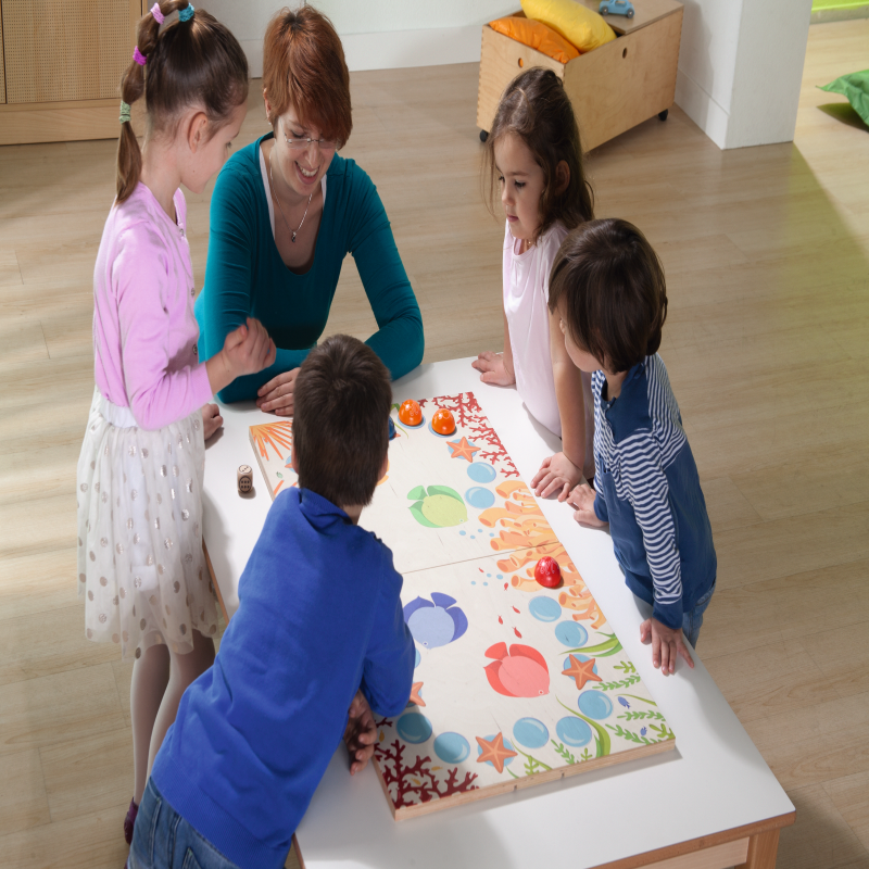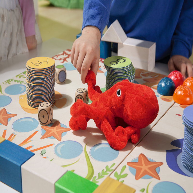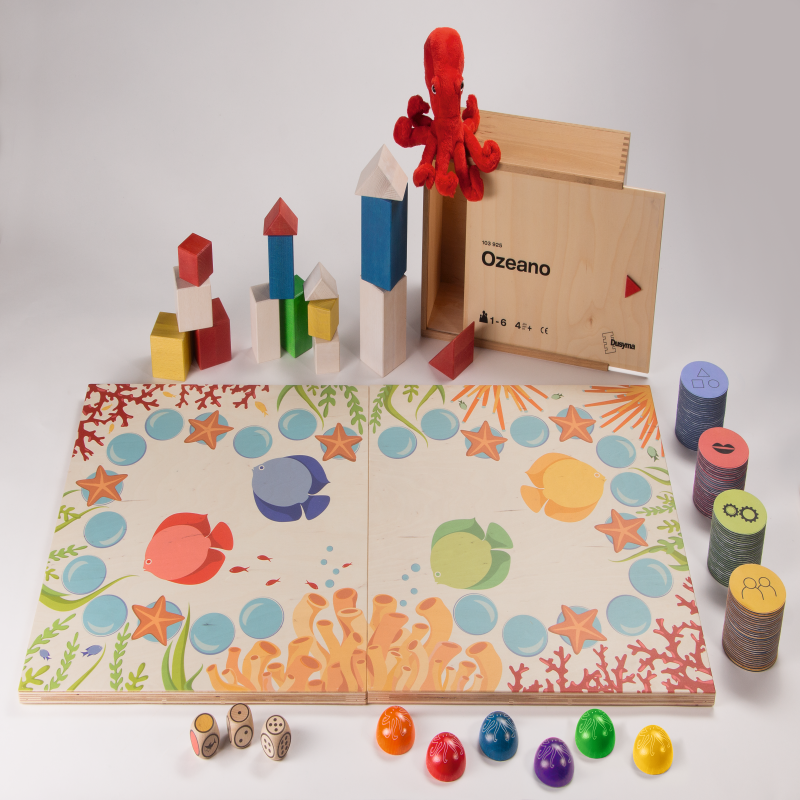 1、内含2 块游戏板(50x45cm),6 种不同颜色的计数器,15 片颜色形状各异的积木块,1 条大章鱼,120 张层压任务卡(直径7cm),30 张任务卡及3 颗骰子(3cm)。