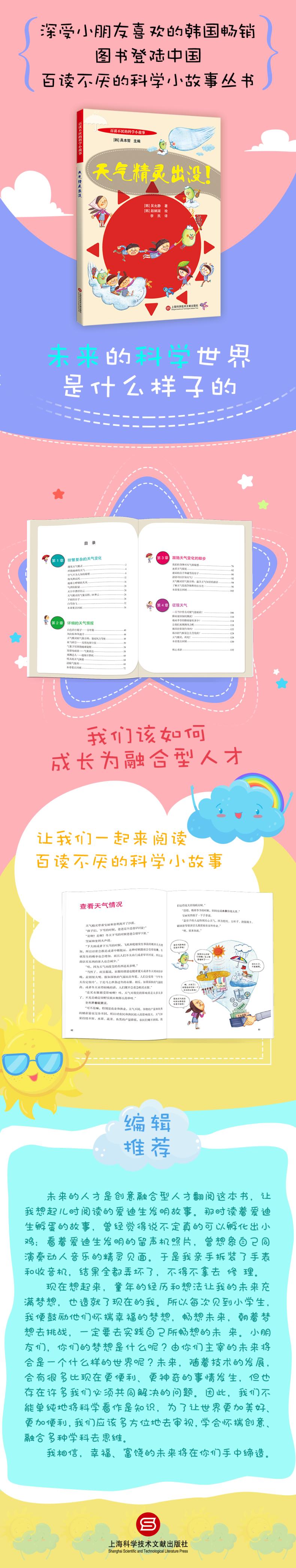 本丛书为韩国科学技术院文化科技研究生院教授具本哲主编的一套低年龄段科普读物,《天气精灵出没》为丛书分册之一。天气是自然现象,气候的变换自有它的理由,也就是它的科学原因。科学让我们掌握大量的自然知识,拓宽我们对自然的认识,而后来又延伸为对于技术发展的了解。本书讲述了观测和利用天气的过程中所发生的科学技术、工程、数学以及人文艺术方面的相关进步。希望这本书能够让读者小朋友了解天气常识,认识到人和天气之间割舍不断的关系,了解云风、雨、雪的相关常识。