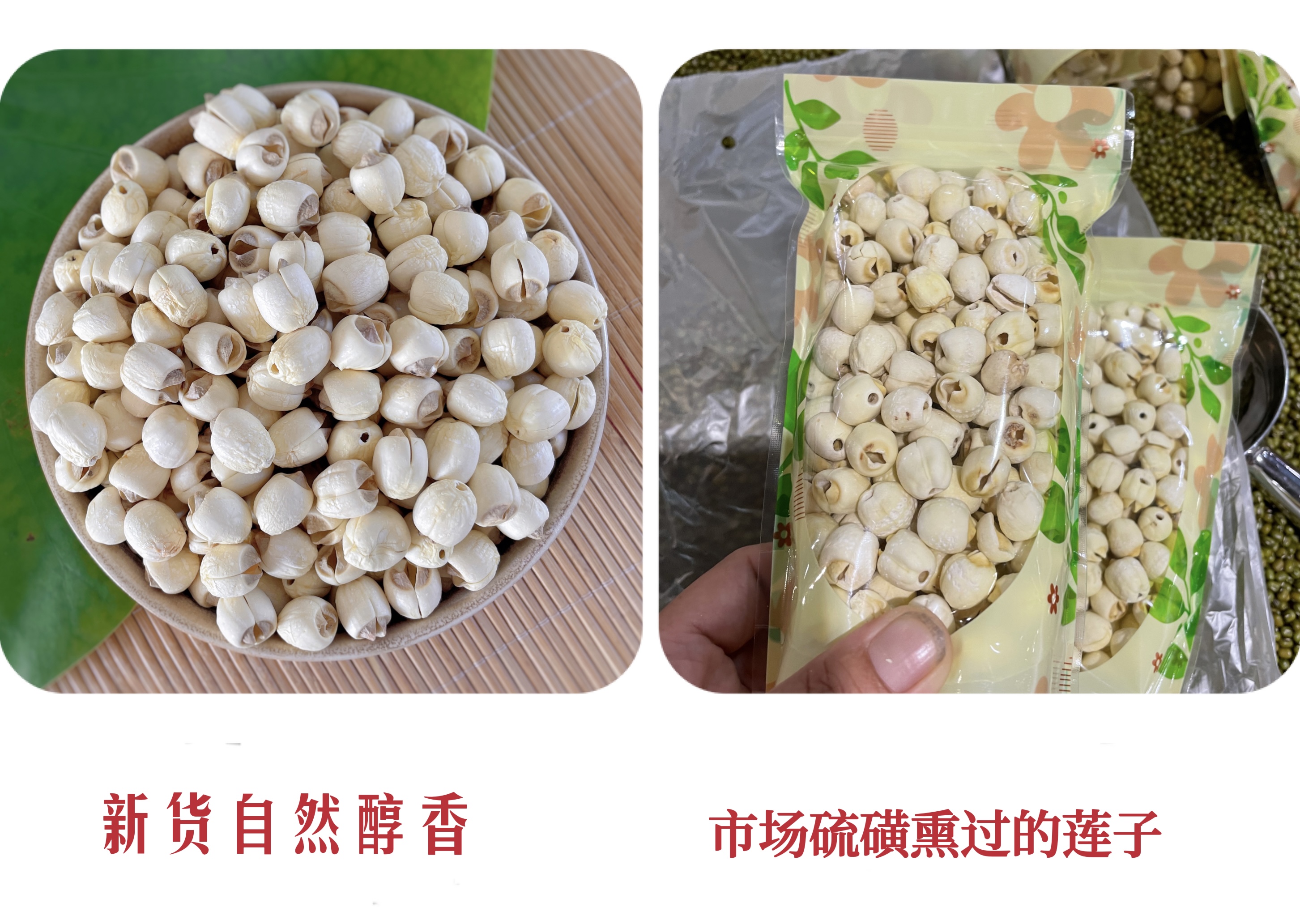 (市场陈年老莲,被硫磺熏过,干吃会有股肥皂味或是消毒水味,炖煮很难粉糯,里面发硬,更是没一点莲子的粉糯清香味)