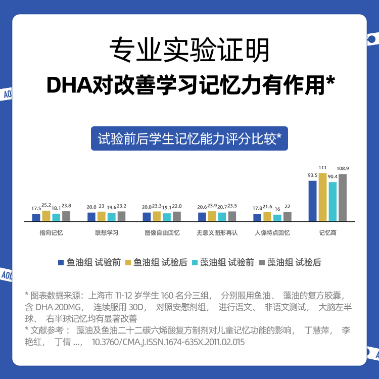 5)人体试验 :经人体试验证明,来自鱼油、藻油的DHA都能对学习记忆能力起到提升作用,短期服用也可改善记忆