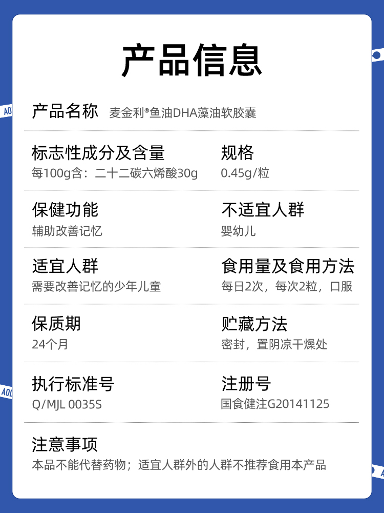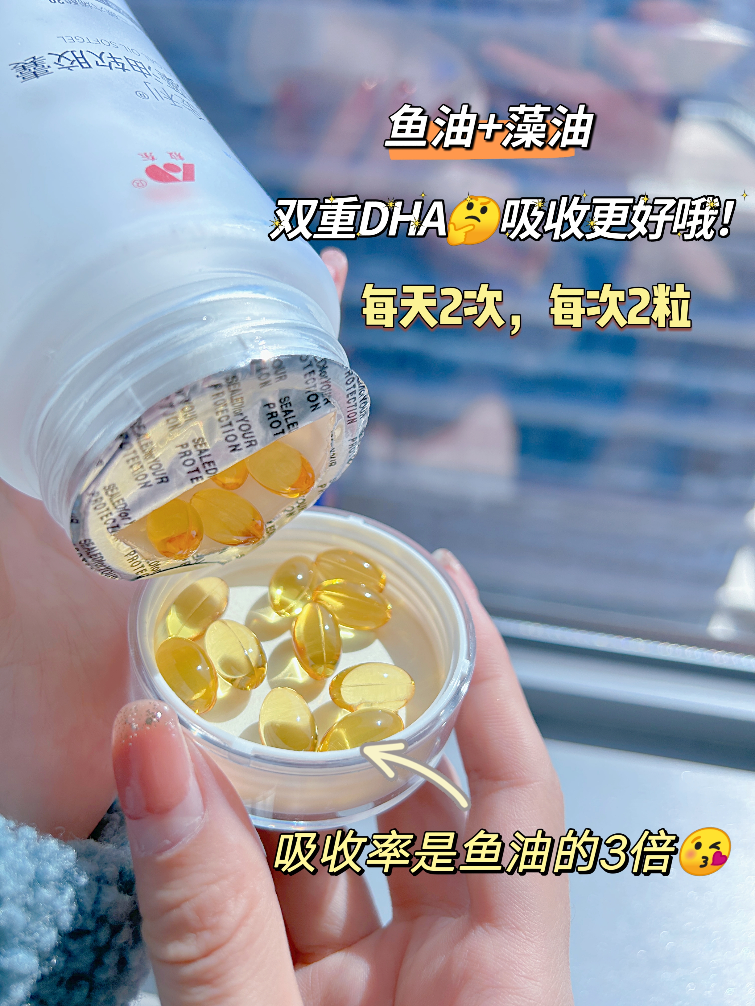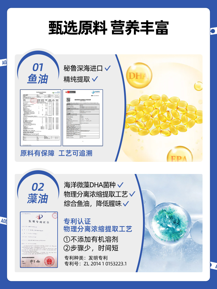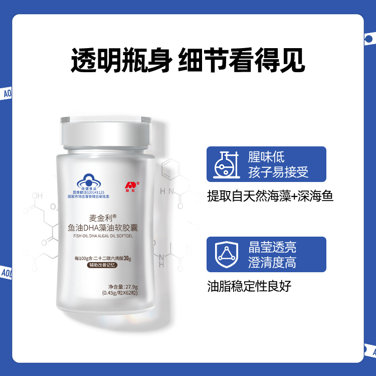 1)有效双配方:藻油+鱼油动植物双配方,含高纯度DHA,DHA被称为“脑黄金”,是促进大脑发育和视力发育的重要营养素