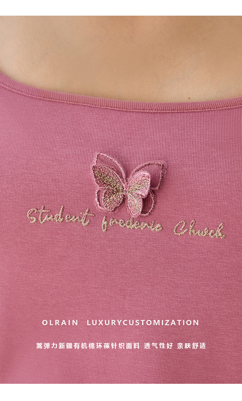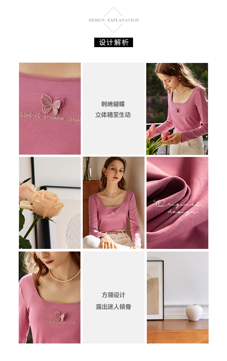 欧芮儿长袖t恤女秋季新款2022修身显瘦方领薄款刺绣内搭打底上衣