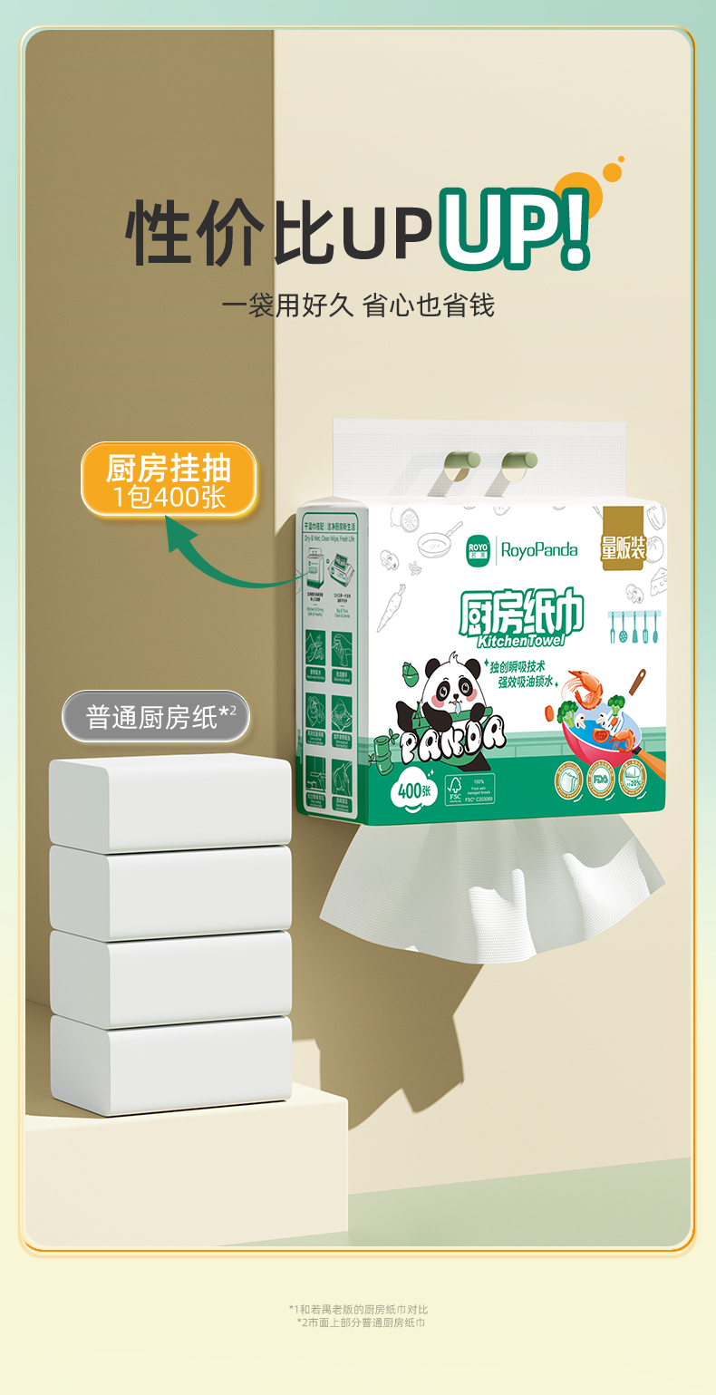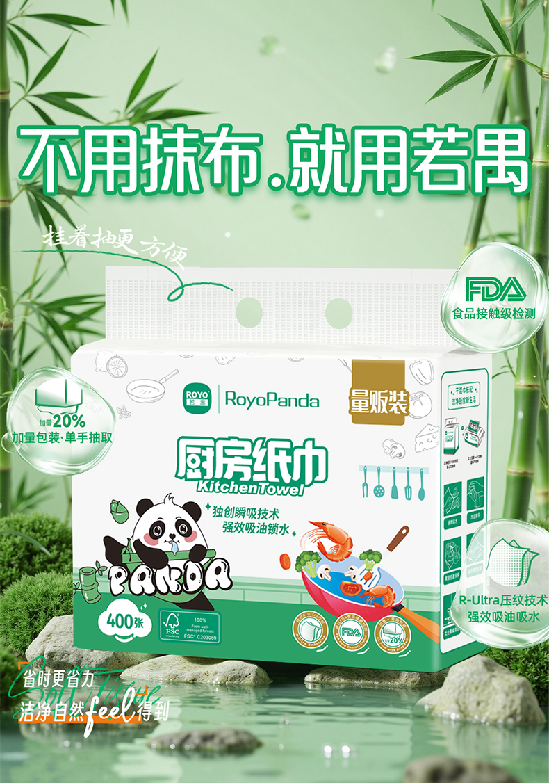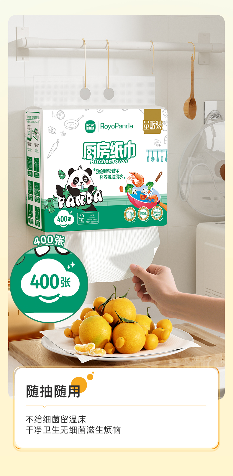 若禺RoyoPanda厨房纸双层加大加厚400张/提便捷挂式装原生竹浆吸油吸水1件4提RK1902