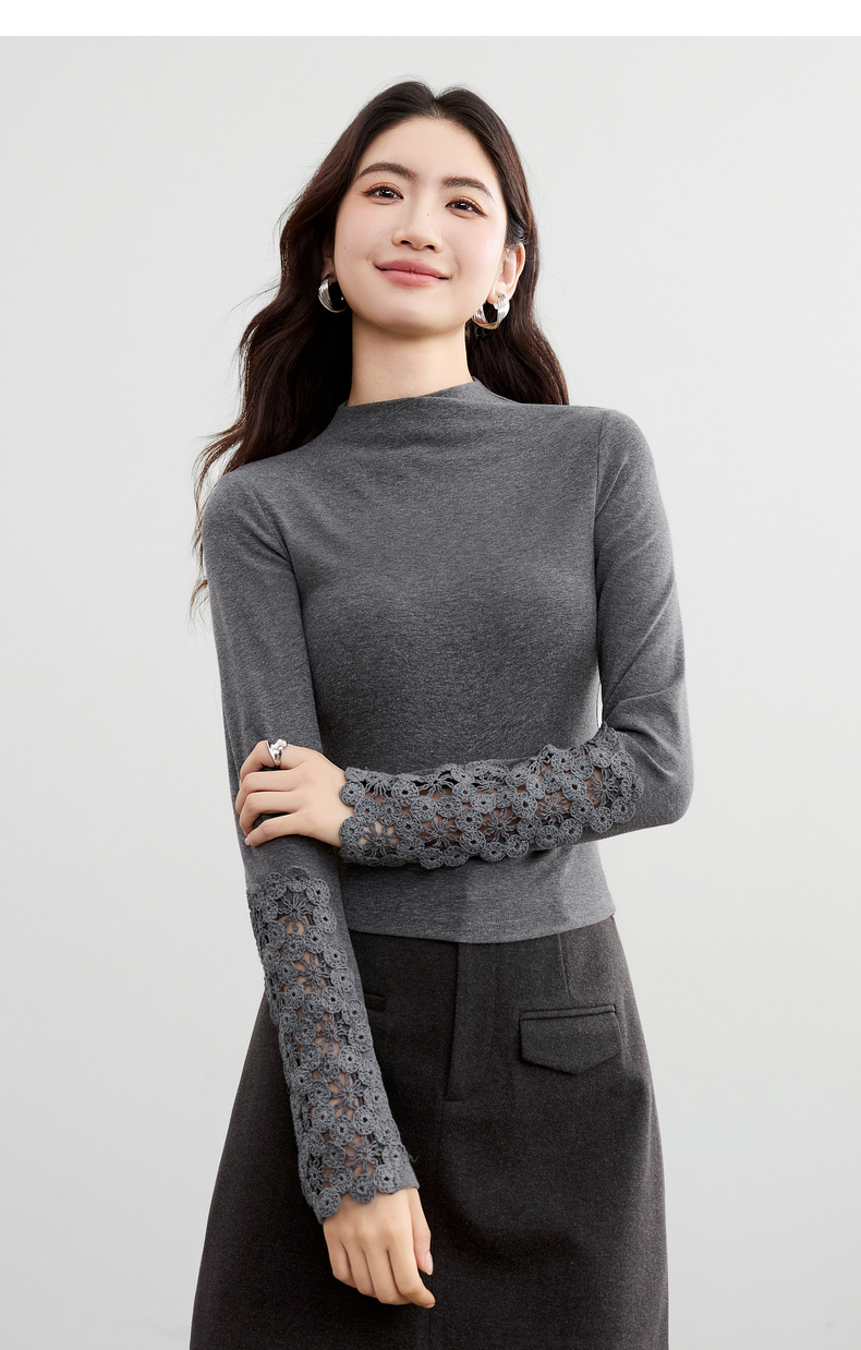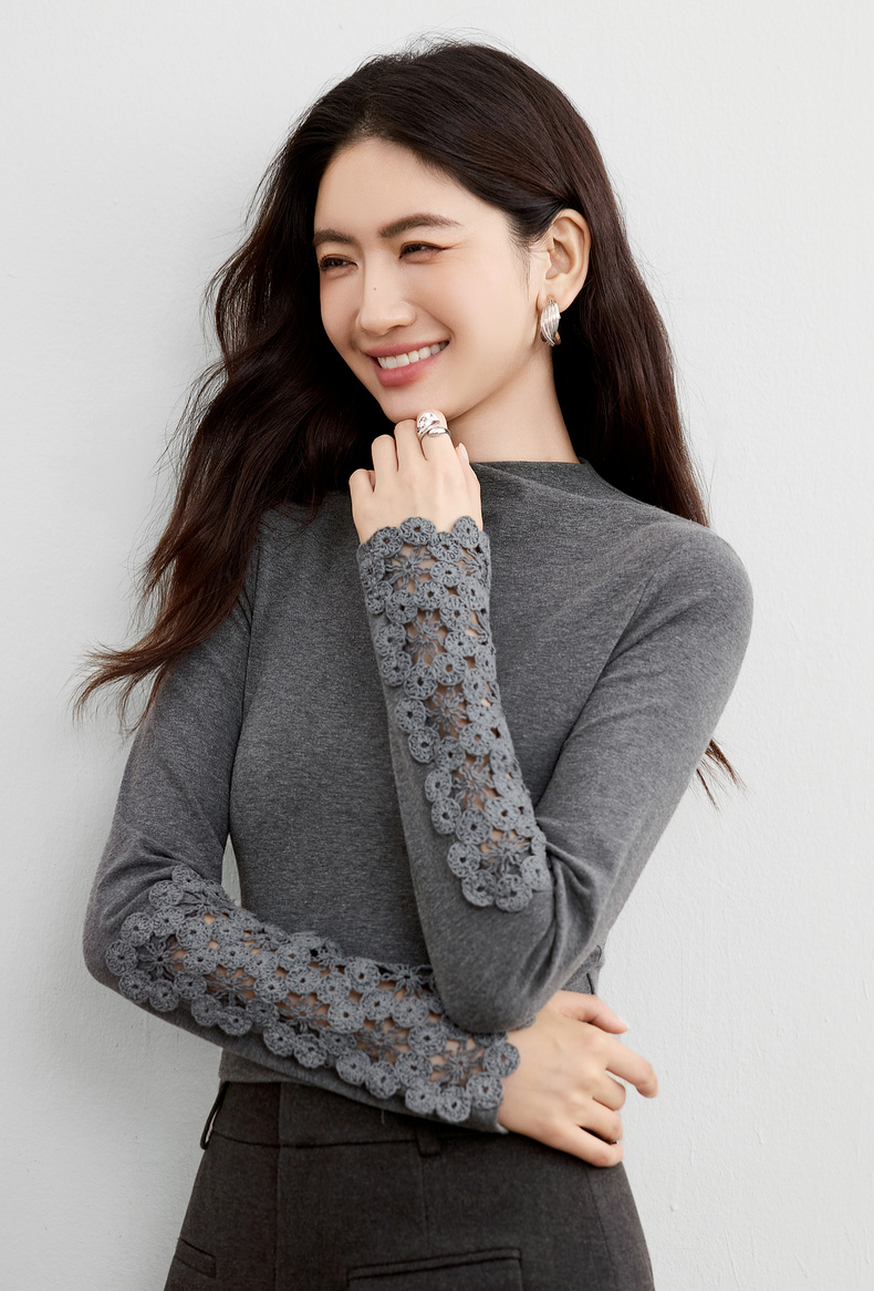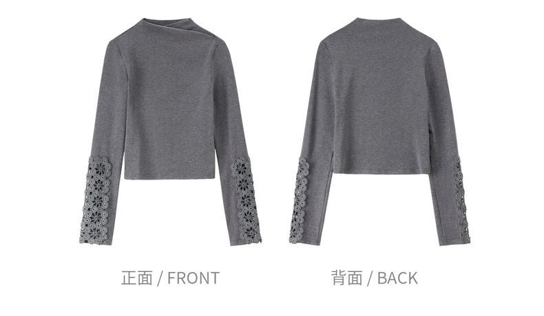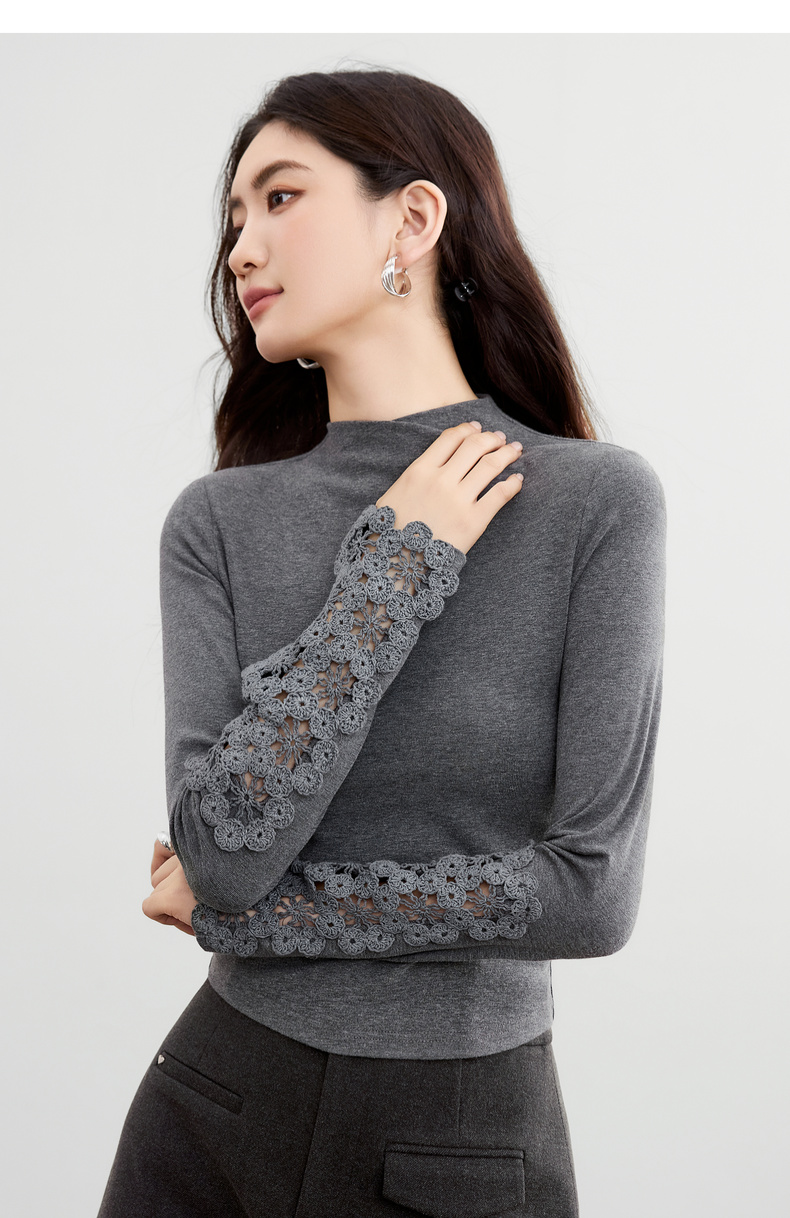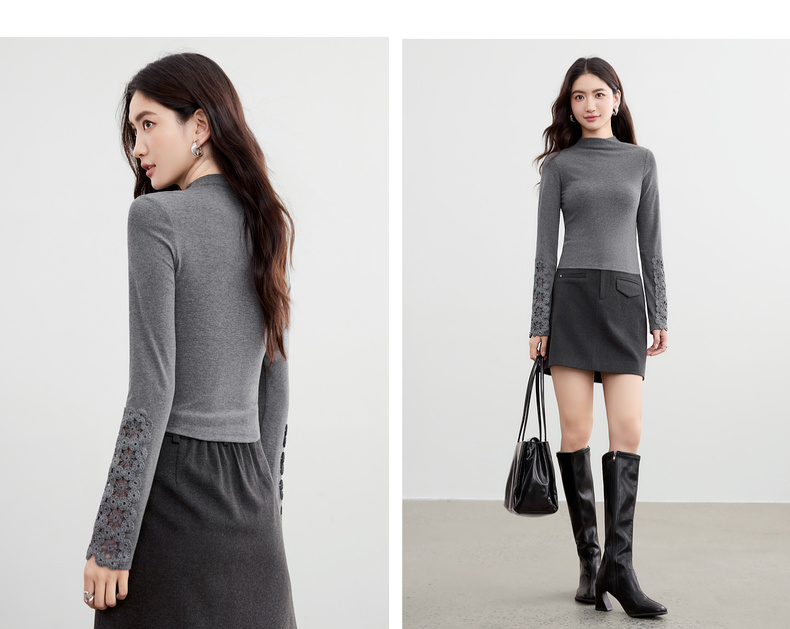 【内购】【镂空花卉】简约通勤设计感半高领袖子拼接镂空花卉修身针织T恤-153TA3421