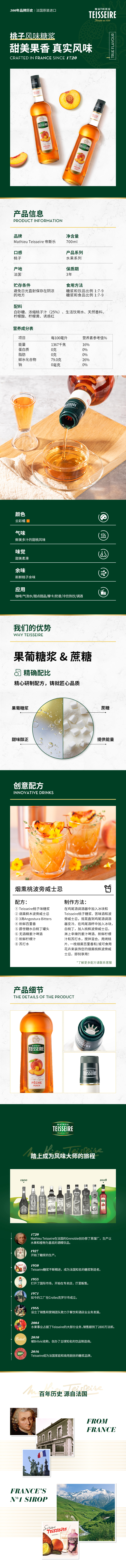 【Teisseire糖浆】帝斯乐 桃子风味700ML/瓶 液体糖浆咖啡伴侣 奶茶 调酒