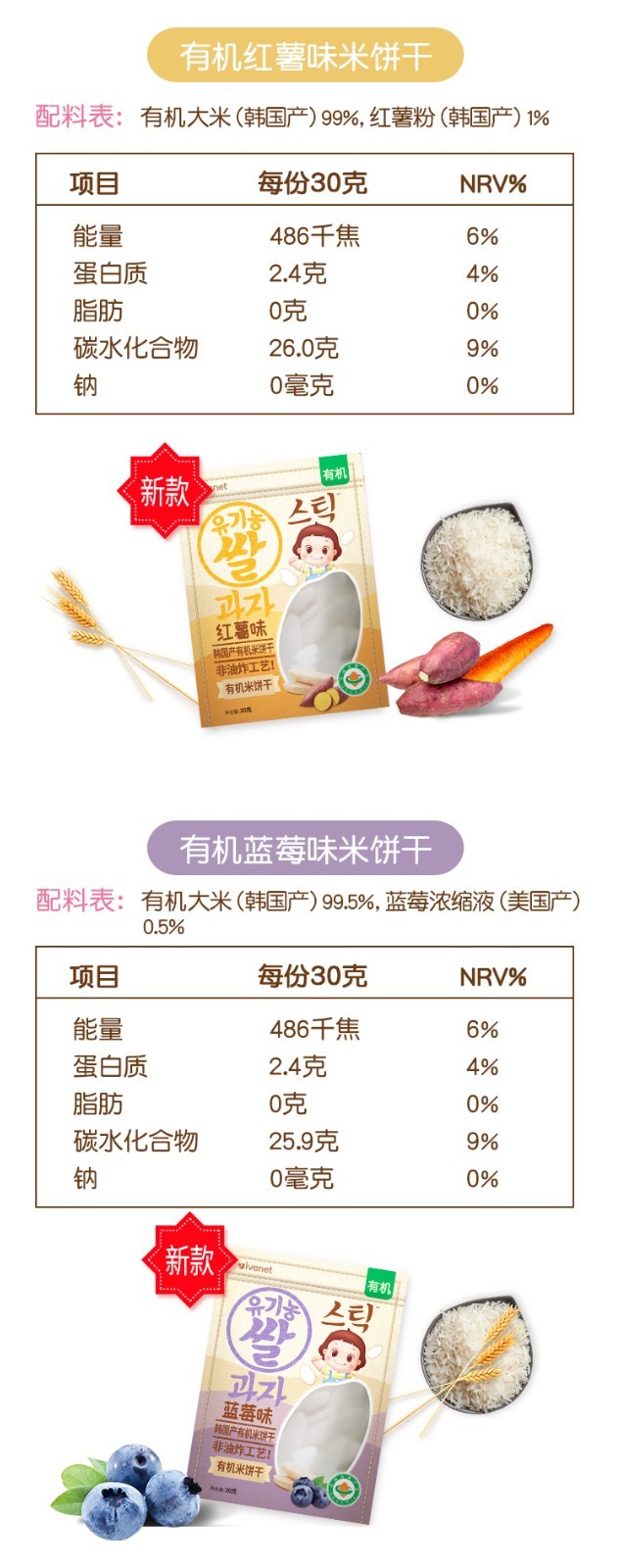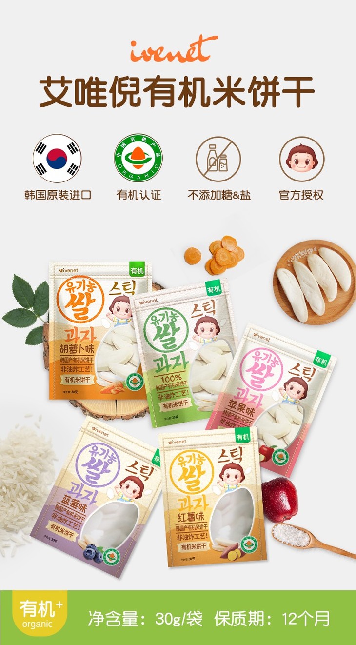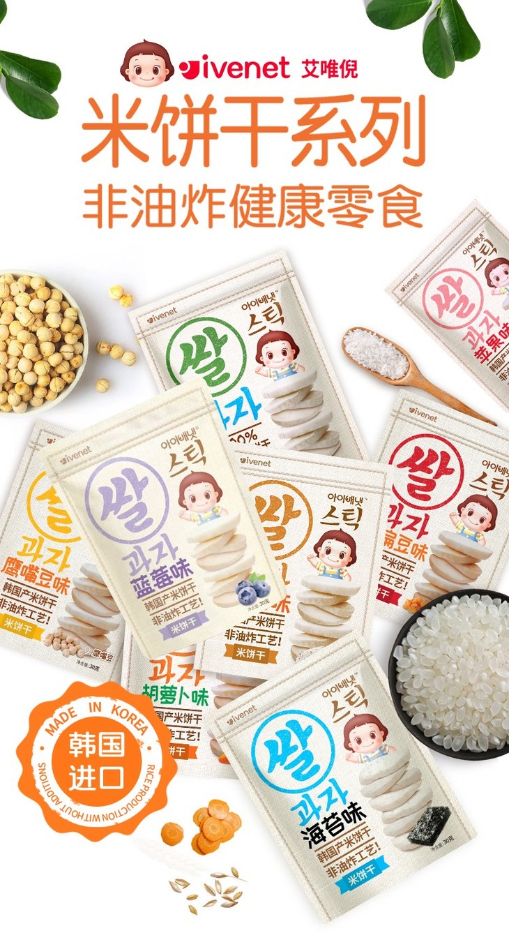【一般贸易】韩国艾唯倪米饼干宝宝零食 30g*3包 蓝莓味苹果味非油炸健康零食