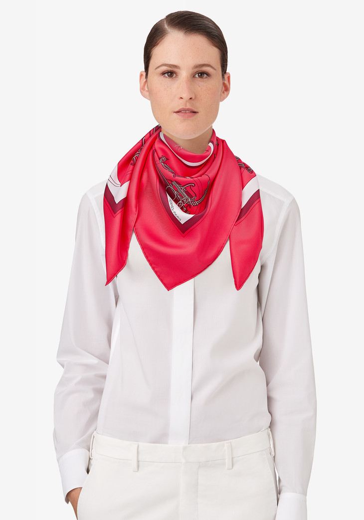 雨果·格里卡尔(Hugo Grygkar)为爱马仕设计了《华丽的缰辔》(Brides de gala)等经典之作,这款《藏书章》是他于1946年设计的方巾。 珍本爱好者为自己的藏书打上个人的印记,是一种独一无二的标记。1923年,埃米尔-莫里斯·爱马仕(Emile-Maurice Hermès)本着这一初衷,在自己的收藏品中挑选了一幅阿尔弗雷德·德·德勒(Alfred de Dreux,1810-1860)的作品《鞍辔已备,以供乘骑》(Duc attelé, groom à l’attente)作为藏书章标记,映衬在EMH姓名首字母的纹样之上。图案两侧各有一根神杖,这是希腊神话中赫尔墨斯(Hermès)的标志,象征和平与商贸。后来这幅图案成了爱马仕的徽章。徽章周围环绕着四辆华丽优雅的马车,设计灵感源自埃米尔·爱马仕(Émile Hermès)收藏的马车制造工匠的设计原图。