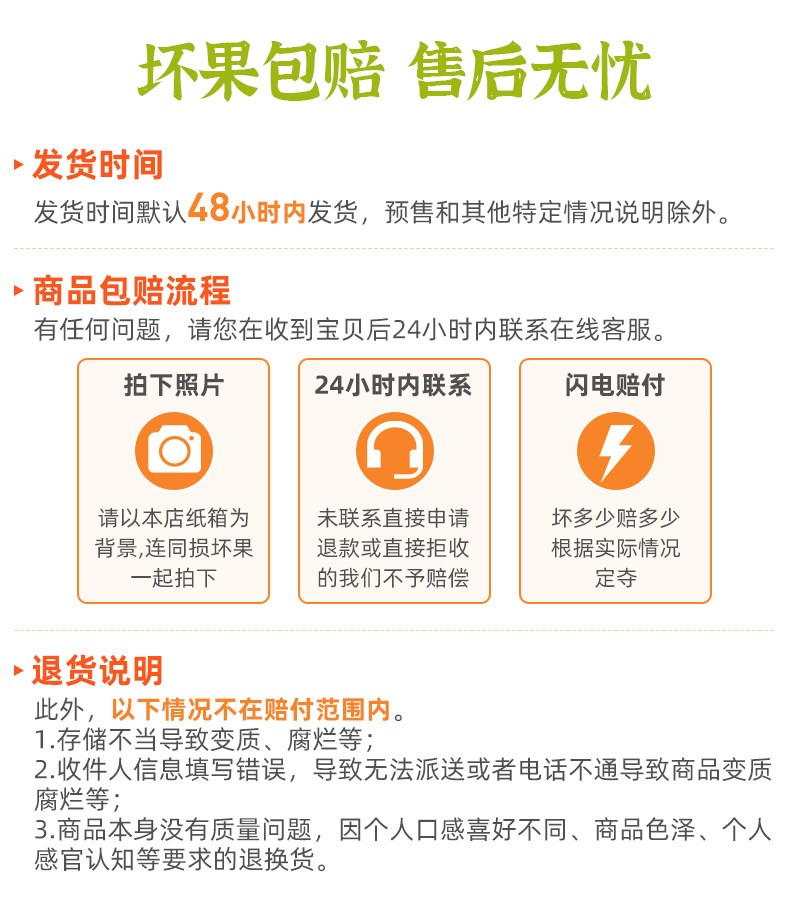 ⚠️生鲜果蔬类的不支持7天无理由退换货,已发货状态不支持拦截、拒收等!收到有问题(破损、变质、重量不足等)签收24小时内提供图片联系客服进行赔付!