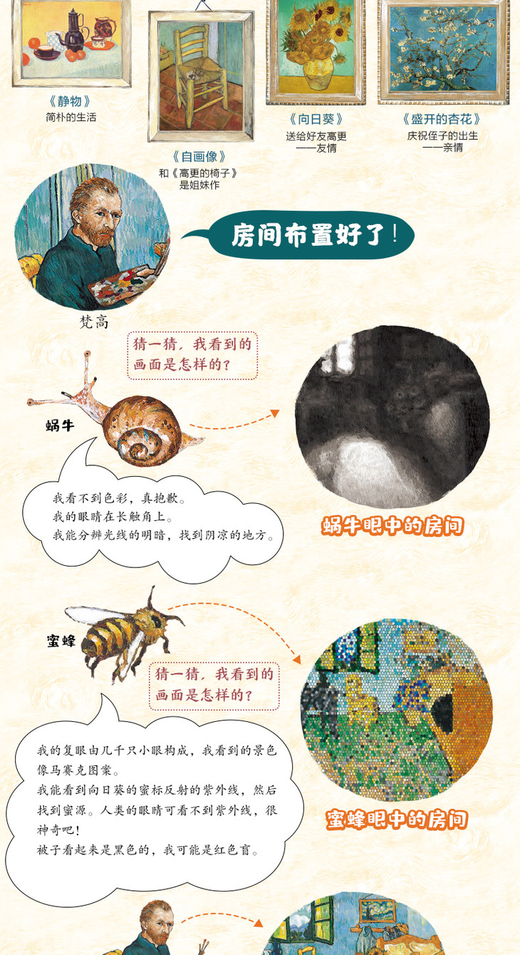 色彩大师梵高用《星月夜》《向日葵》等多幅名画布置他的房间,邀请蜗牛、金鱼、蛇、蜜蜂和狗来做客。猜一猜,谁的眼睛只能看到黑色和白色?谁看到世界是弯曲变形的?谁看到的风景像马赛克图案?……