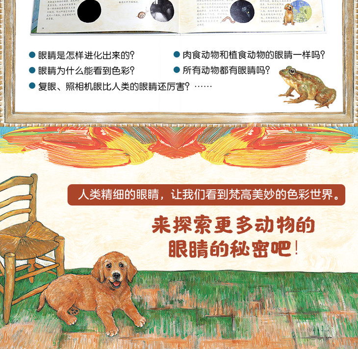 动物眼睛都不一样,它们看到的世界也完全不一样。 本书是关于动物眼睛的科普绘本,虽是小题材,但设计特别,编排巧妙、将艺术名画完美融入科学知识里,每一页都充满惊喜,满足孩子好奇心,颠覆想象力和认知,让孩子了解动物眼睛的奥秘,同时欣赏一场意想不到的“房间里的梵高画展”。