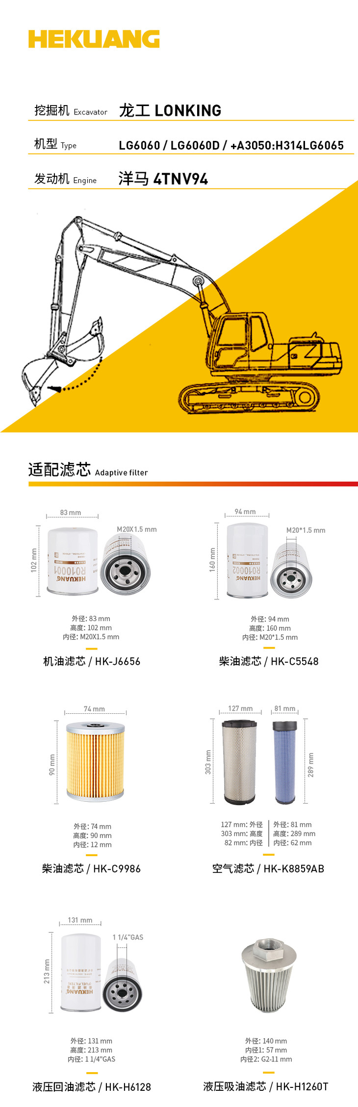 龙工LG6060/6060D/LG6065(洋马4TNV94)挖掘机滤芯 机油柴油空气滤芯 液压油先导滤芯