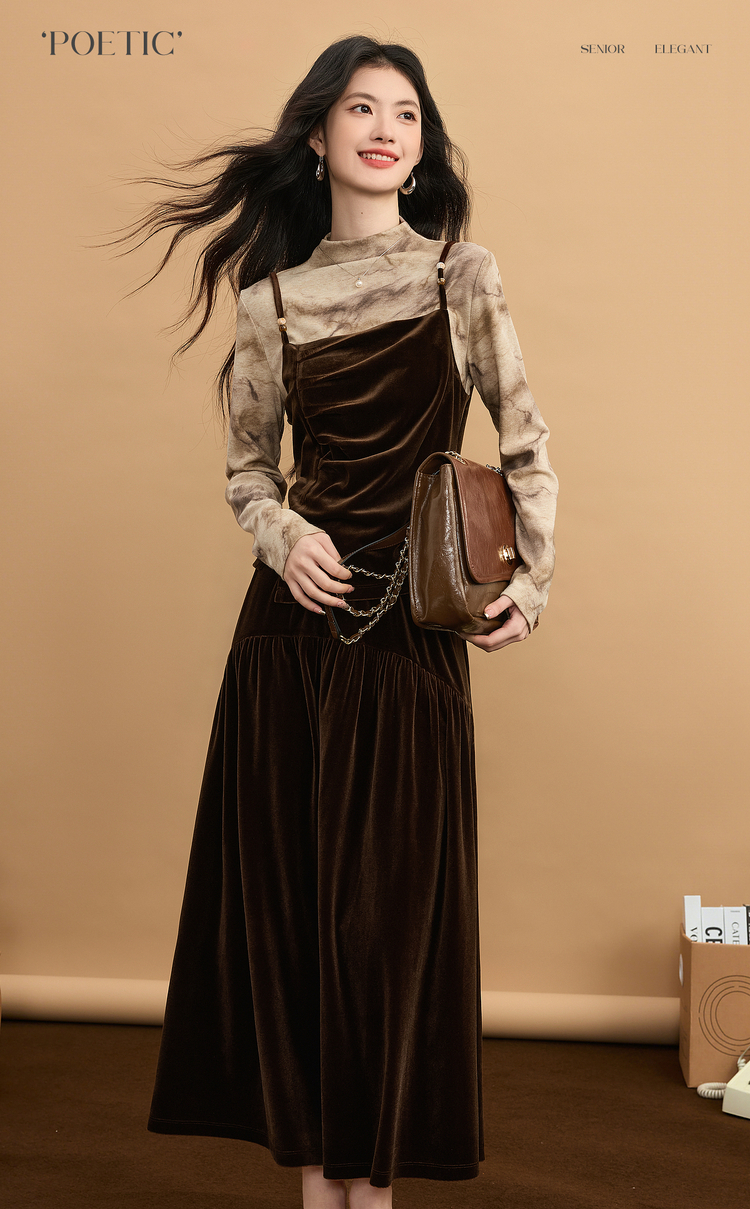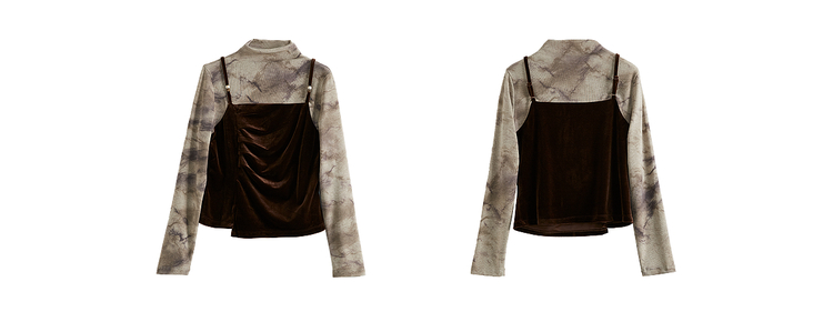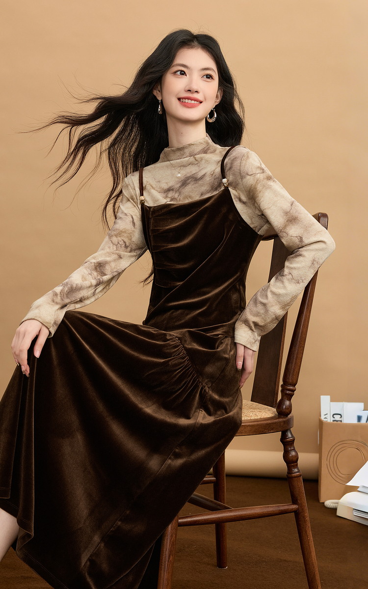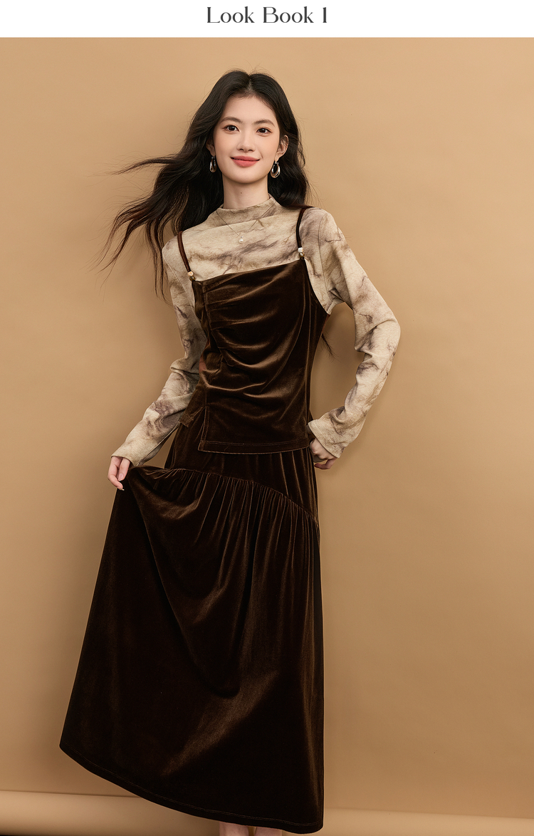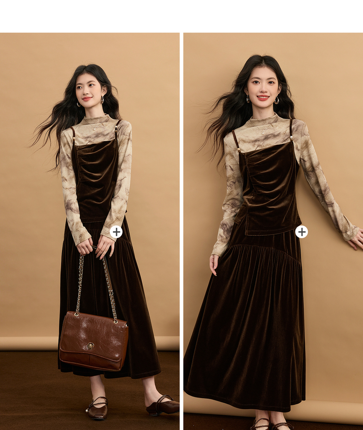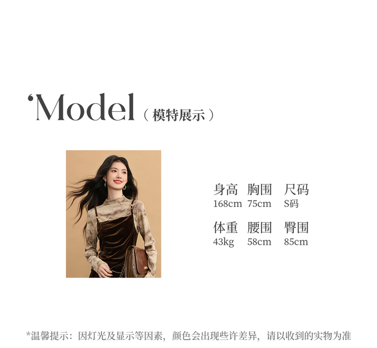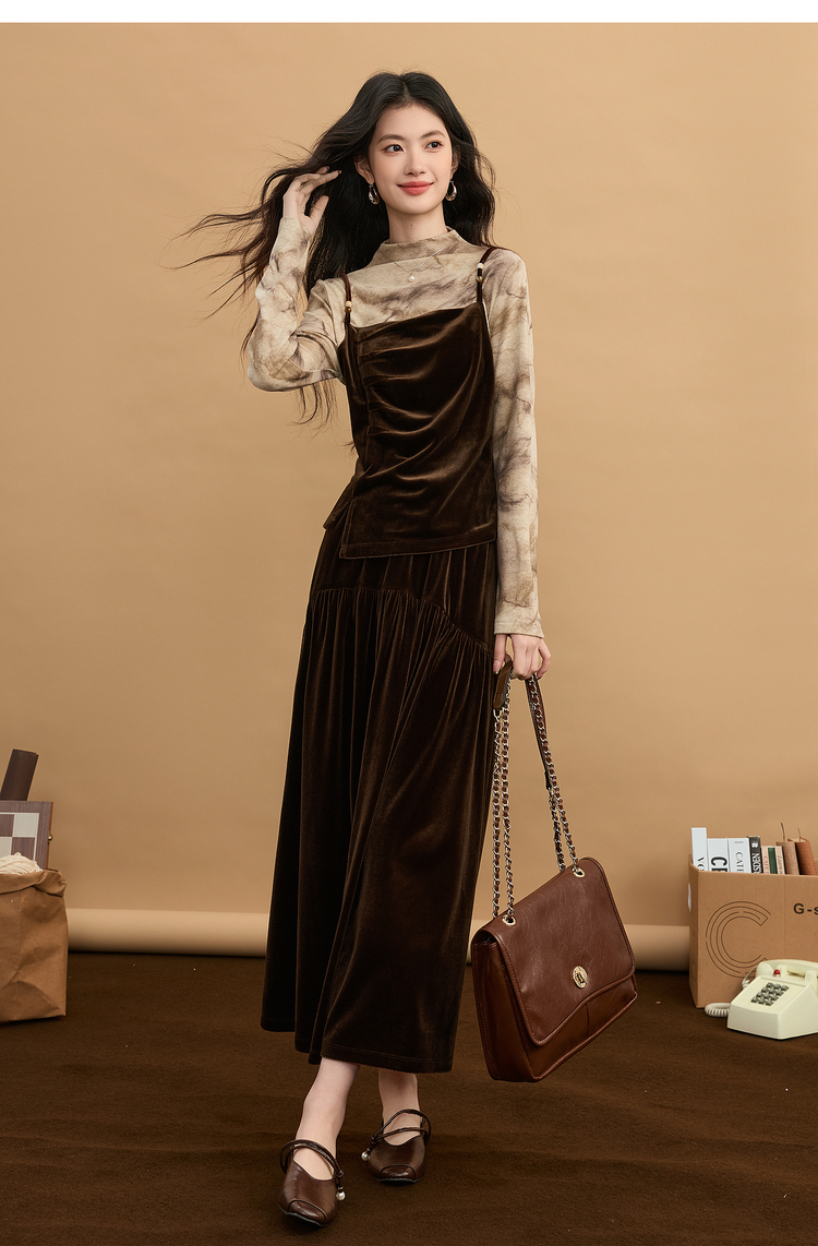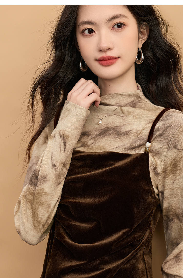【12/03新品】熙世界琥珀流光风套装女冬季复古扎染打底衫丝绒吊带连衣裙两件套