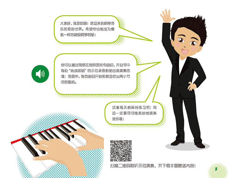 特别值得一提的是,书中每单元都有一个“挑战郎朗”的环节,其中的曲目都是郎朗在英国皇家音乐学院录制的,小琴童可以一试身手,用这些妙趣横生的曲目与大师过过招!