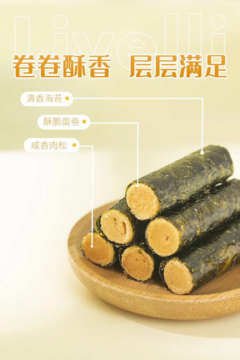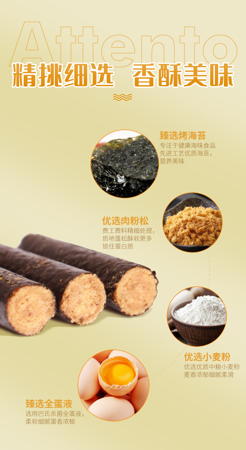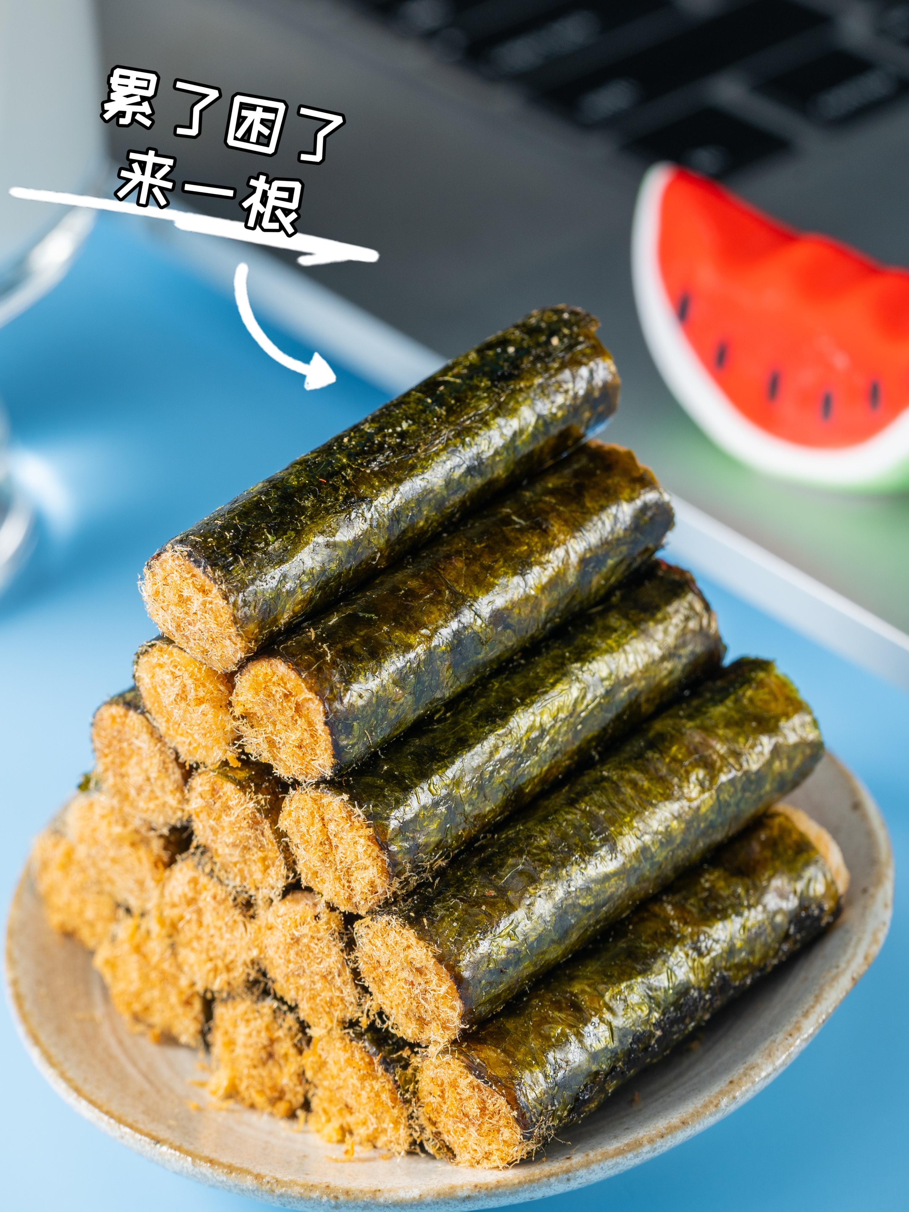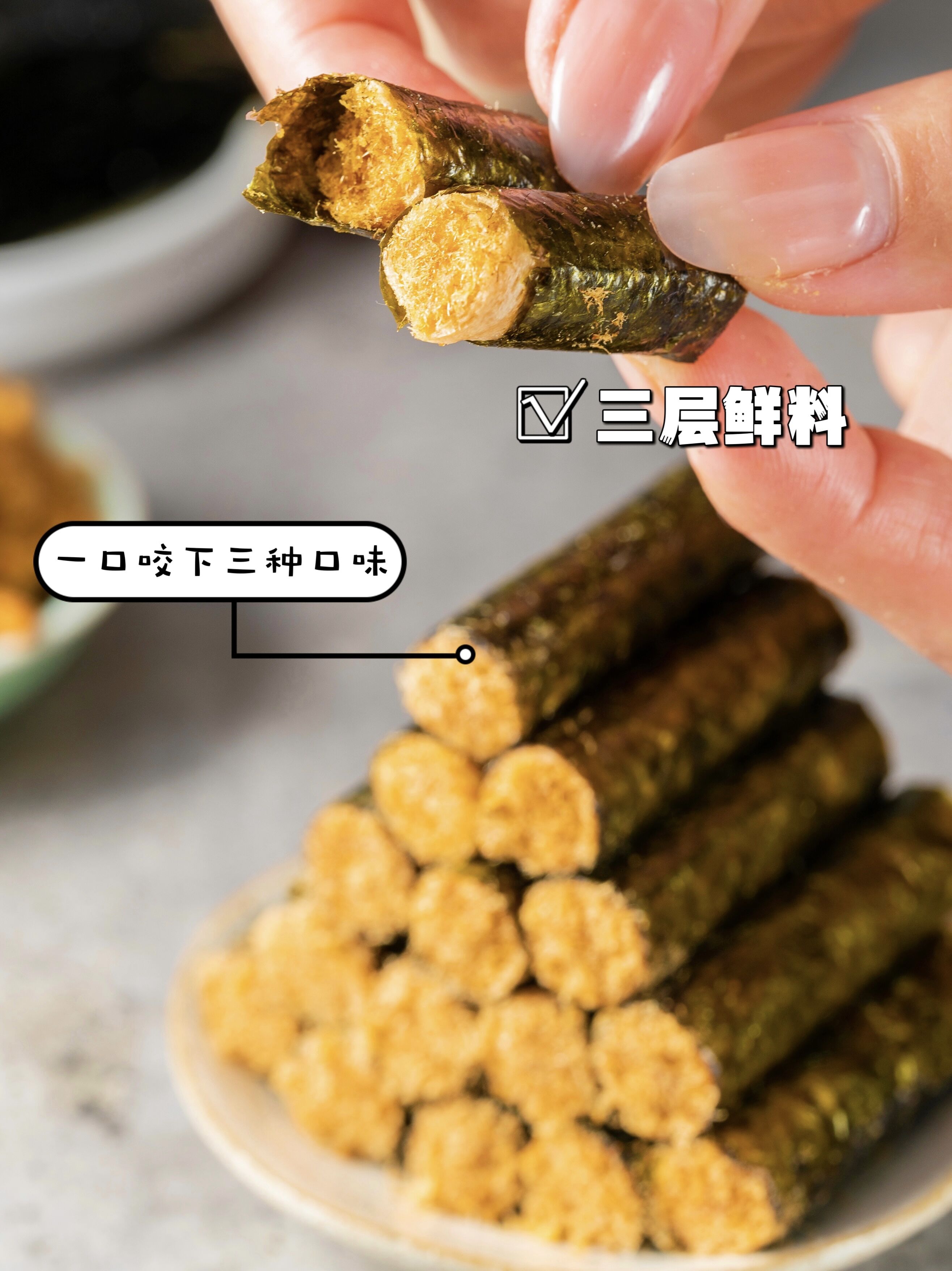 鲜脆的海苔包裹着绵软的蛋卷,蛋卷又包裹着咸香的肉松