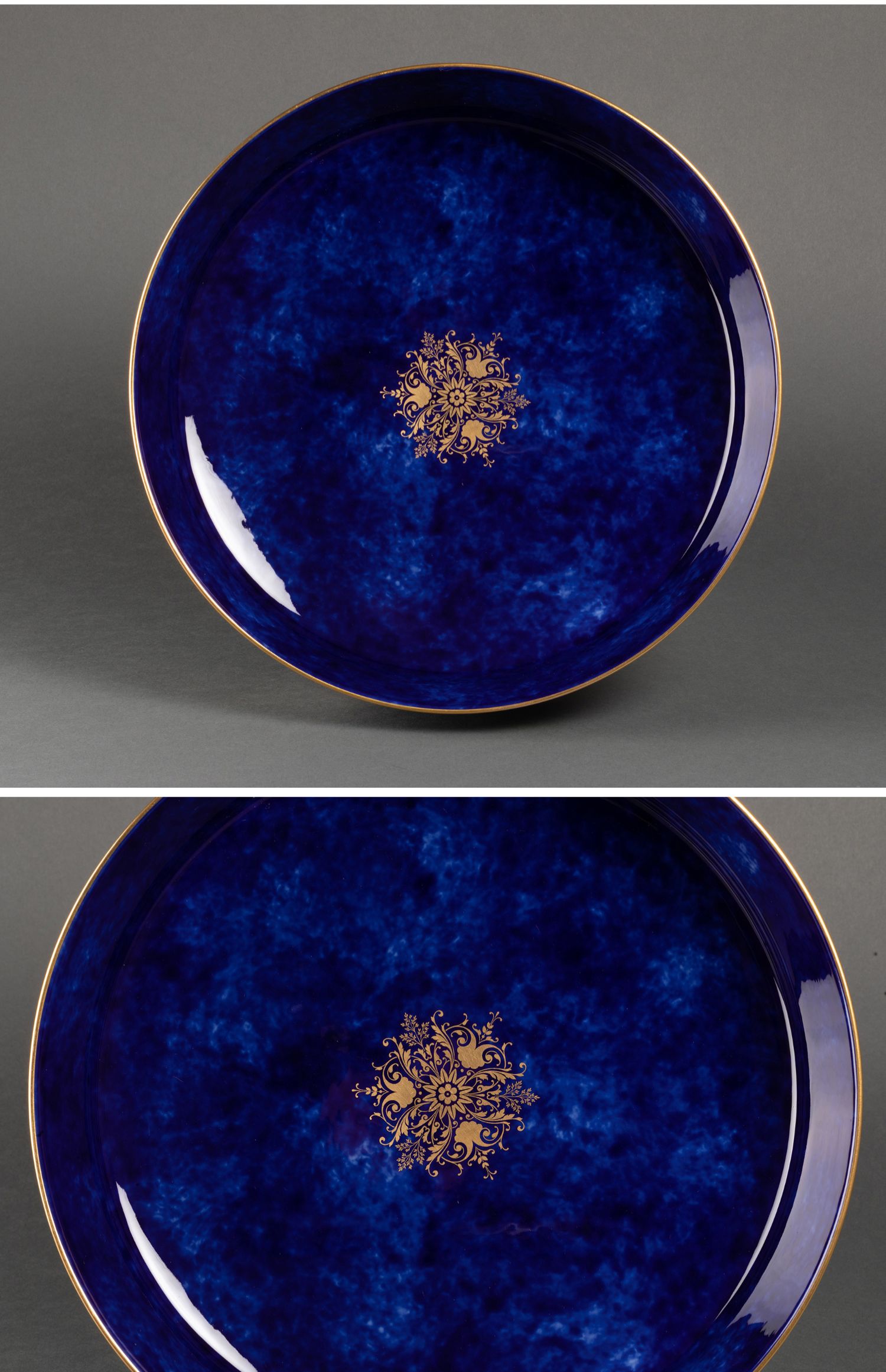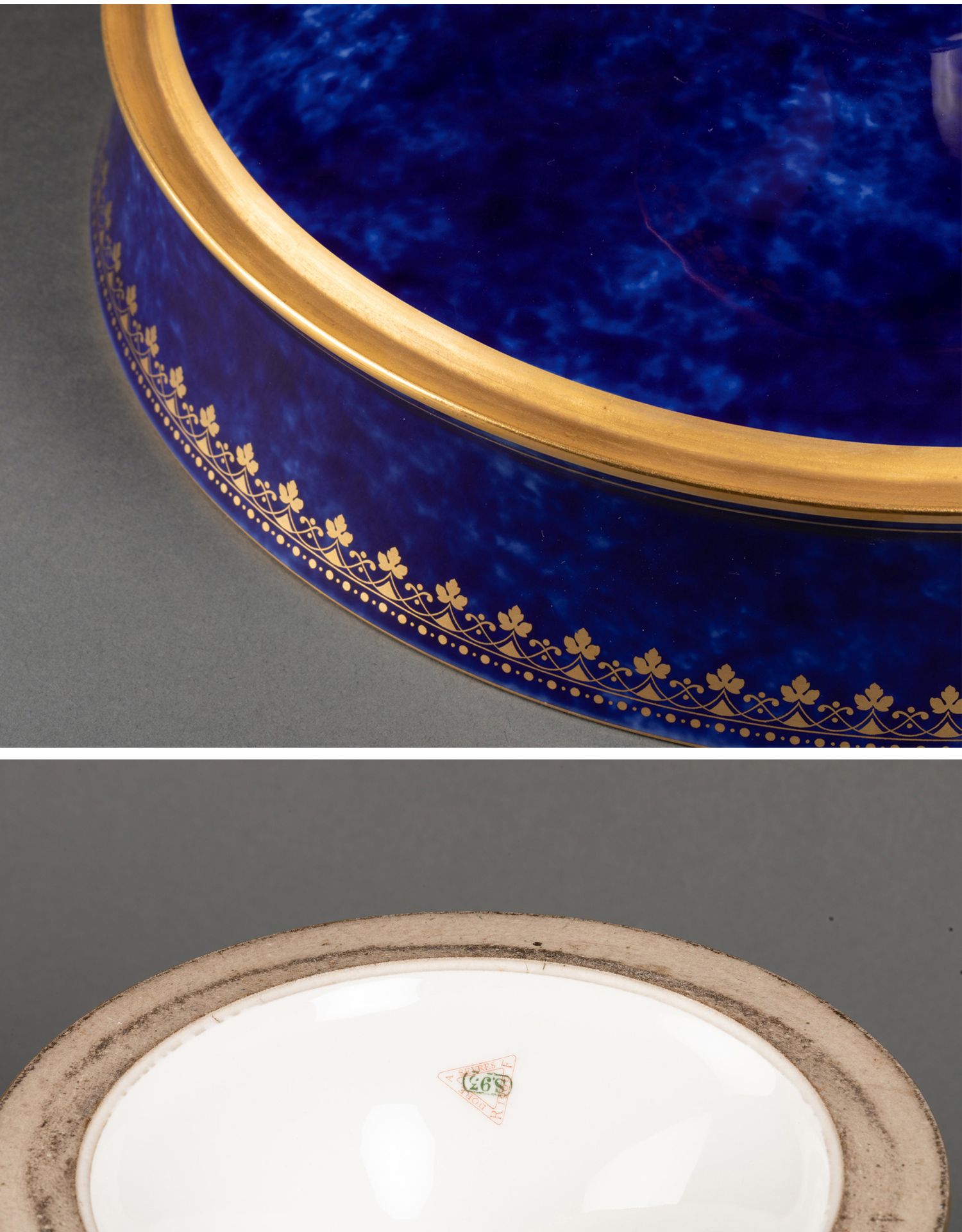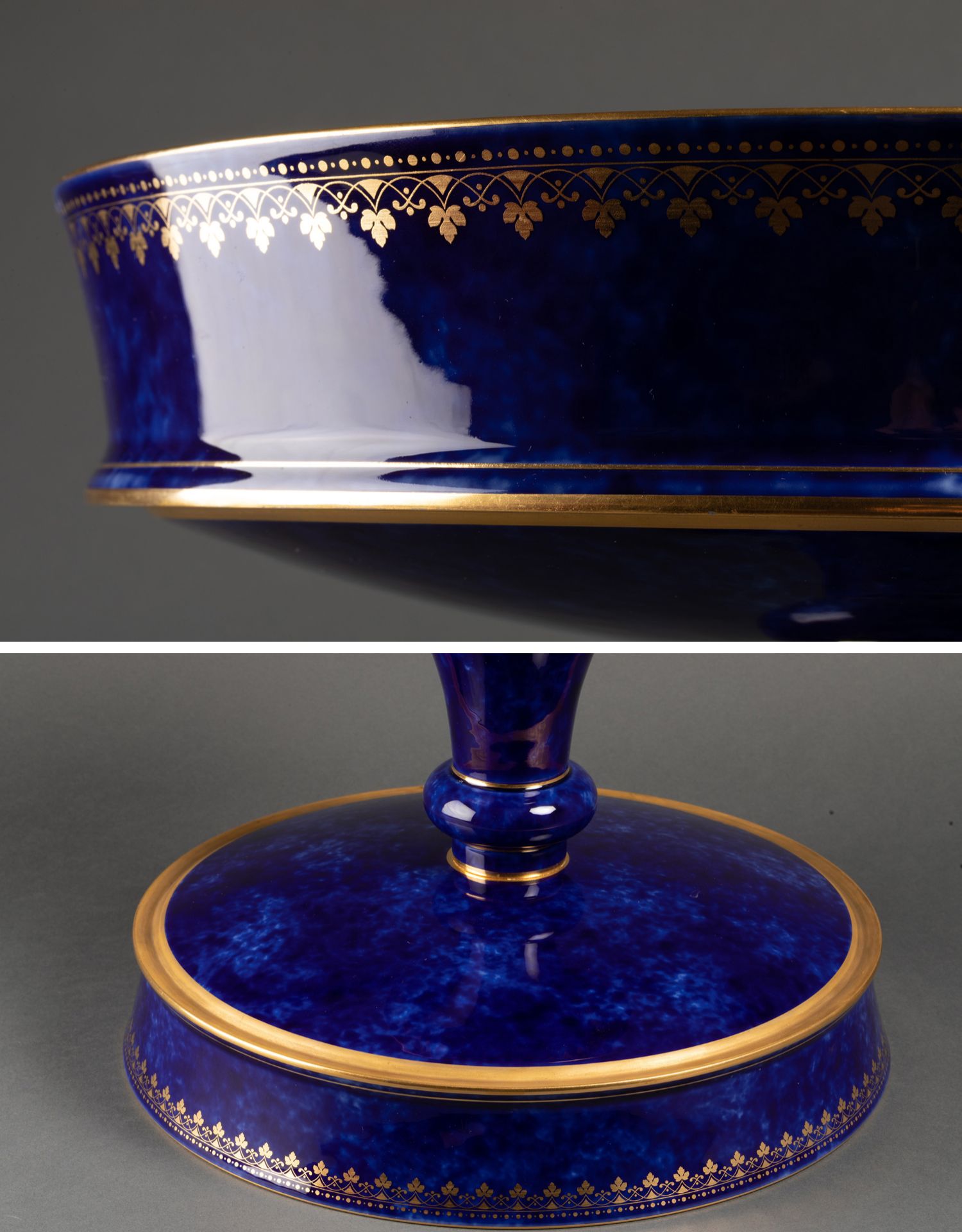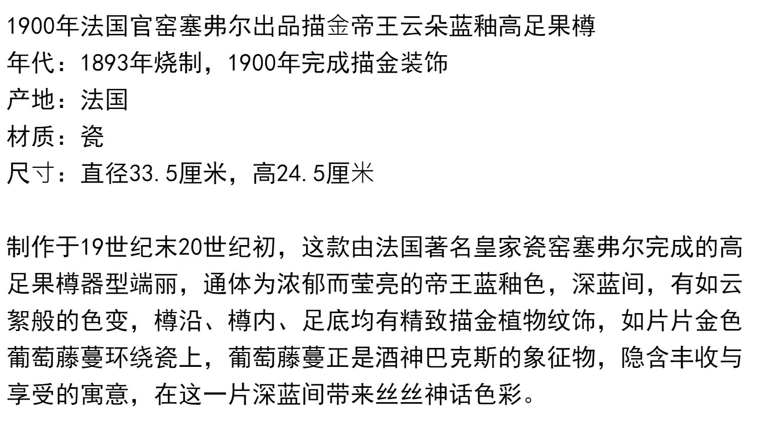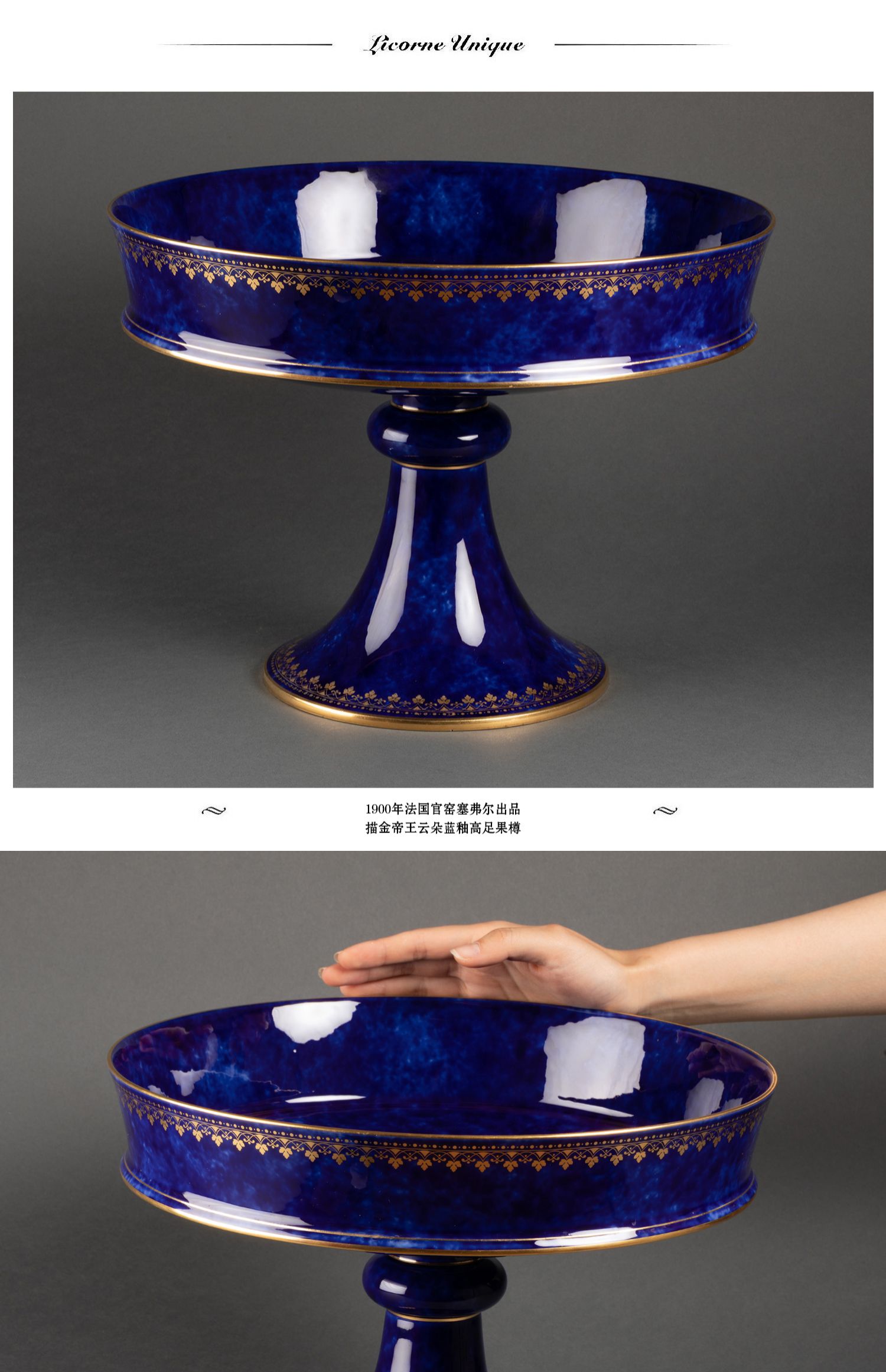 独角鹿西洋古董法国塞弗尔瓷器描⾦云朵帝王蓝釉高足果樽高足盘