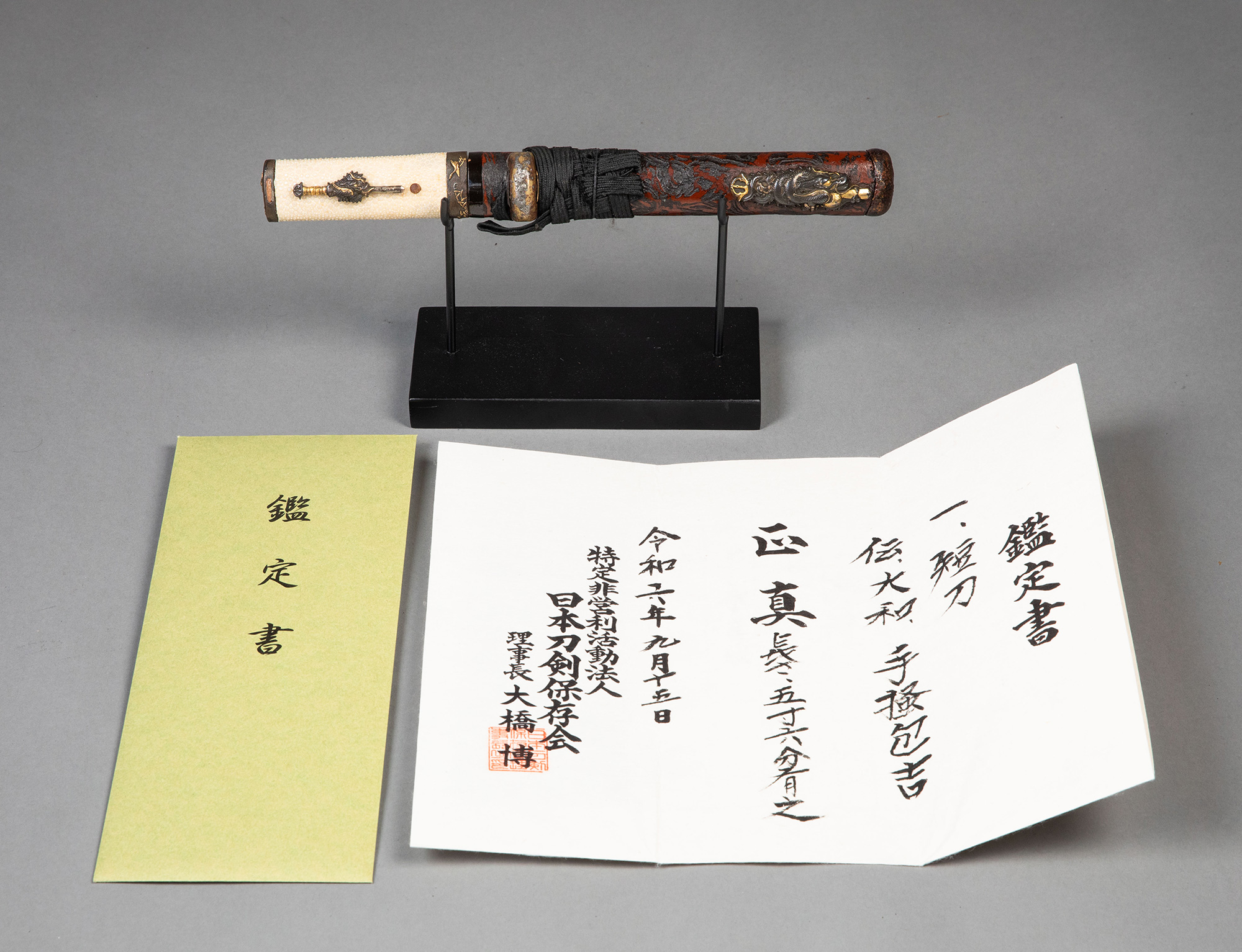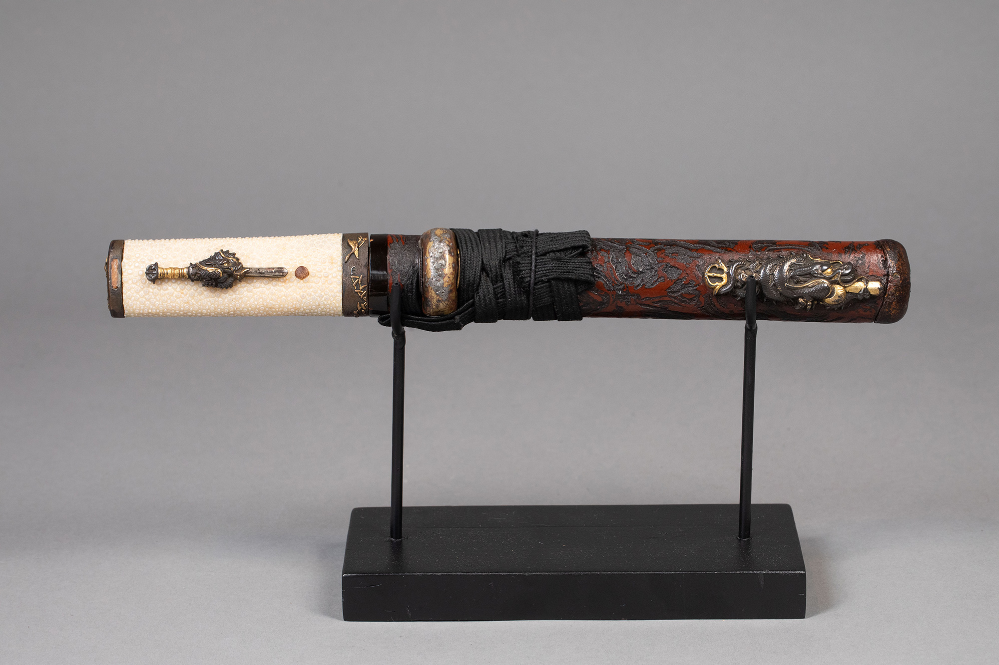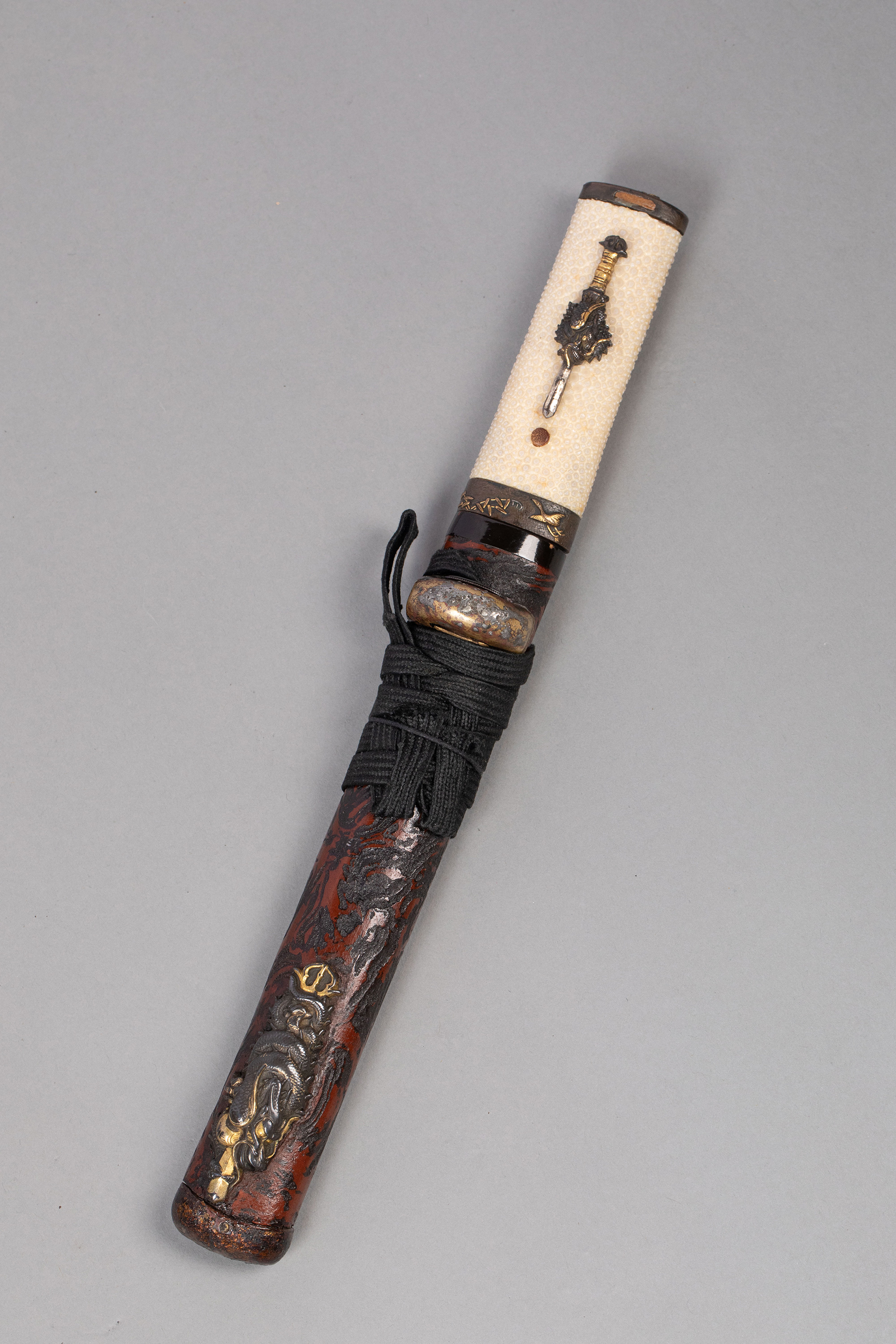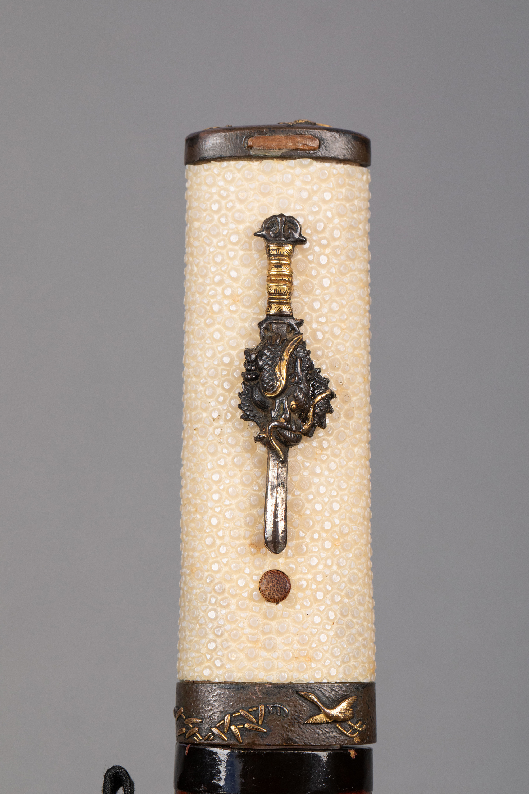 1504–1521年代日本室町末期永正年间手掻派包吉出品瑞龙主题铜鎏金银精雕装饰树纹漆木刀鞘及鲛皮手柄短刀