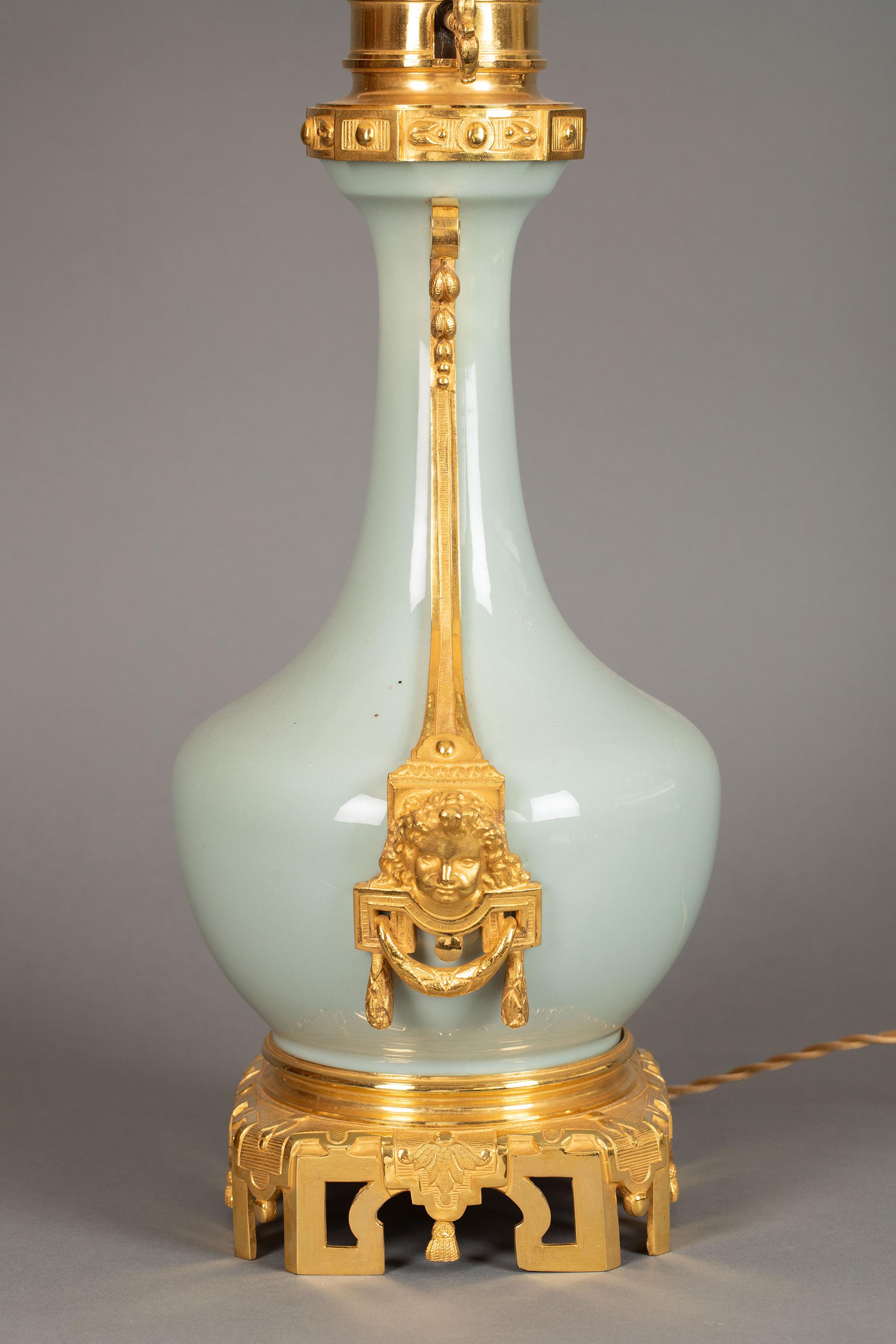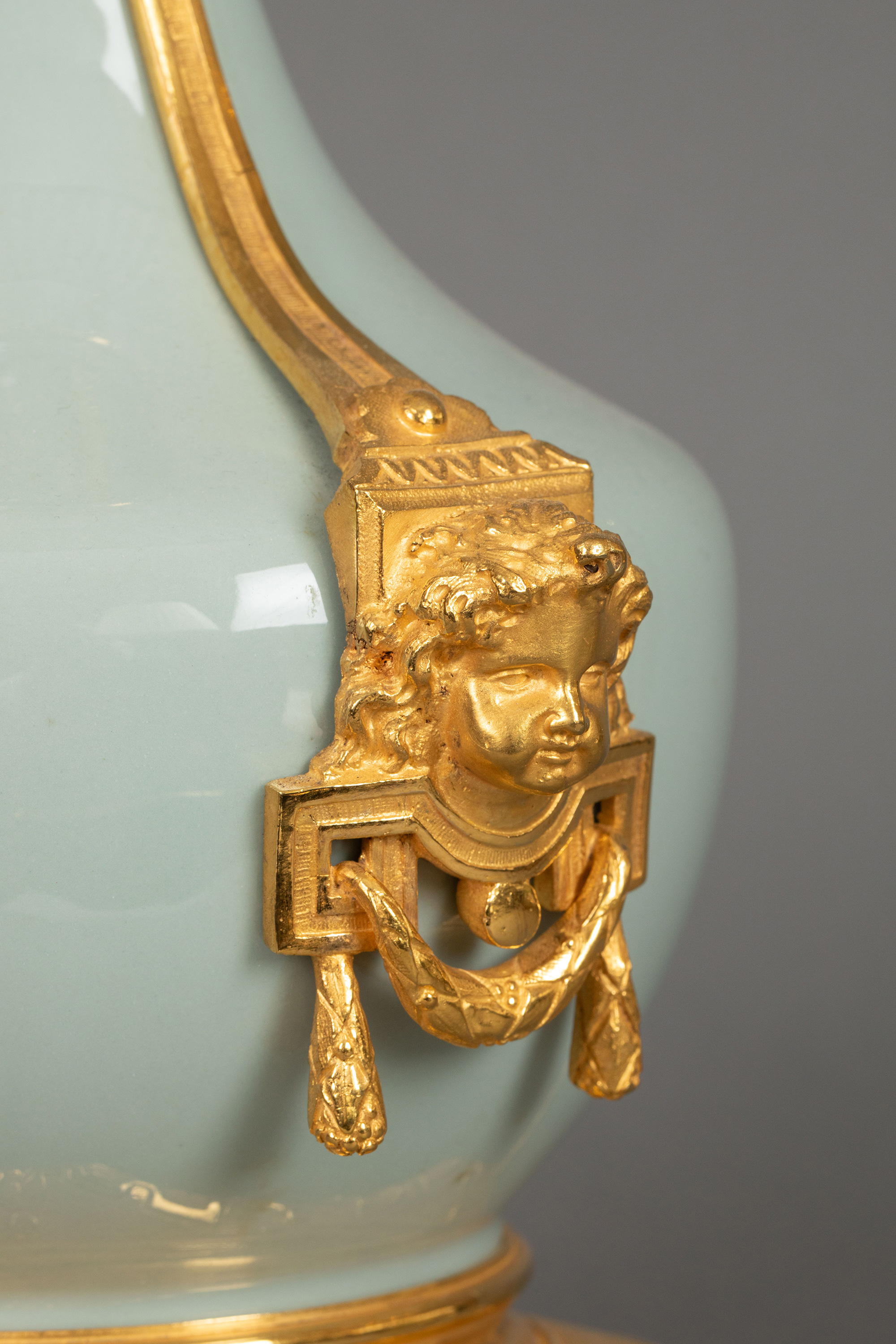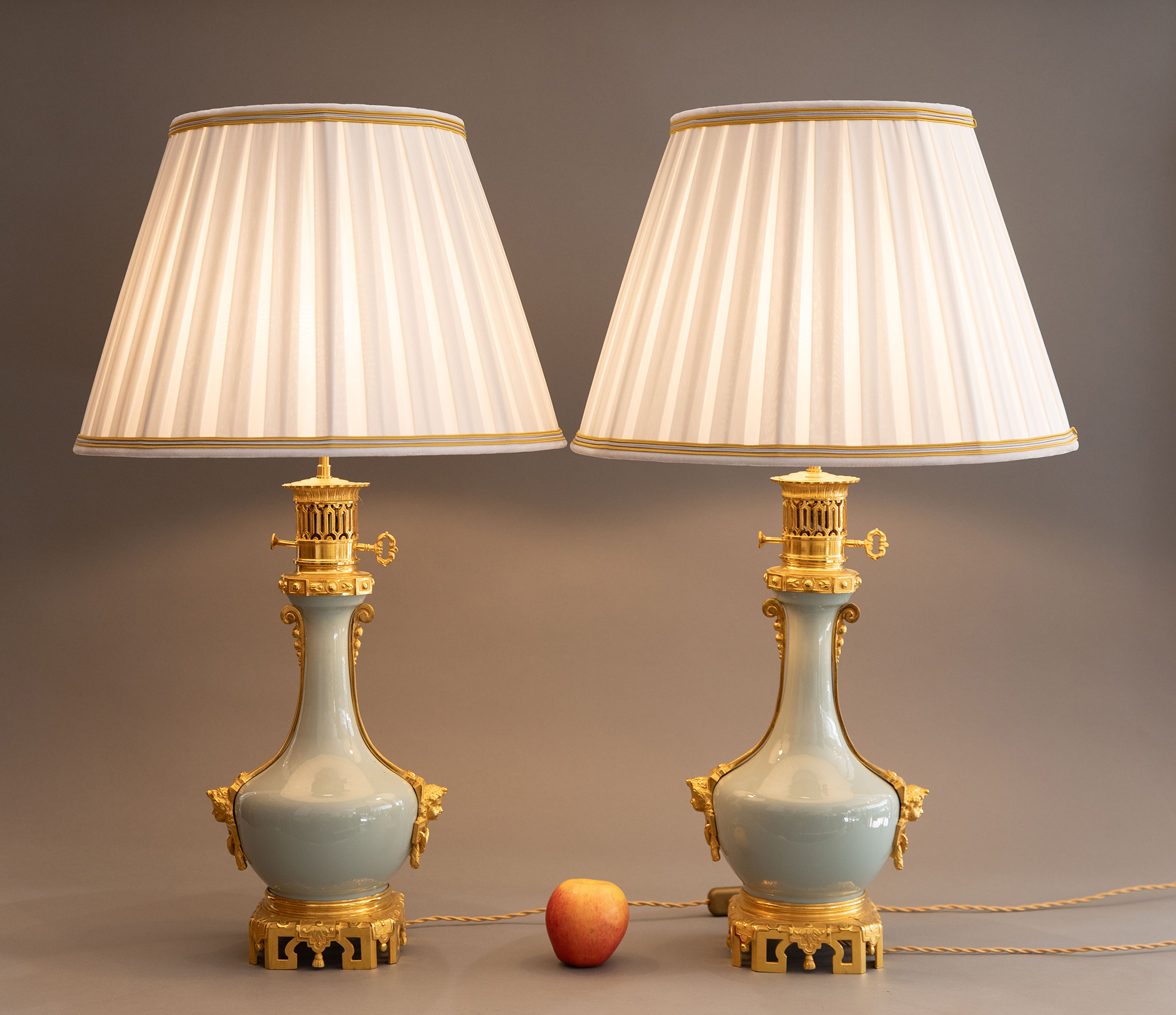 19世纪法国出品铜鎏金精雕底座嵌自然花环主题豆青釉瓷瓶装饰布面百褶灯罩台灯一对