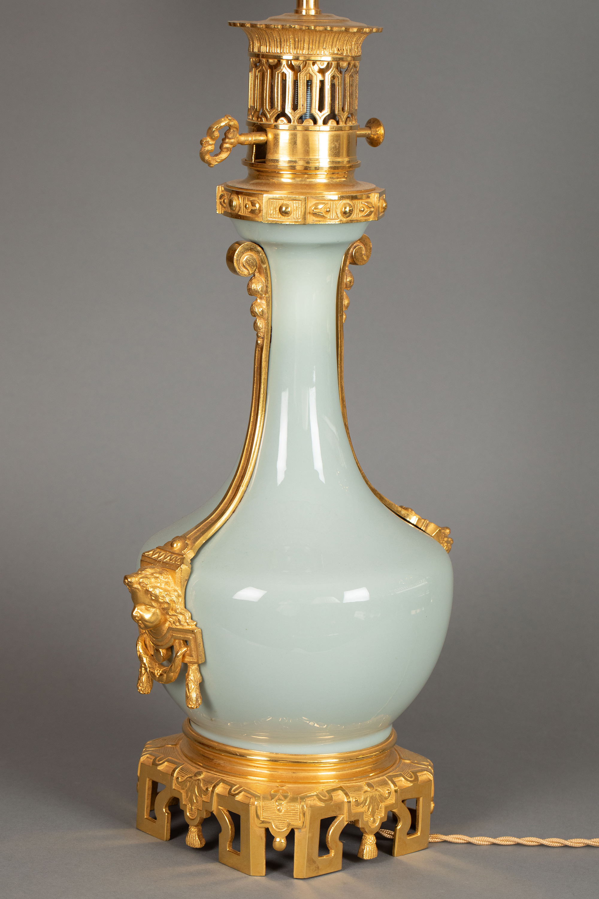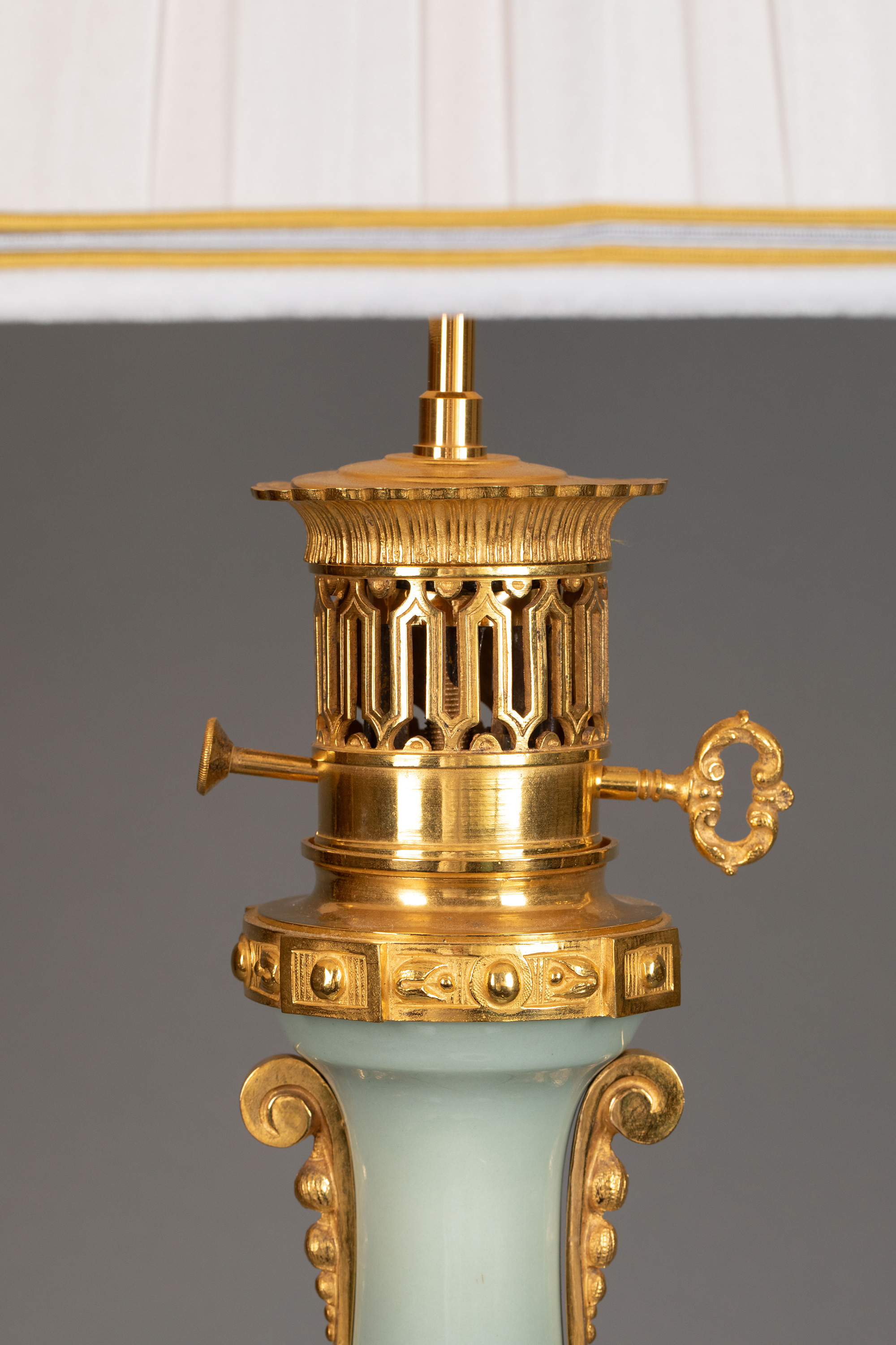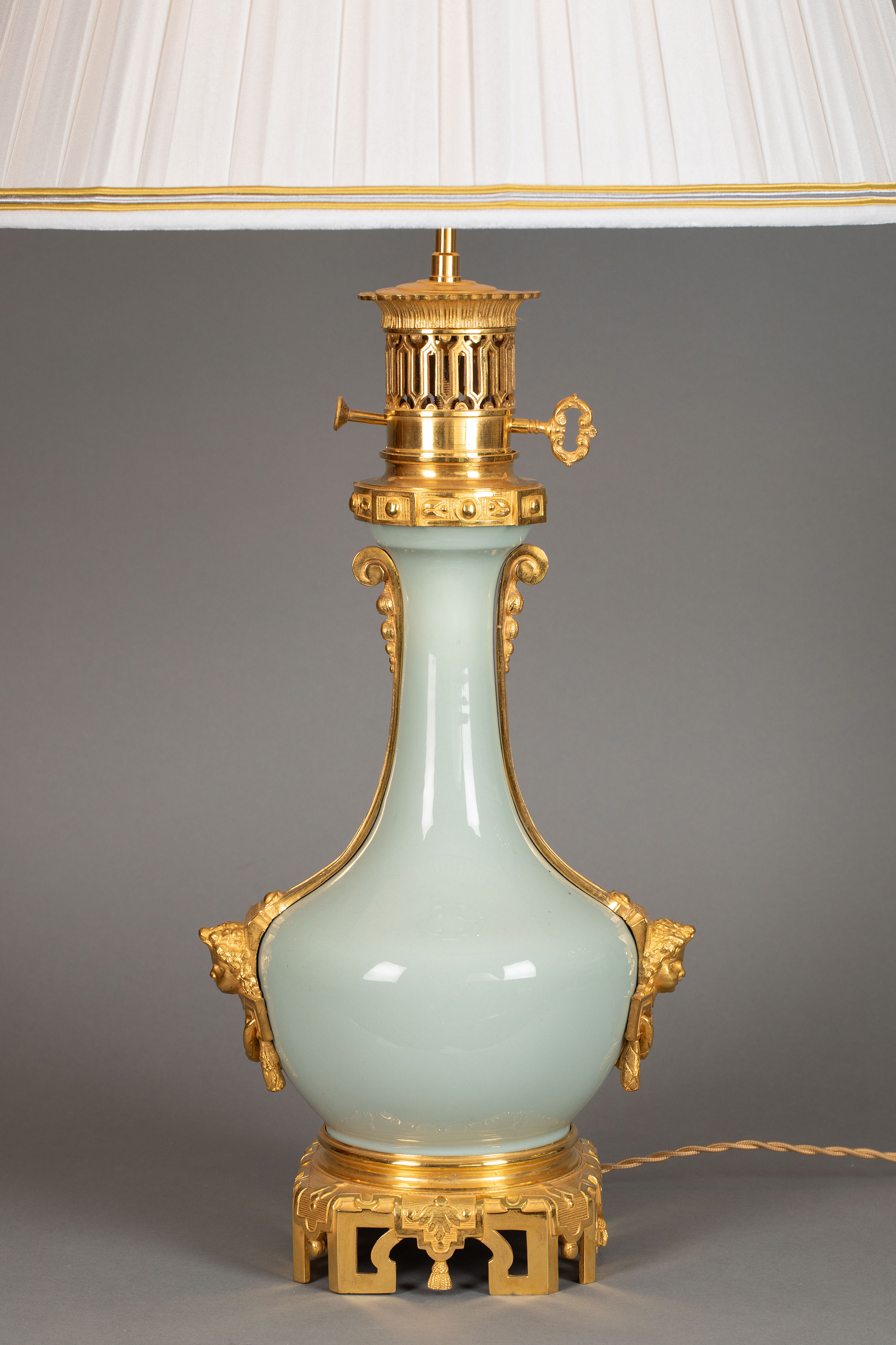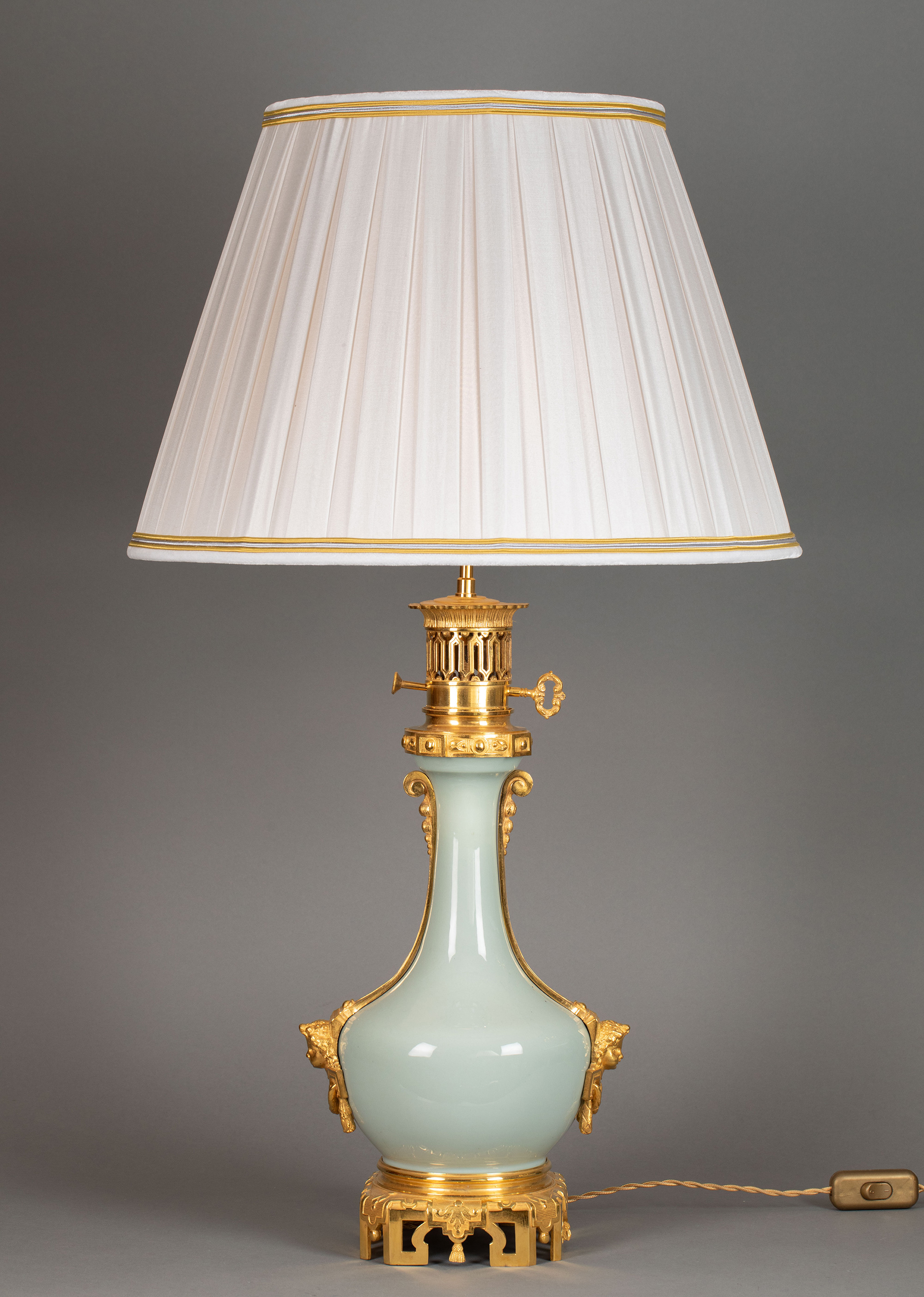 19世纪法国出品铜鎏金精雕底座嵌自然花环主题豆青釉瓷瓶装饰布面百褶灯罩台灯一对