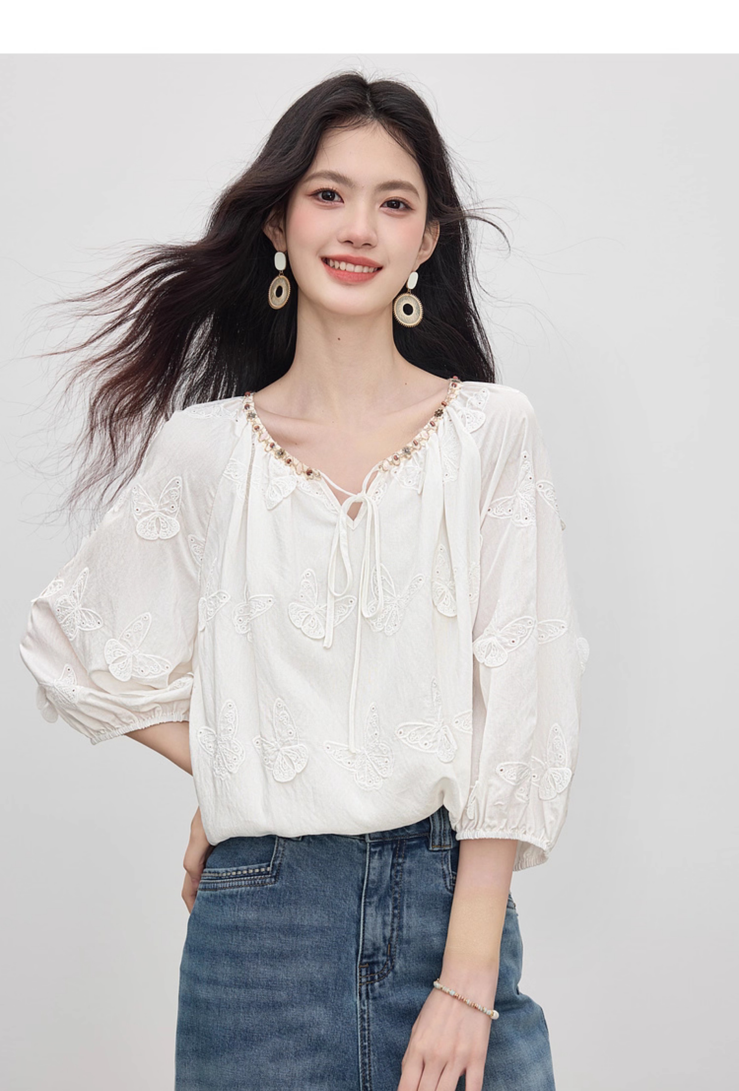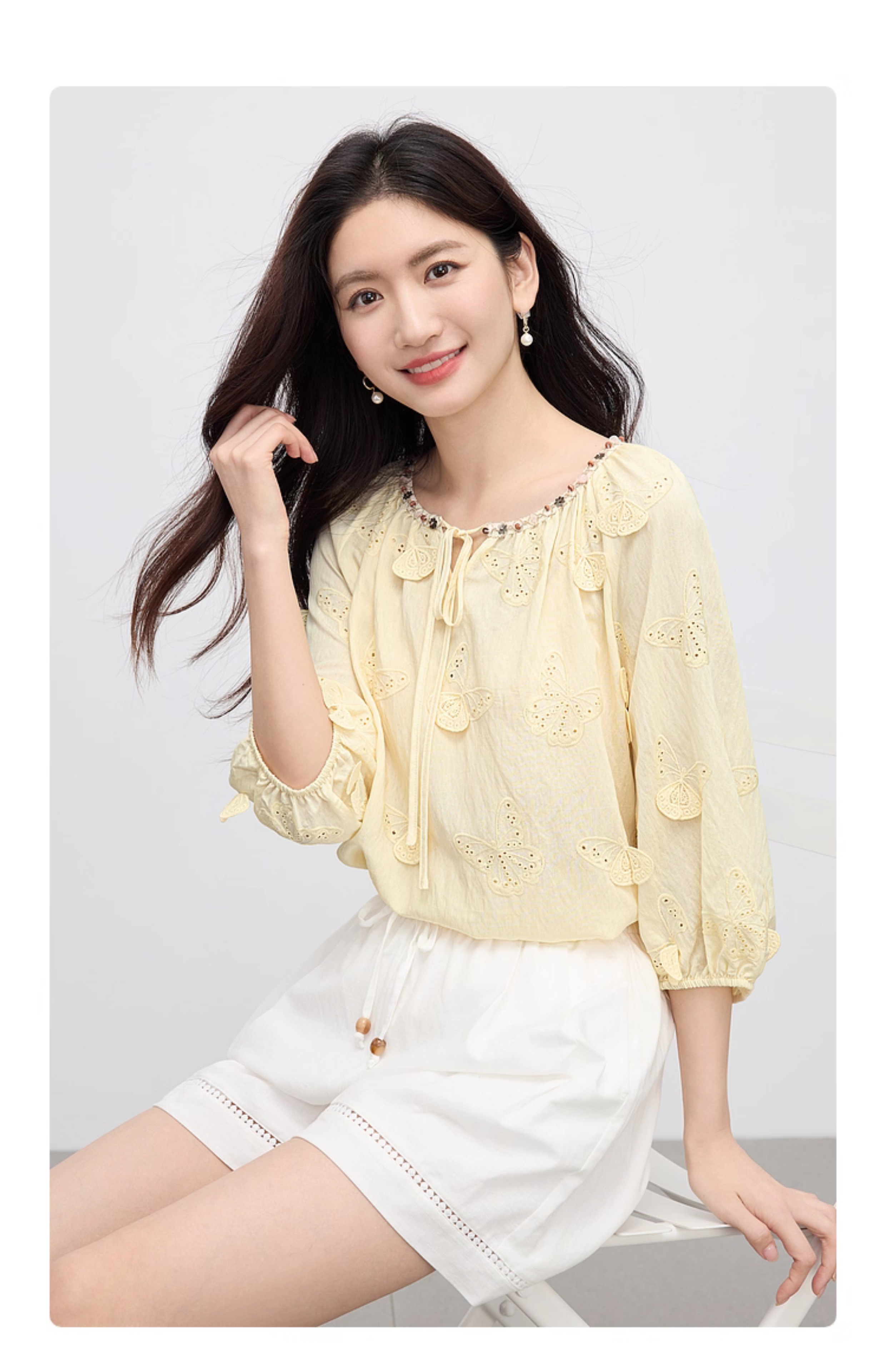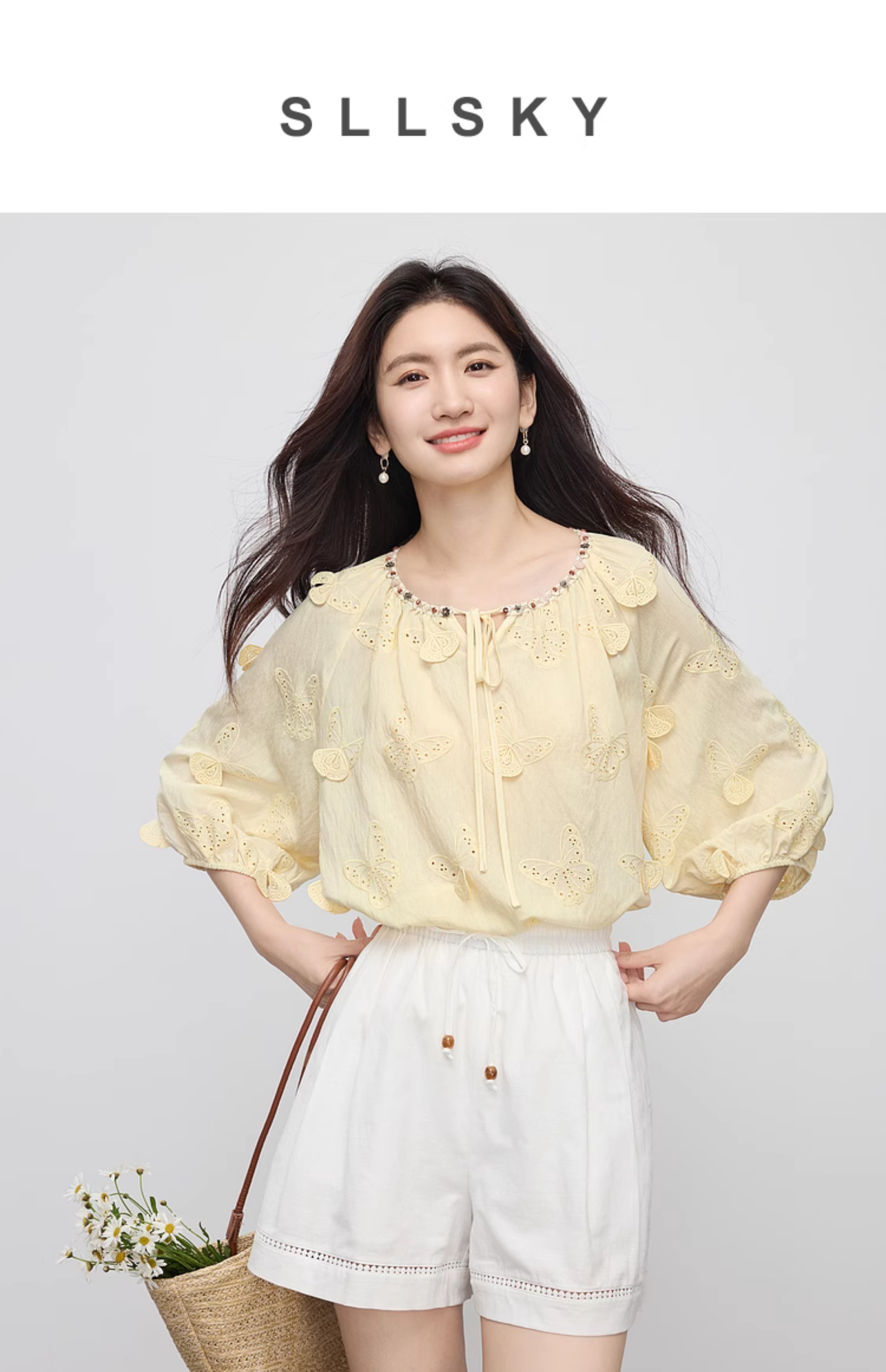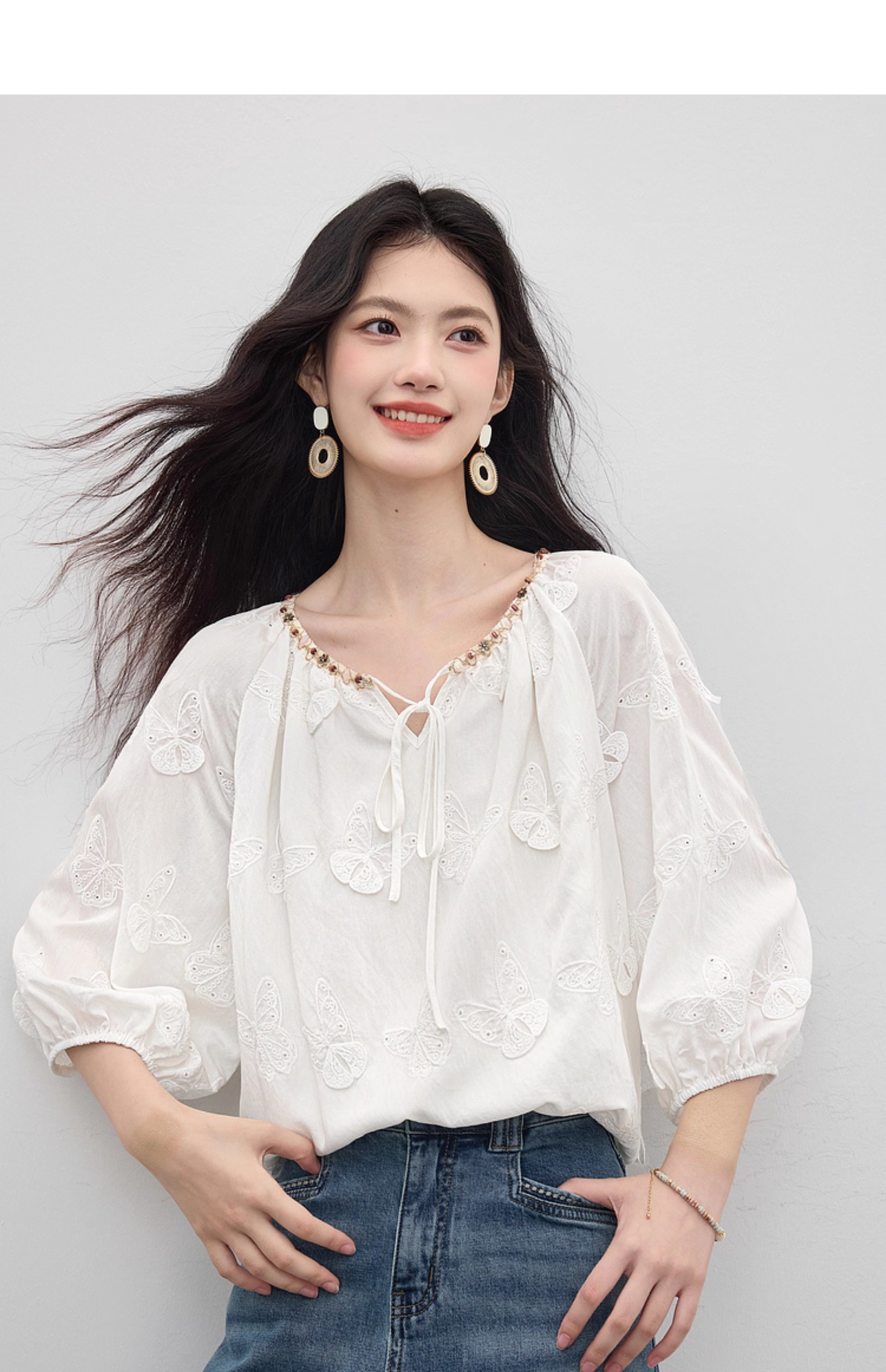 【08/06新品】熙世界轻民族风立体蝴蝶刺绣衬衫女2025初秋新款设计感七分袖上衣