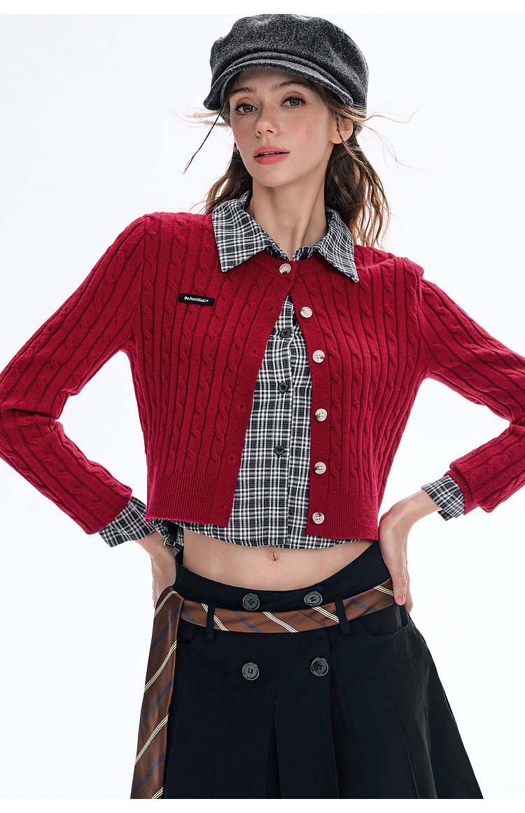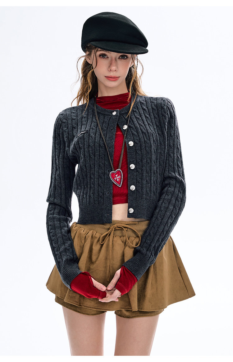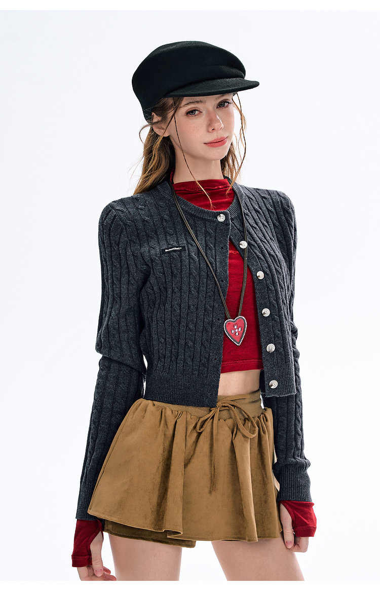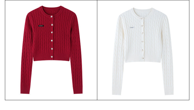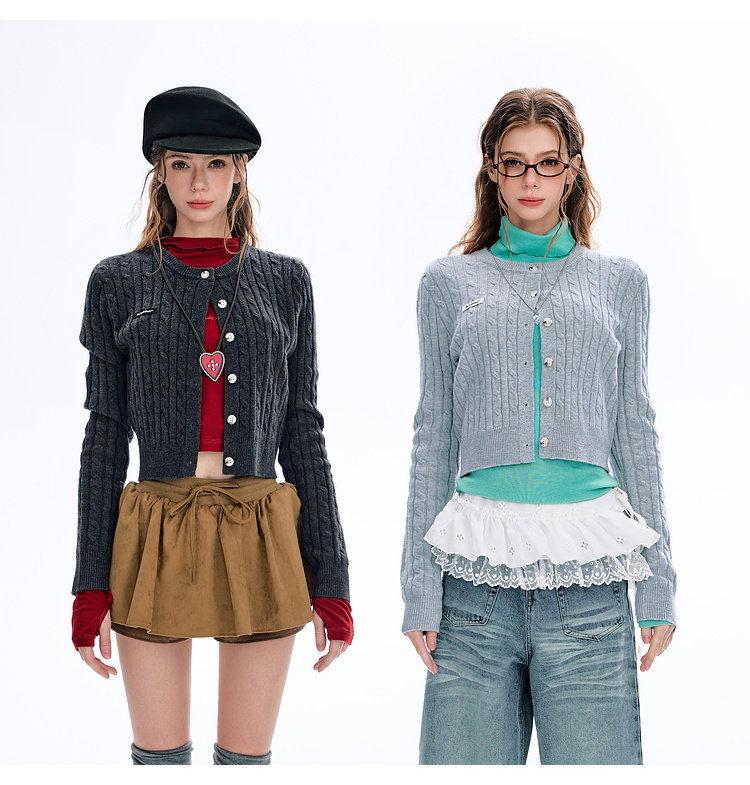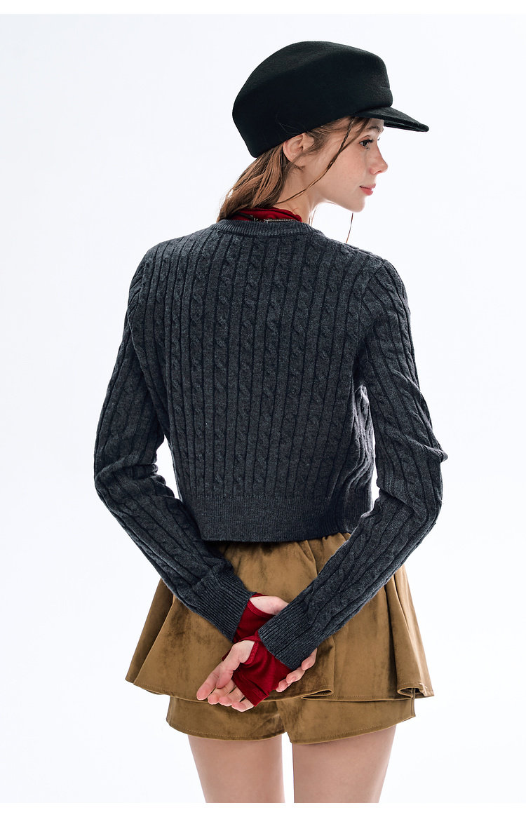BJHG不计后果圆领针织开衫女春季修身设计感复古绞花短款毛衣外套