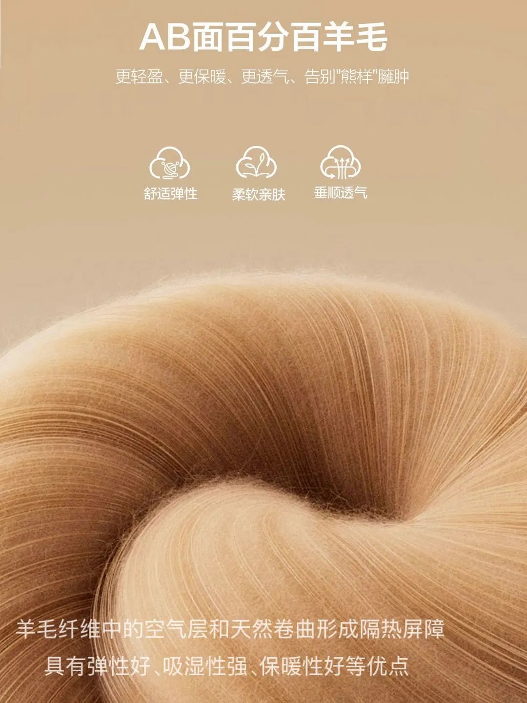 棉柔软糯的抓绒内里+ AB面100%绵羊毛填充,整件密实柔软,就像贴身小火炉,却一点也不会臃肿。