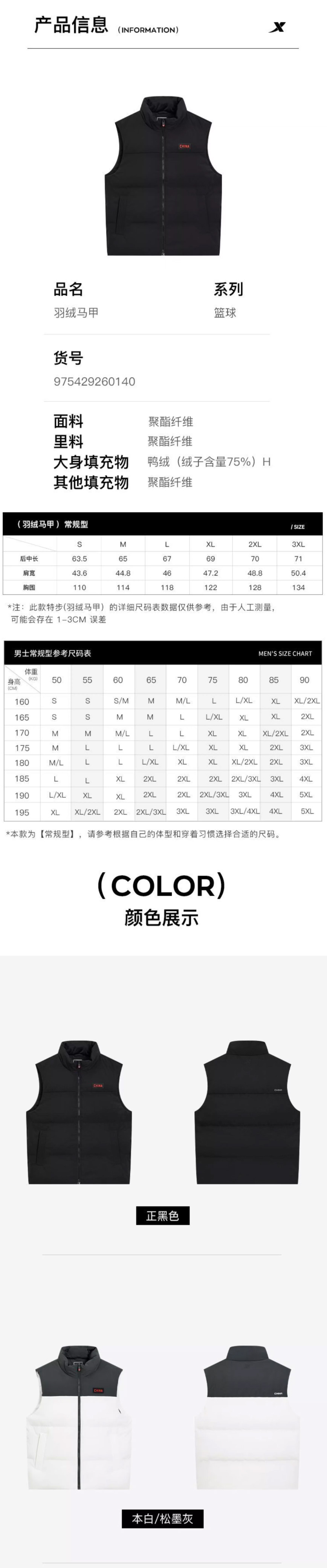 特步CHINA羽绒马甲男2025冬季新款保暖立领运动马甲975429260140