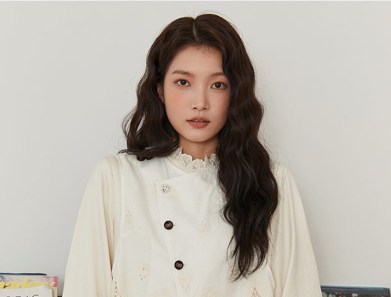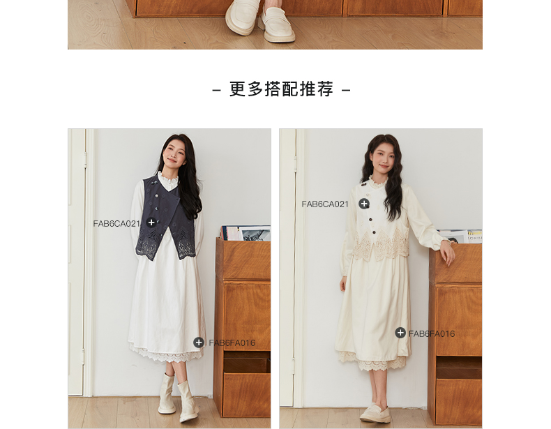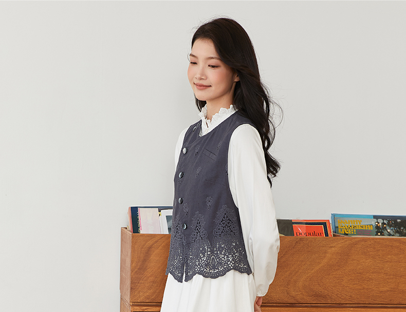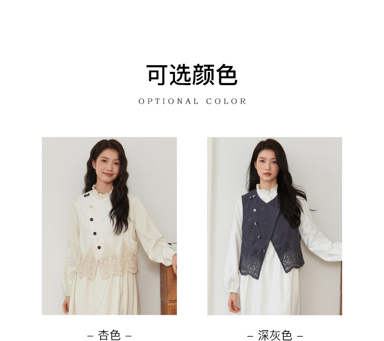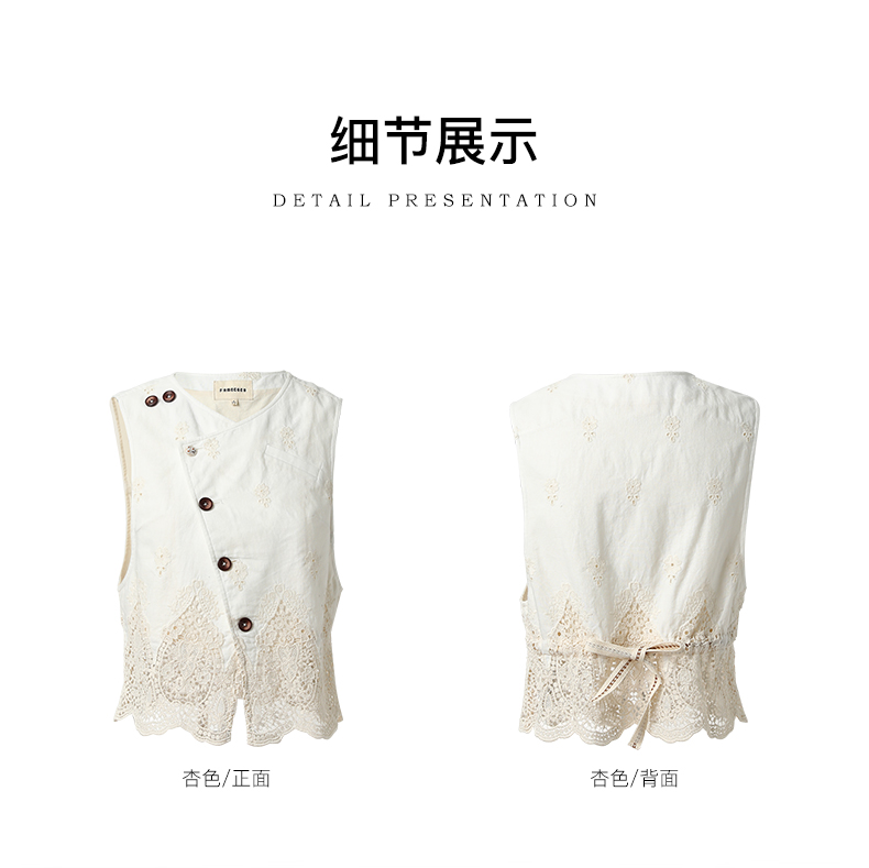 FAMECOCO范可儿马夹棉质镂空绣花无领外穿马甲斜襟系扣FAB6CA021