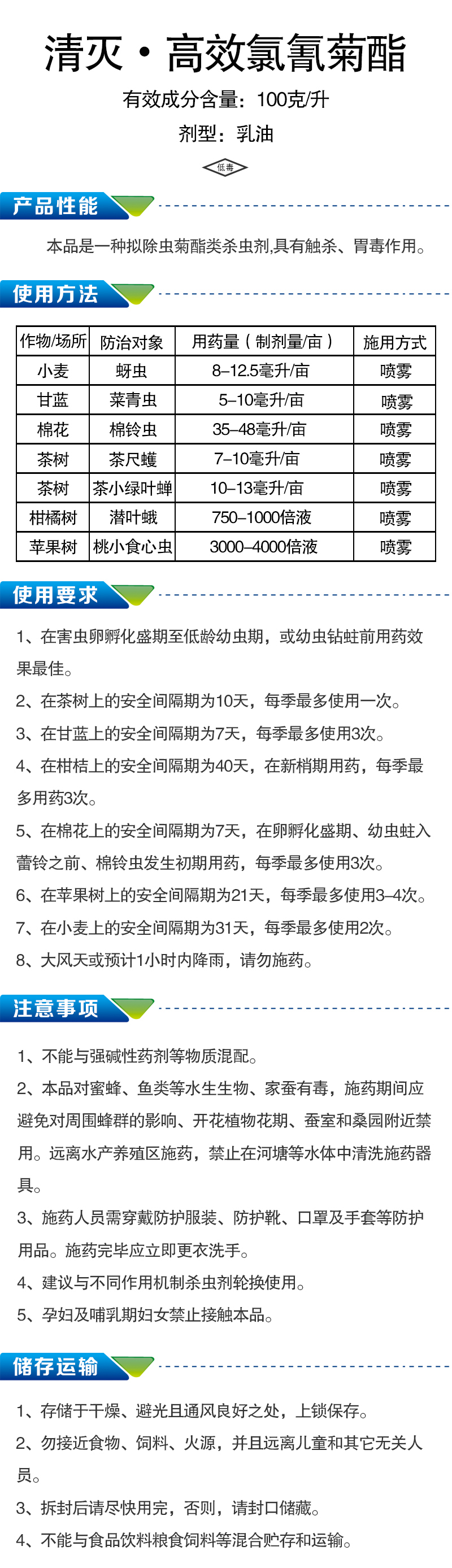 清灭 高效氯氰菊酯 对葡萄绿叶蝉、棉铃幼虫、金龟子、绿盲蝽都有良好防效。乳油剂型,影响果粉形成。