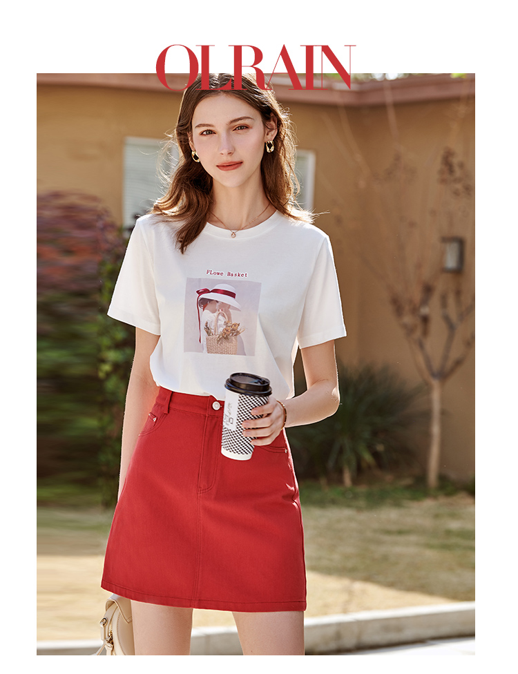 OLrain欧芮儿2025夏季新款休闲减龄短袖创意撞色印花短款T恤女